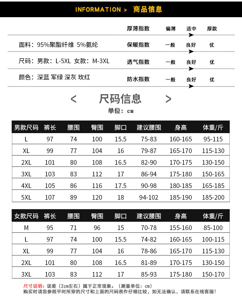 尺碼 男:L【100-115斤】,男:XL【115-130斤】,男:2XL【130-150斤】,男:3XL【150-165斤】,男:4XL【165-180斤】,男:5XL【180-200斤】,女M【85-100斤】,女L【100-115斤】,女XL【115-130斤】,女2XL【130-145斤】,女3XL【145-165斤】