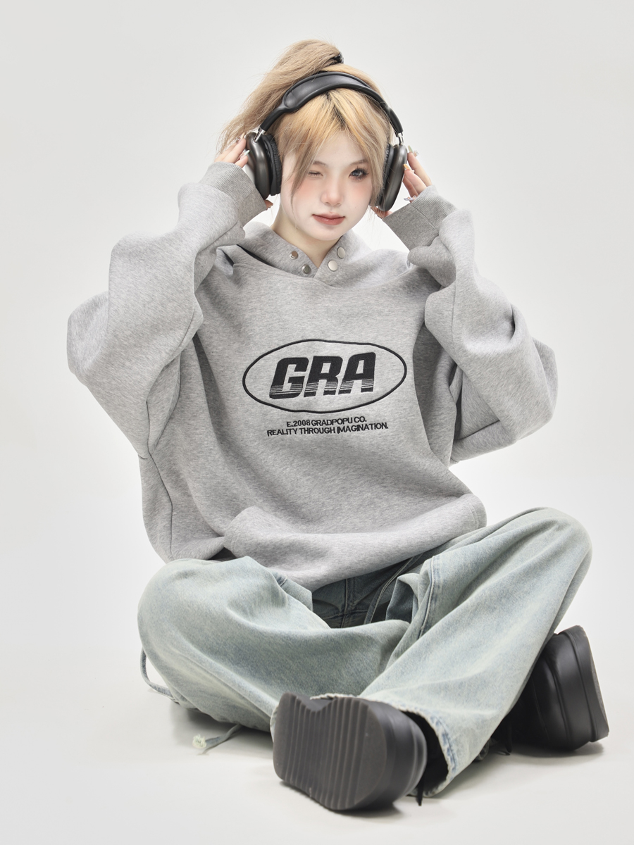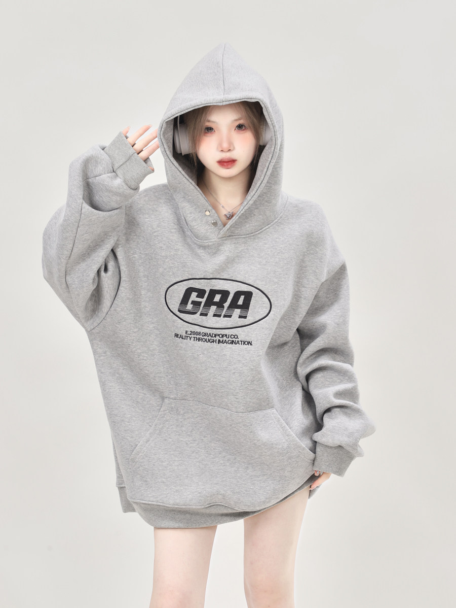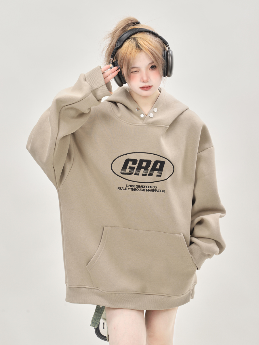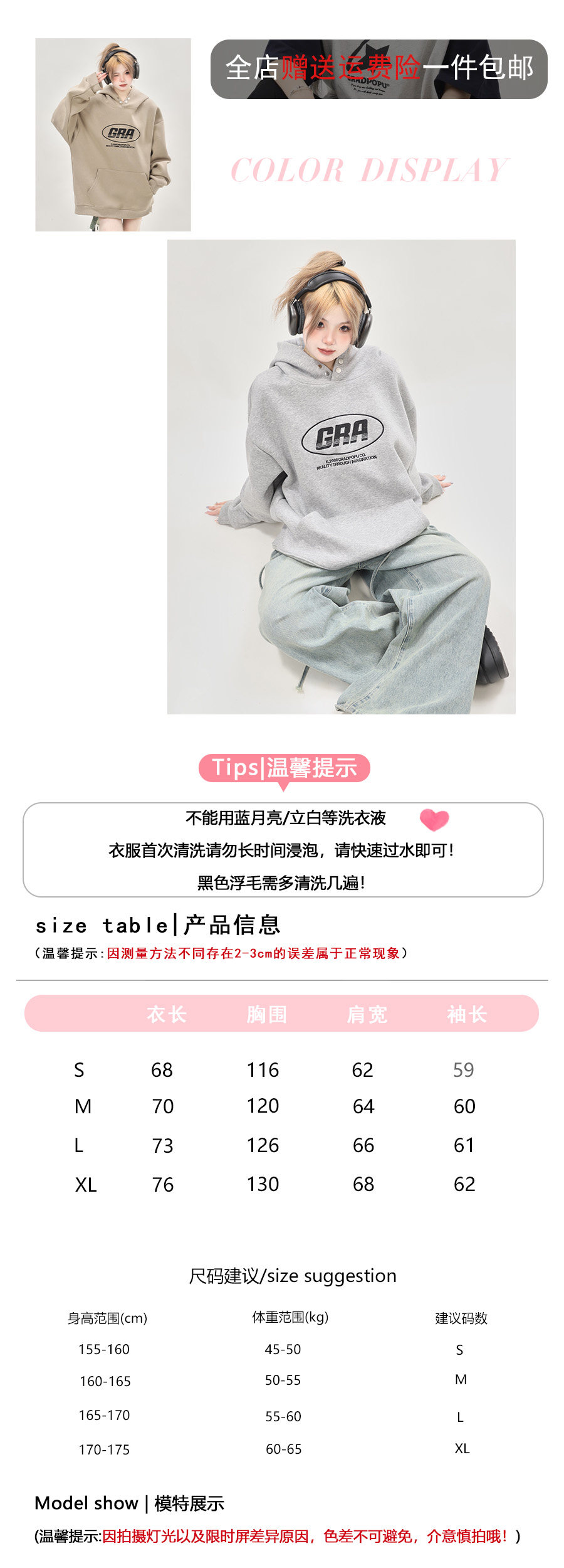 美式潮牌重磅oversize小眾設計感刺繡灰色厚棉T女春秋連帽外套上衣