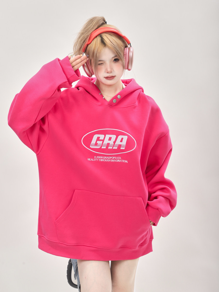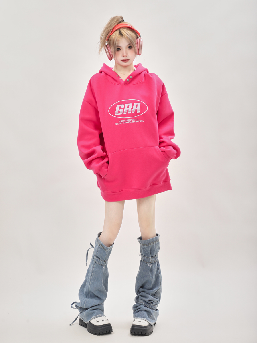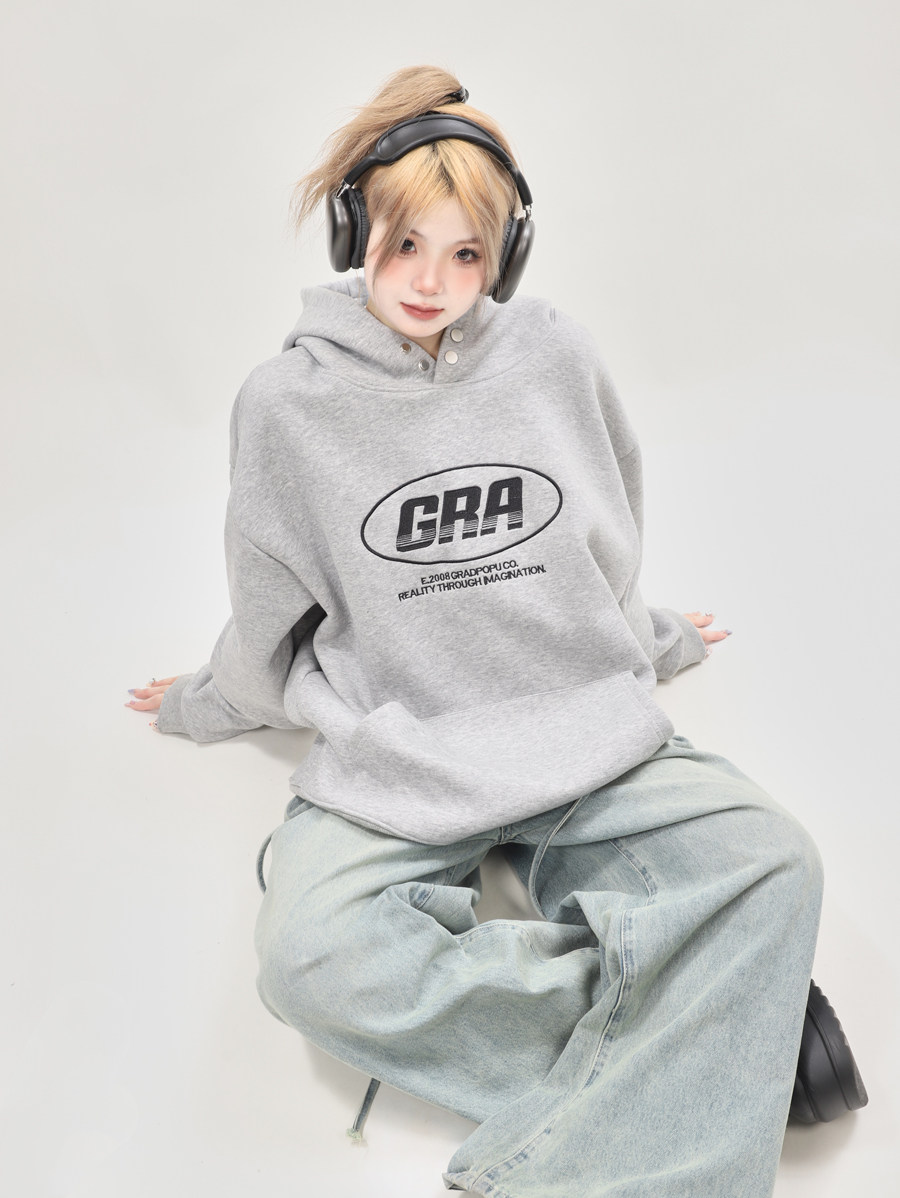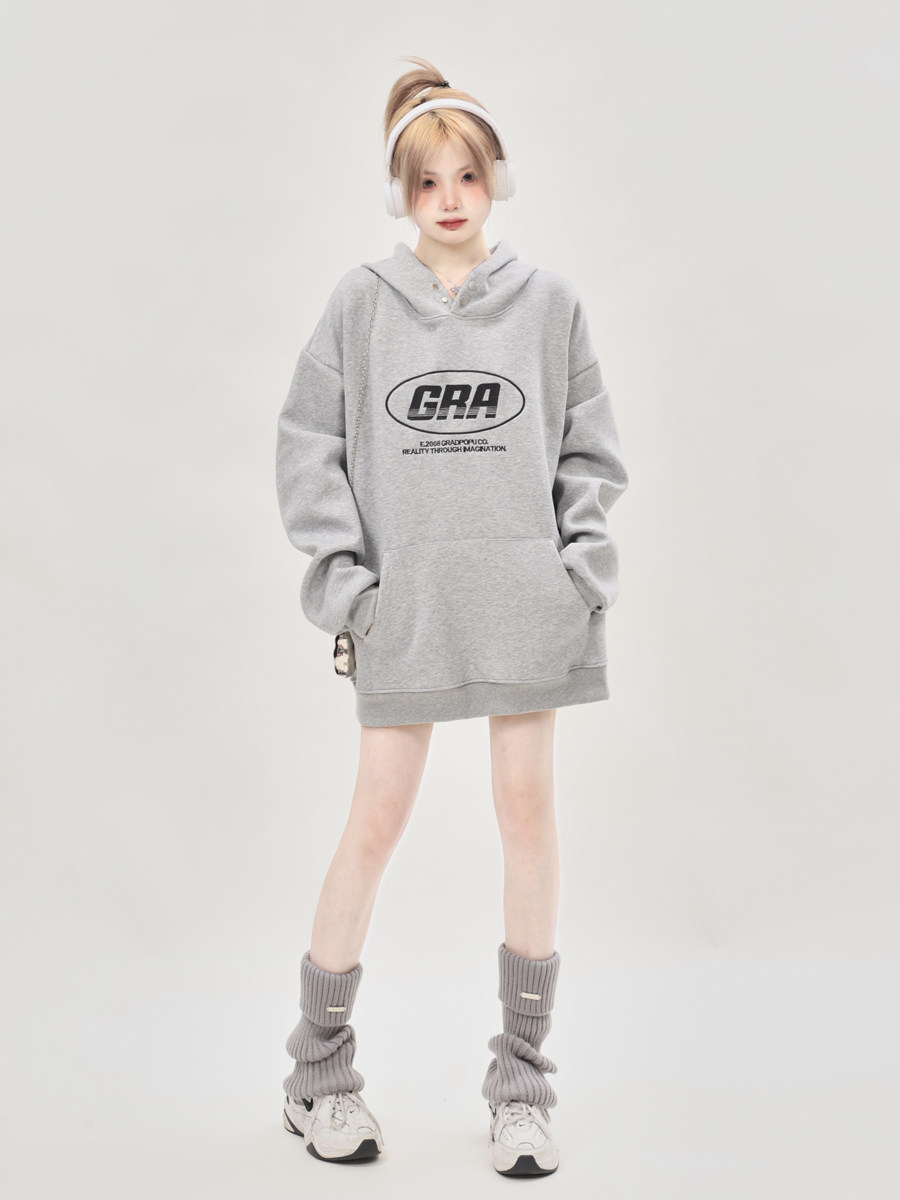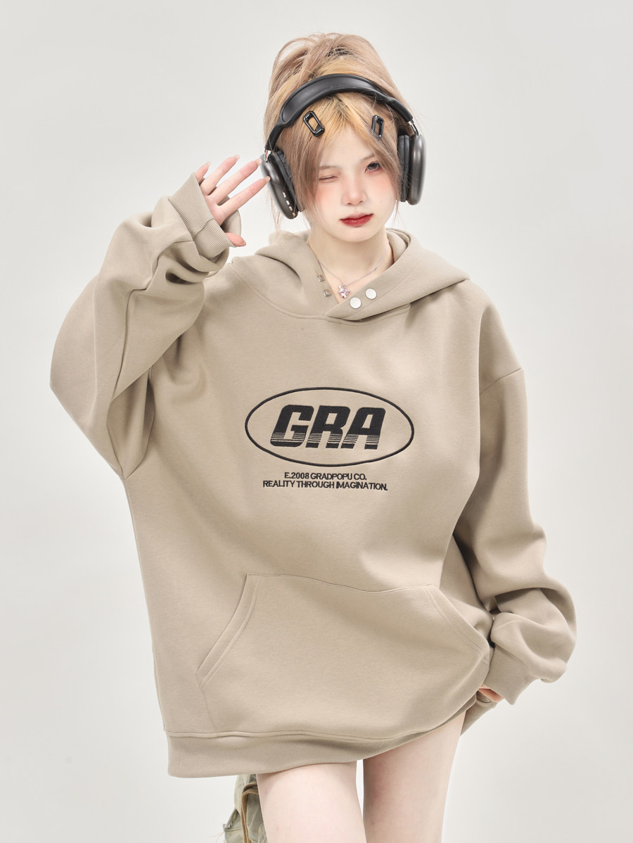 美式潮牌重磅oversize小眾設計感刺繡灰色厚棉T女春秋連帽外套上衣