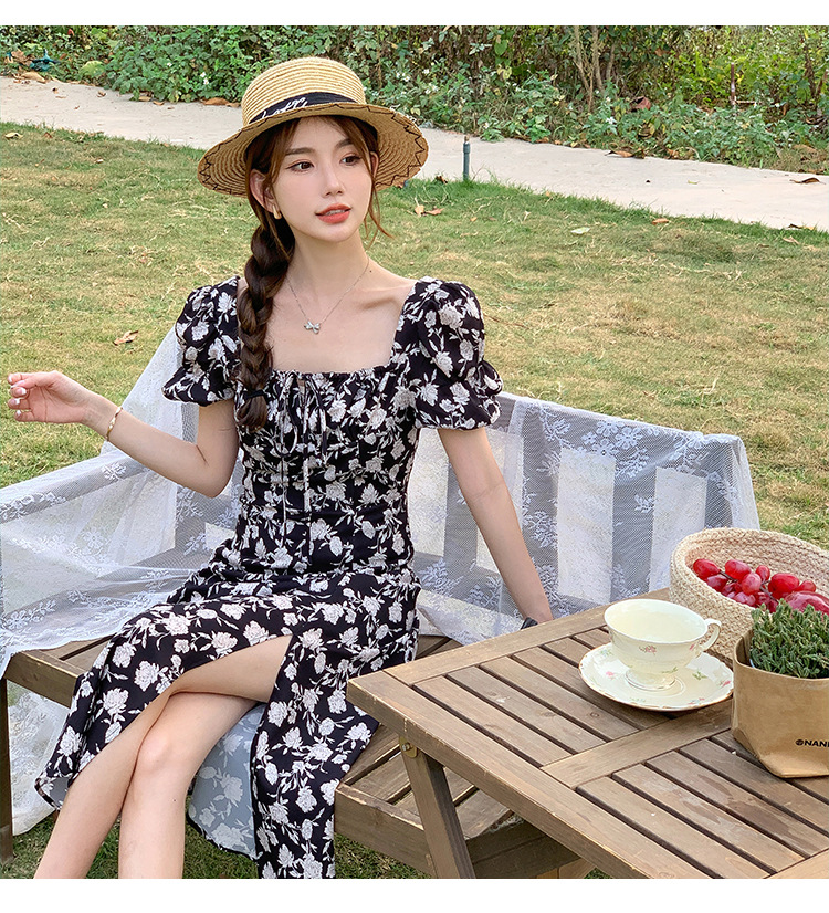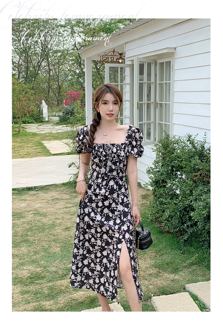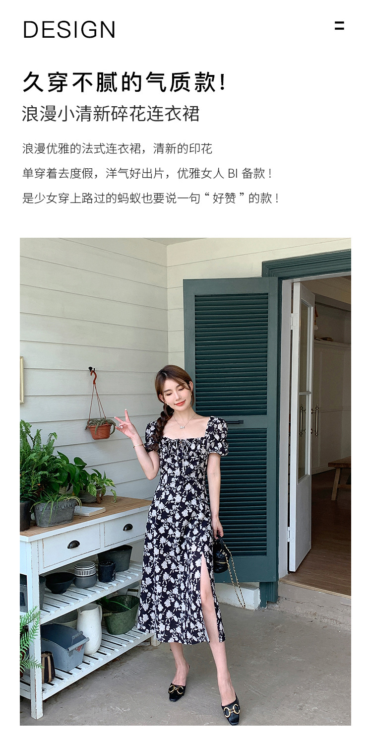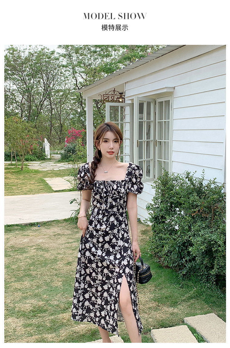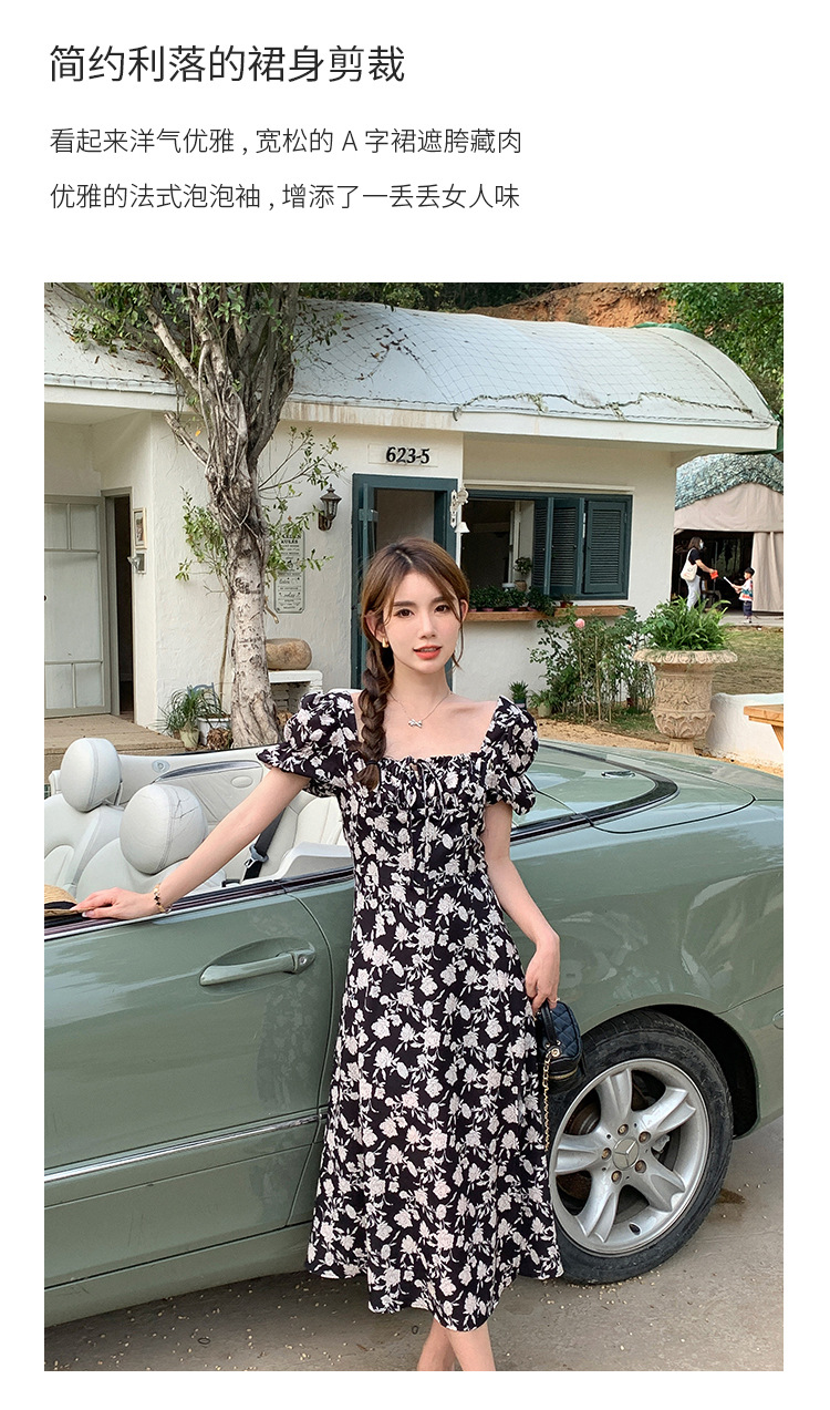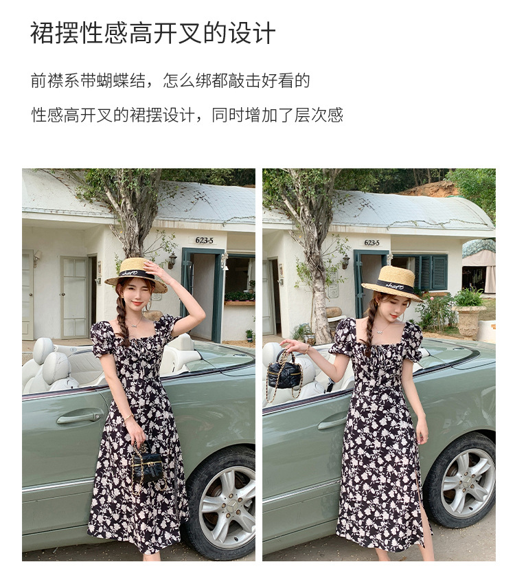 开叉气质碎花连衣裙女2023夏季新款泡泡袖法式复古气质方领中长裙