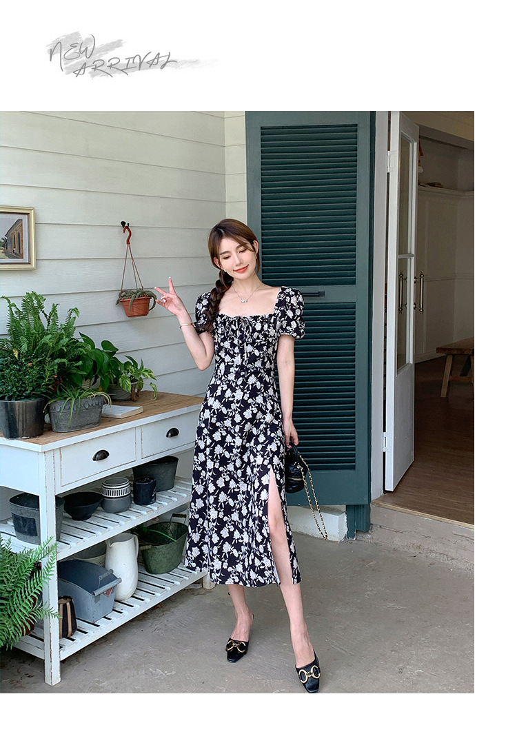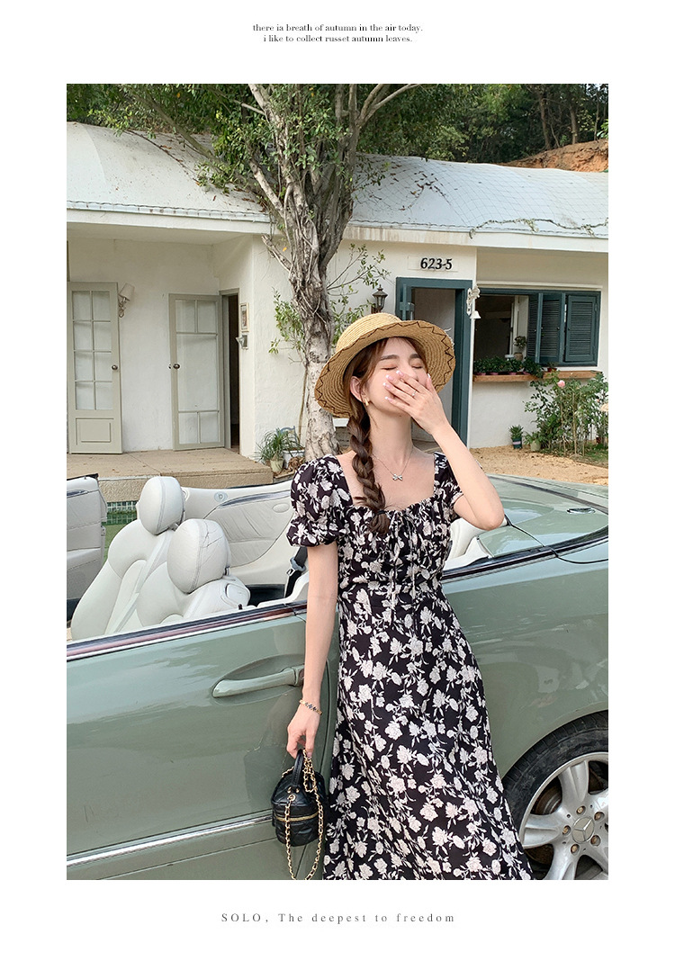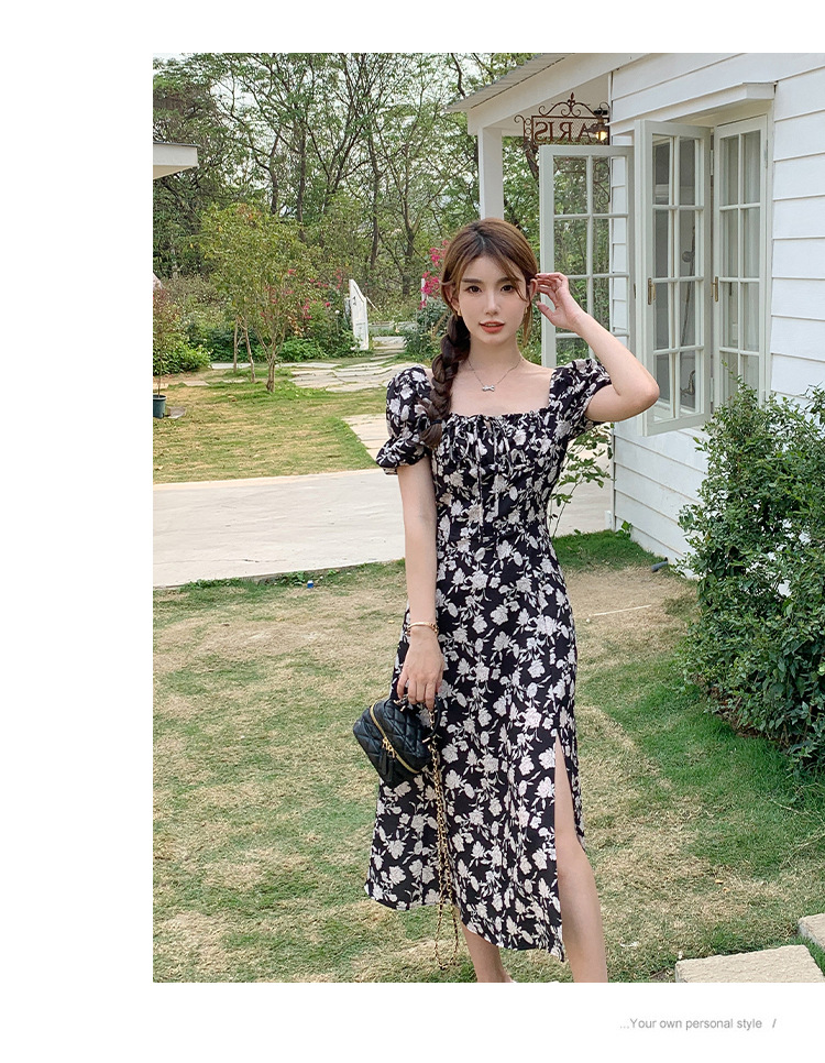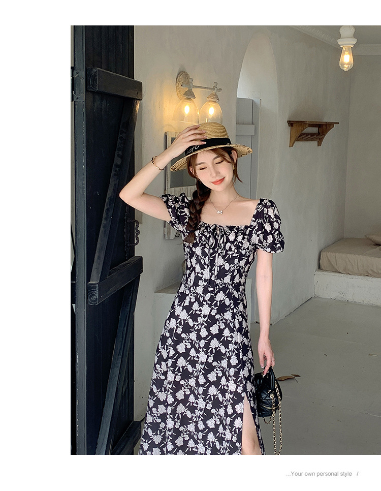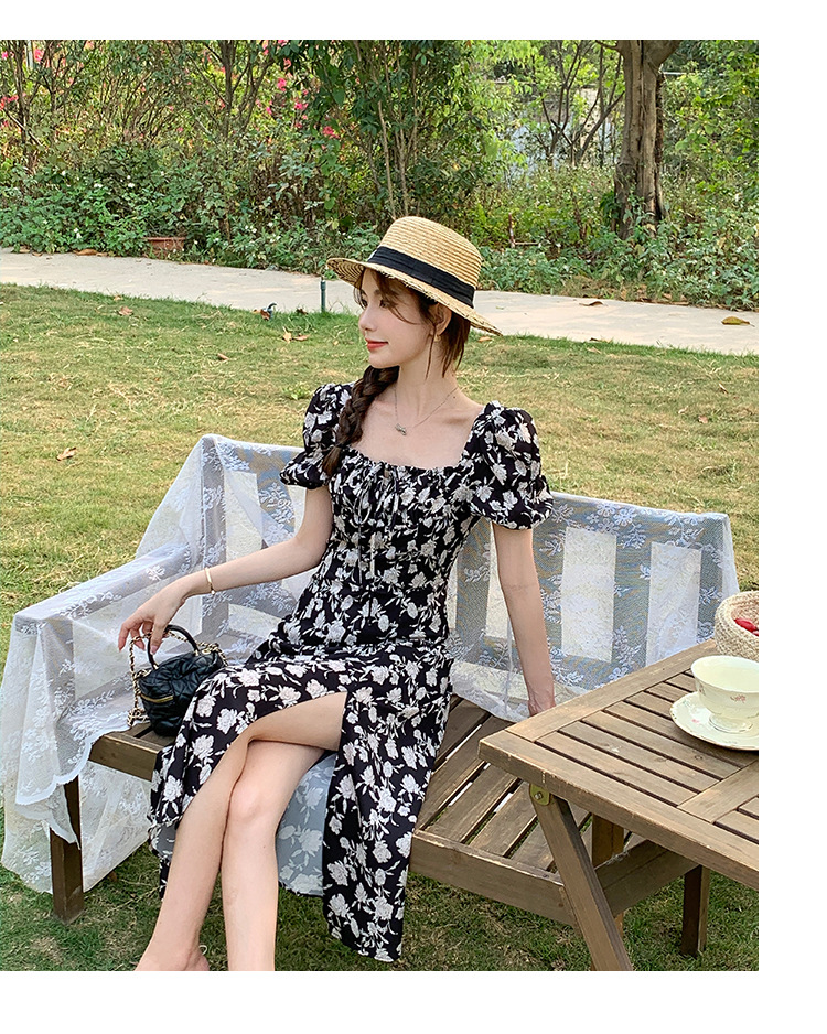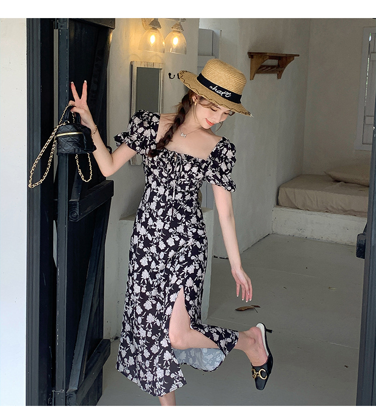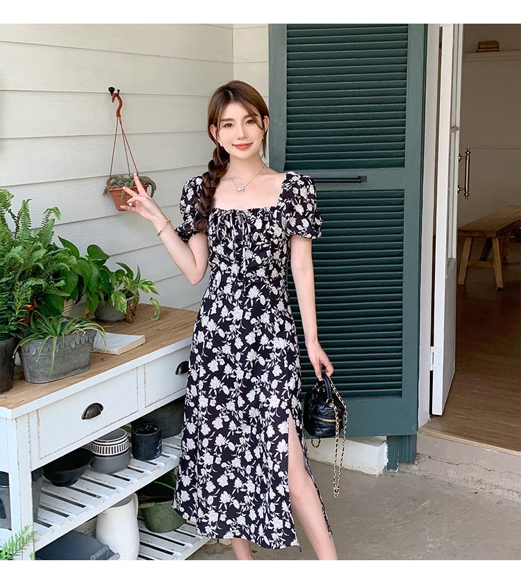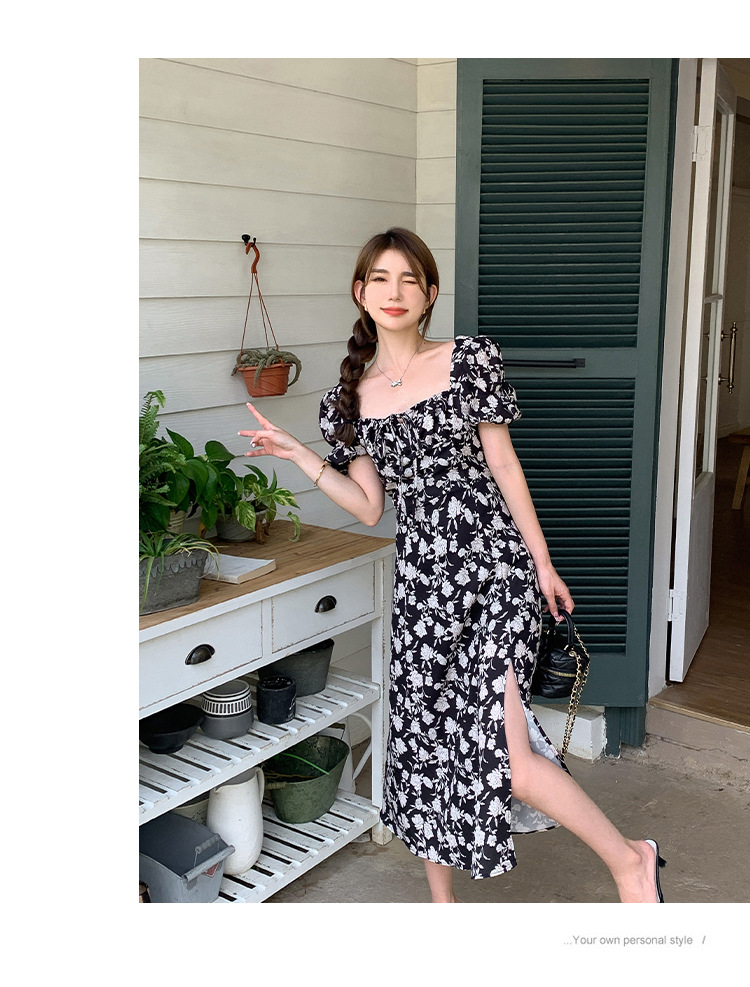开叉气质碎花连衣裙女2023夏季新款泡泡袖法式复古气质方领中长裙