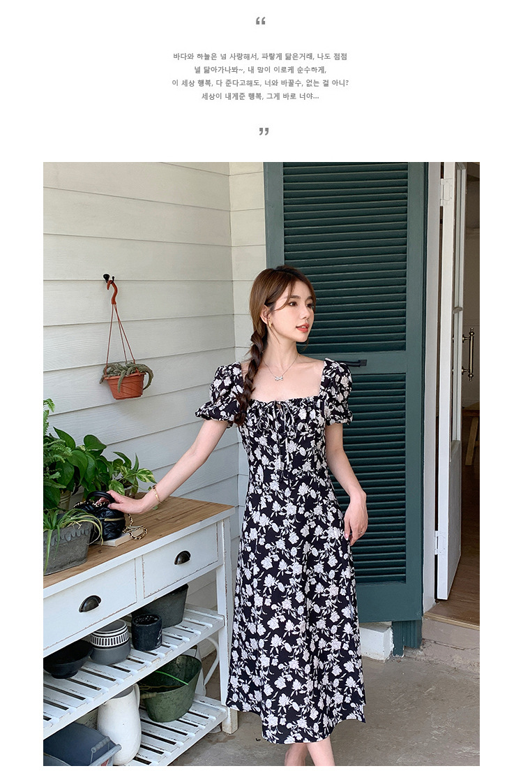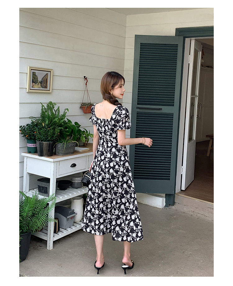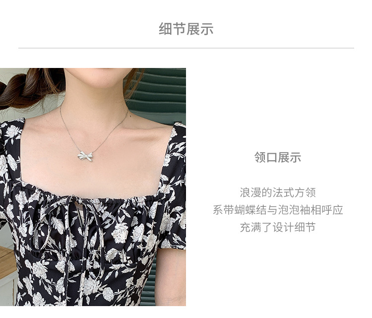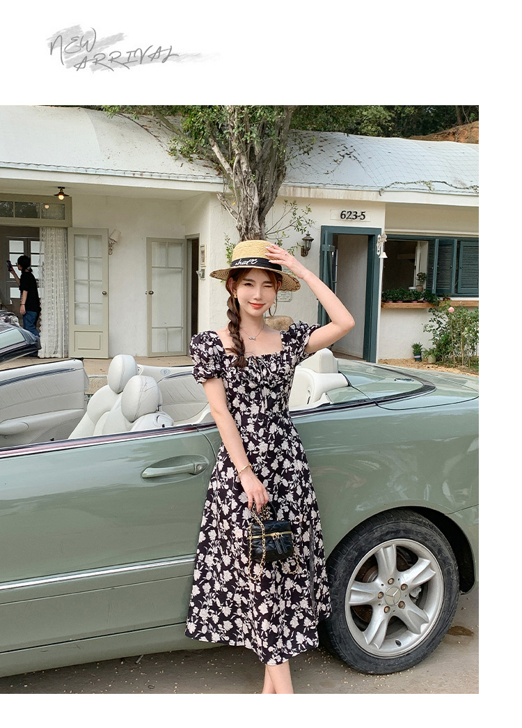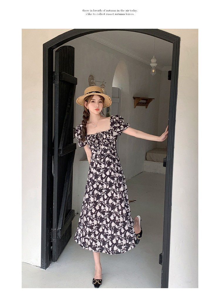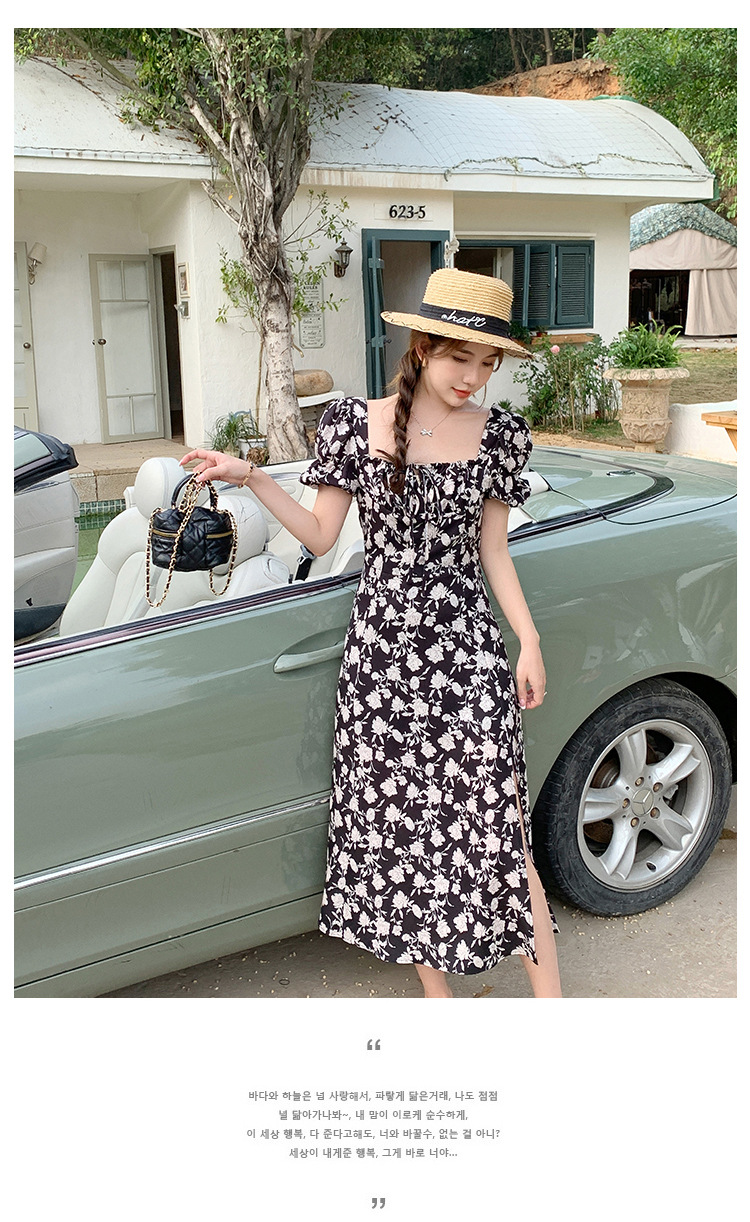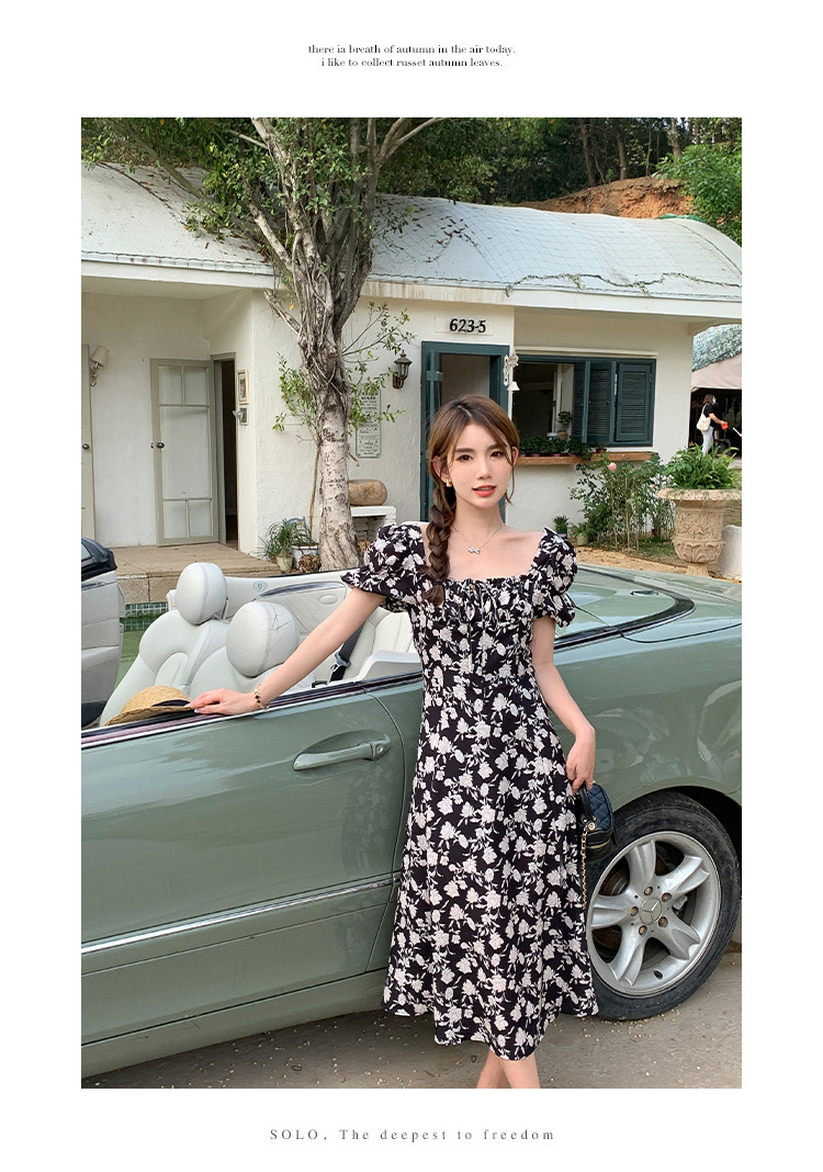 开叉气质碎花连衣裙女2023夏季新款泡泡袖法式复古气质方领中长裙
