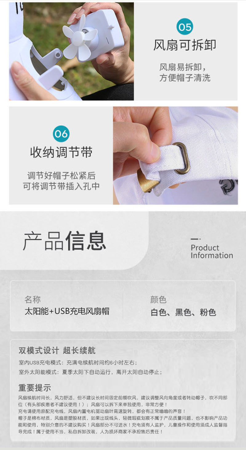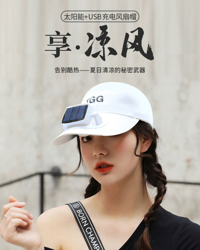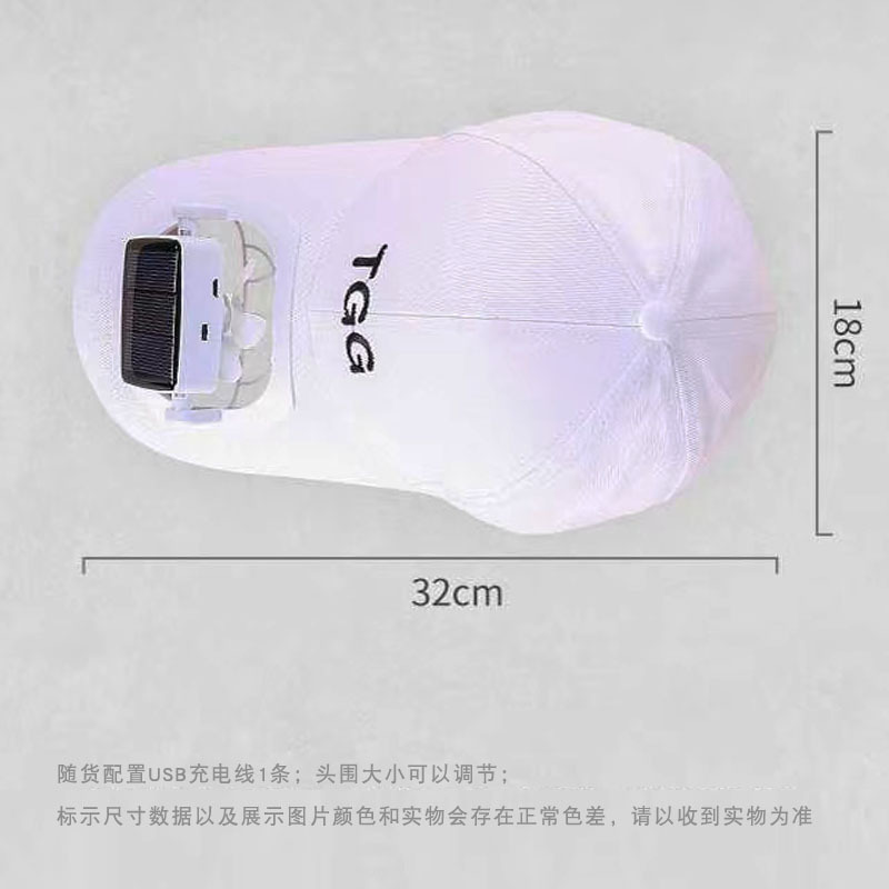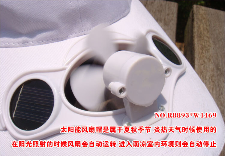 商品标题【风扇帽子3款可选,下单请注意!】 厂家直销太阳能风扇帽夏季遮阳帽子棉质太阳能棒球帽带风扇广告帽 Solar fan hat时尚新款棒球帽带太阳能小风扇批发采购供应。   ***********************产品详情说明细节图片*********************** 1--【太阳能款】 头围约56-61cm  仅限夏季太阳下使用,太阳光照射风扇自动运转;没有太阳光照射风扇不转;