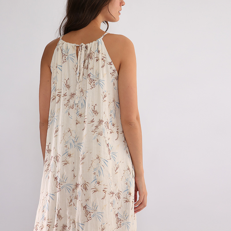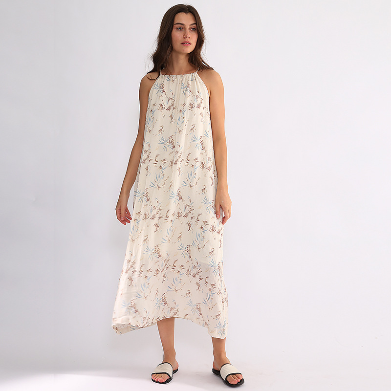 2023年夏季吊带裙子小众度假棉麻系带设计感无袖中长款碎花连衣裙