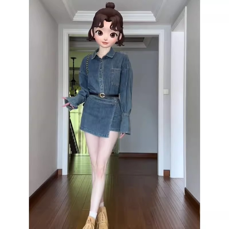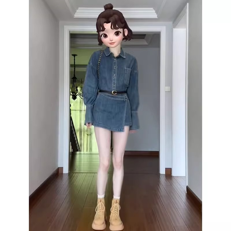 秋季2023新款女裝小個子高級感茶系穿搭牛仔長袖洋裝子兩件式套裝