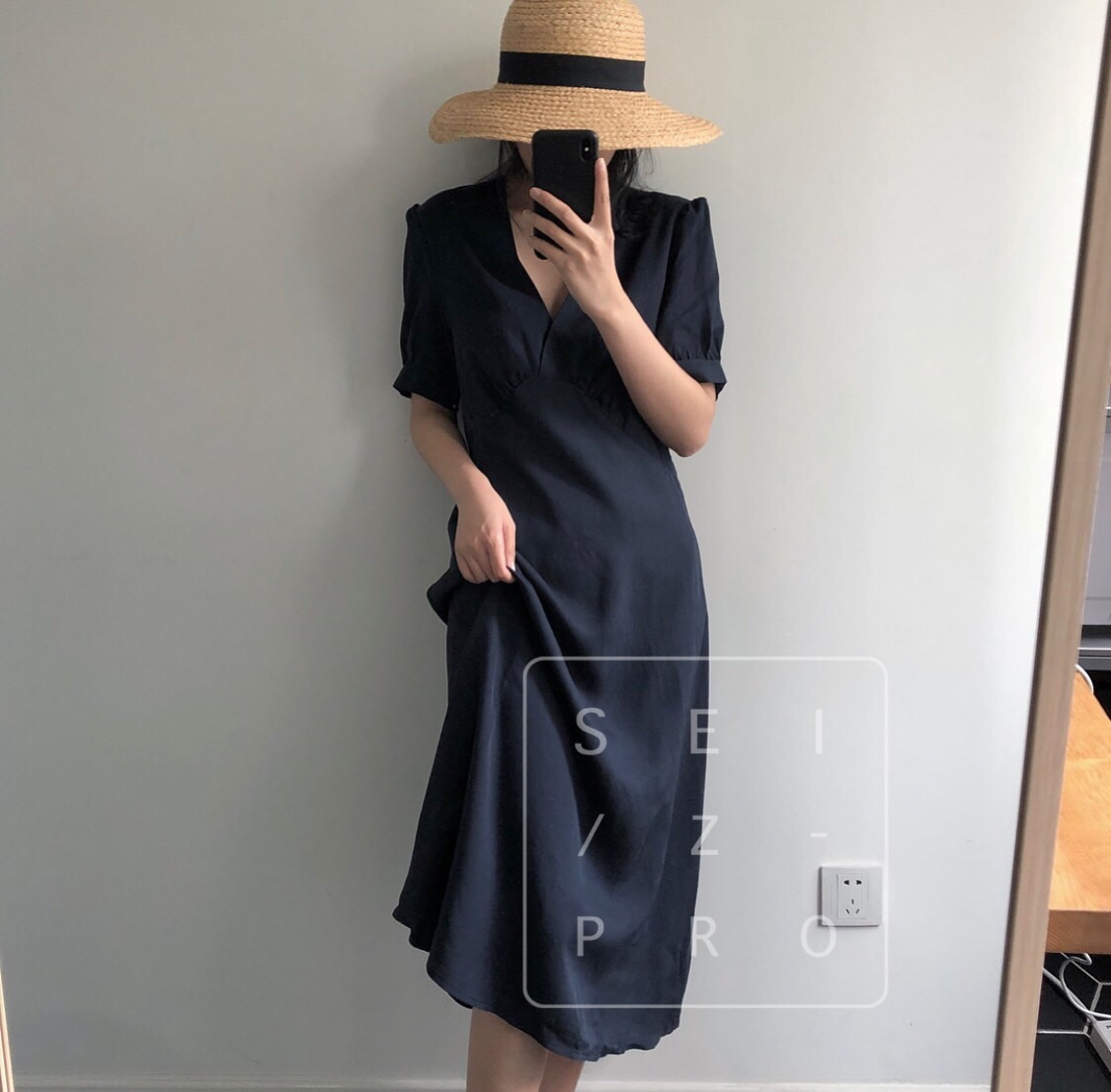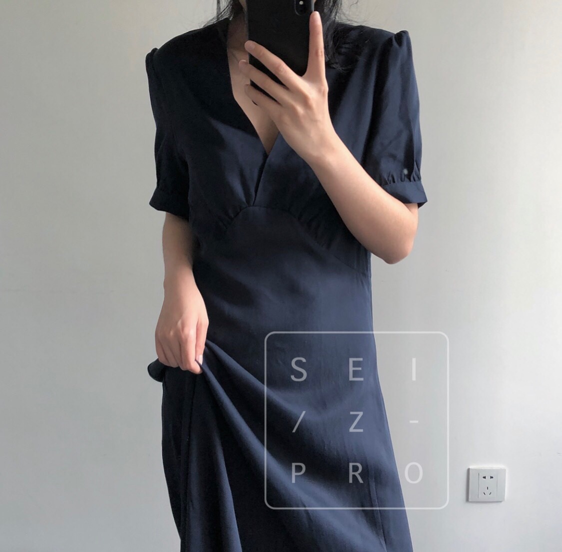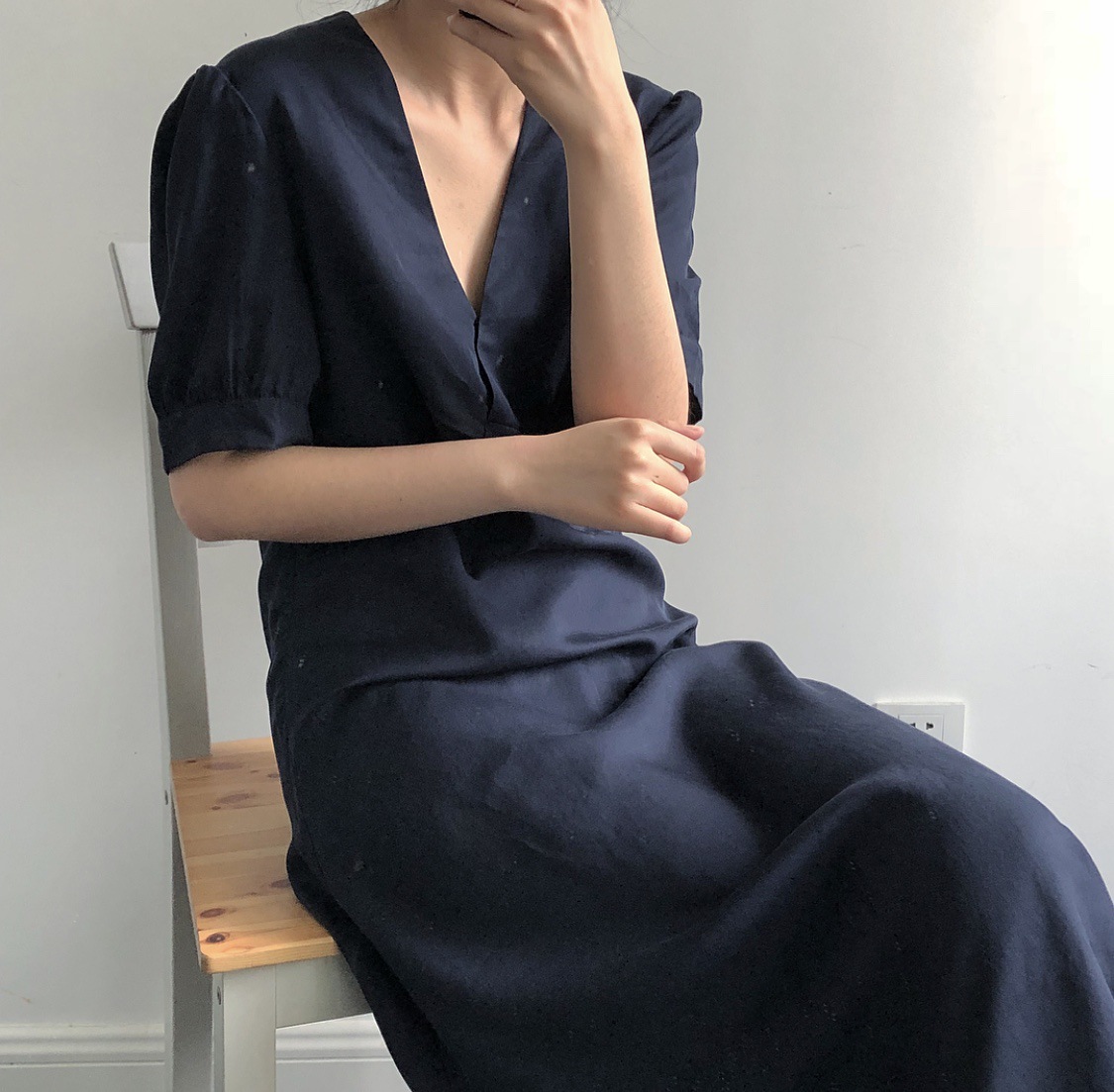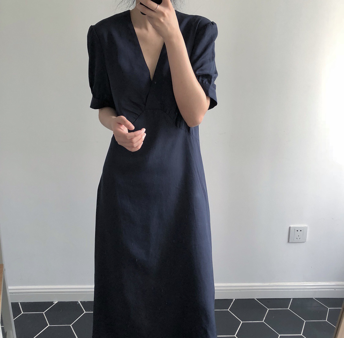 卢浮夏新款韩国简约优雅V领小性感泡泡袖短袖连衣裙高腰品质女