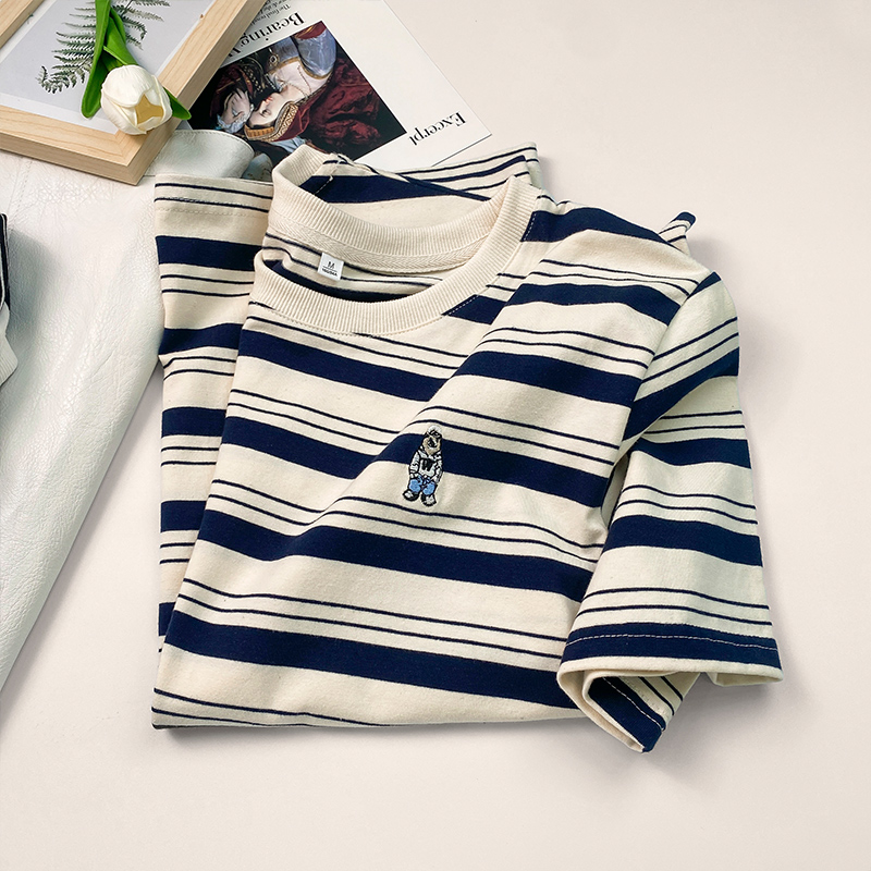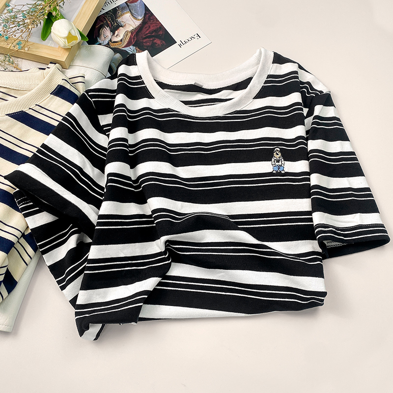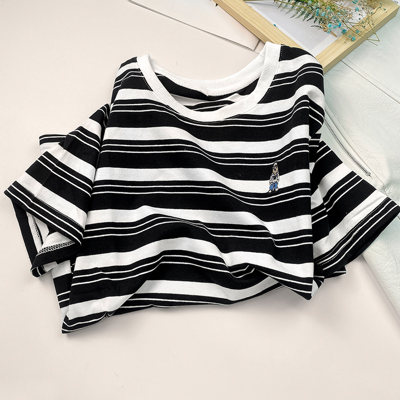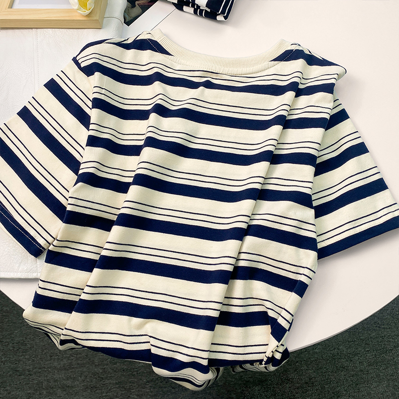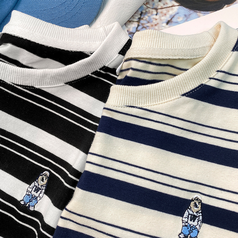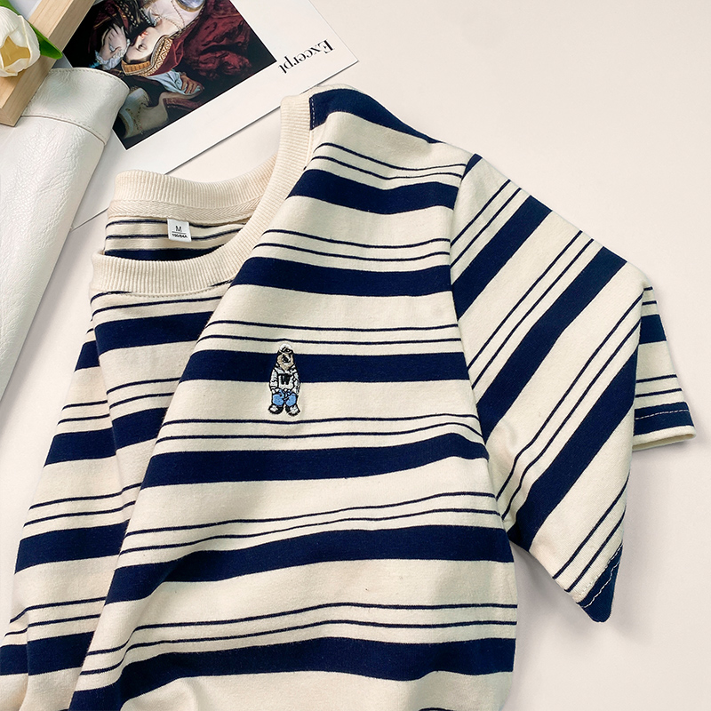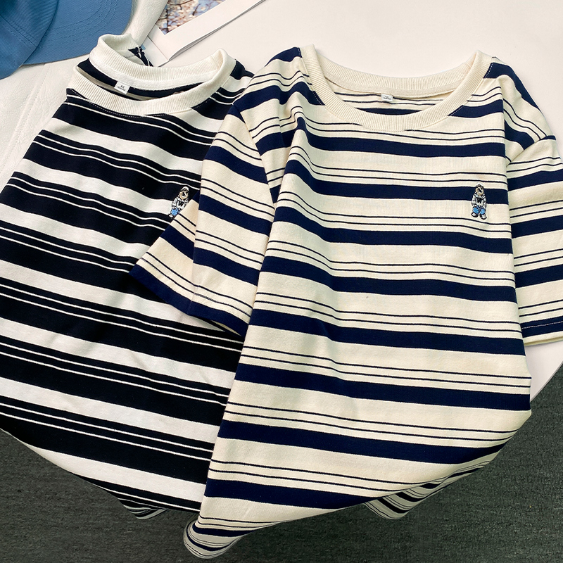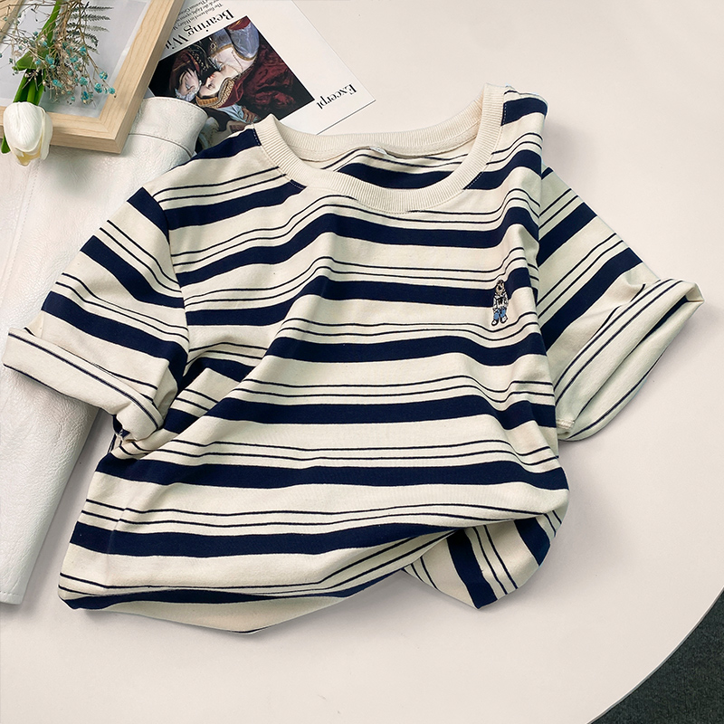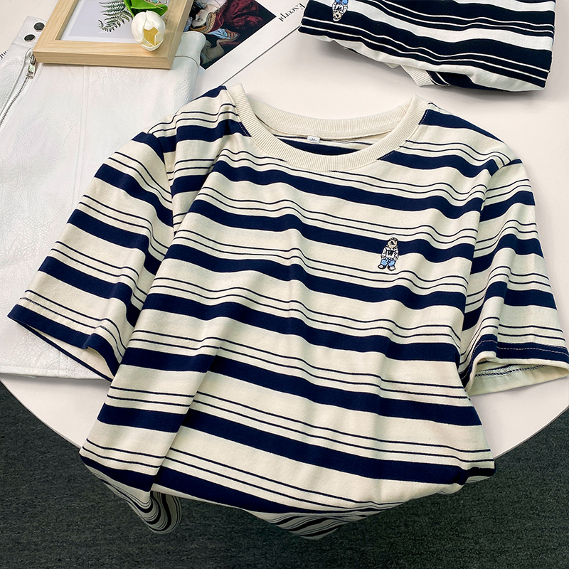 韓國正肩條紋短袖T恤女春夏寬鬆純棉半袖時尚刺繡打底上衣ins潮牌