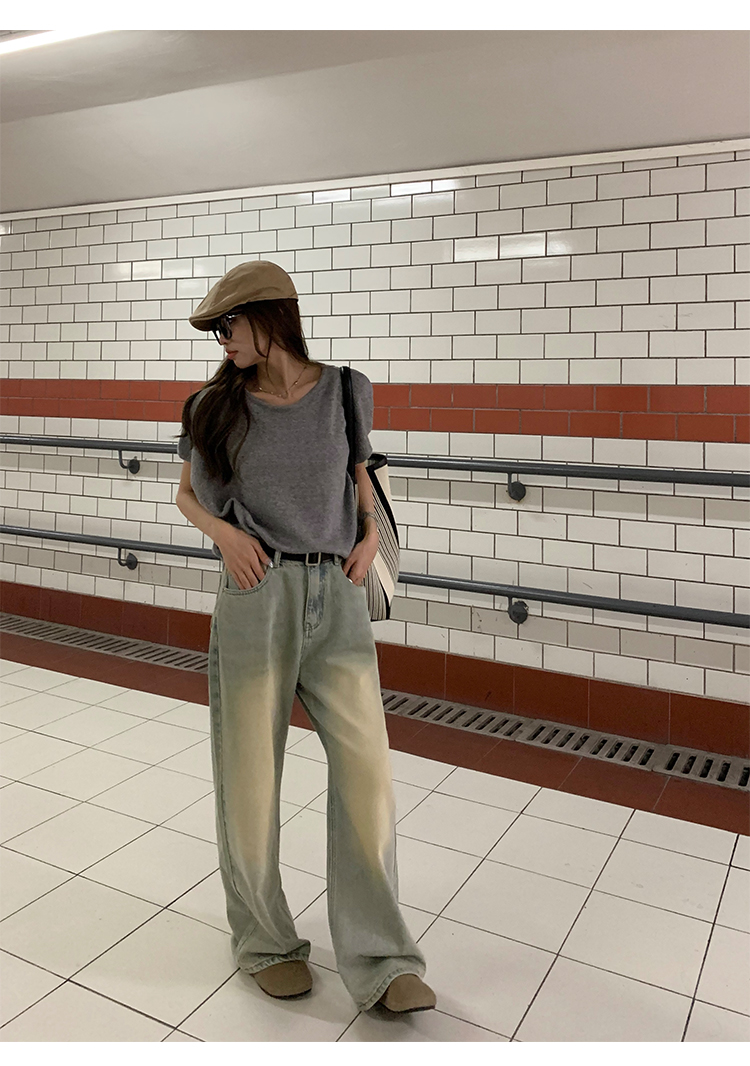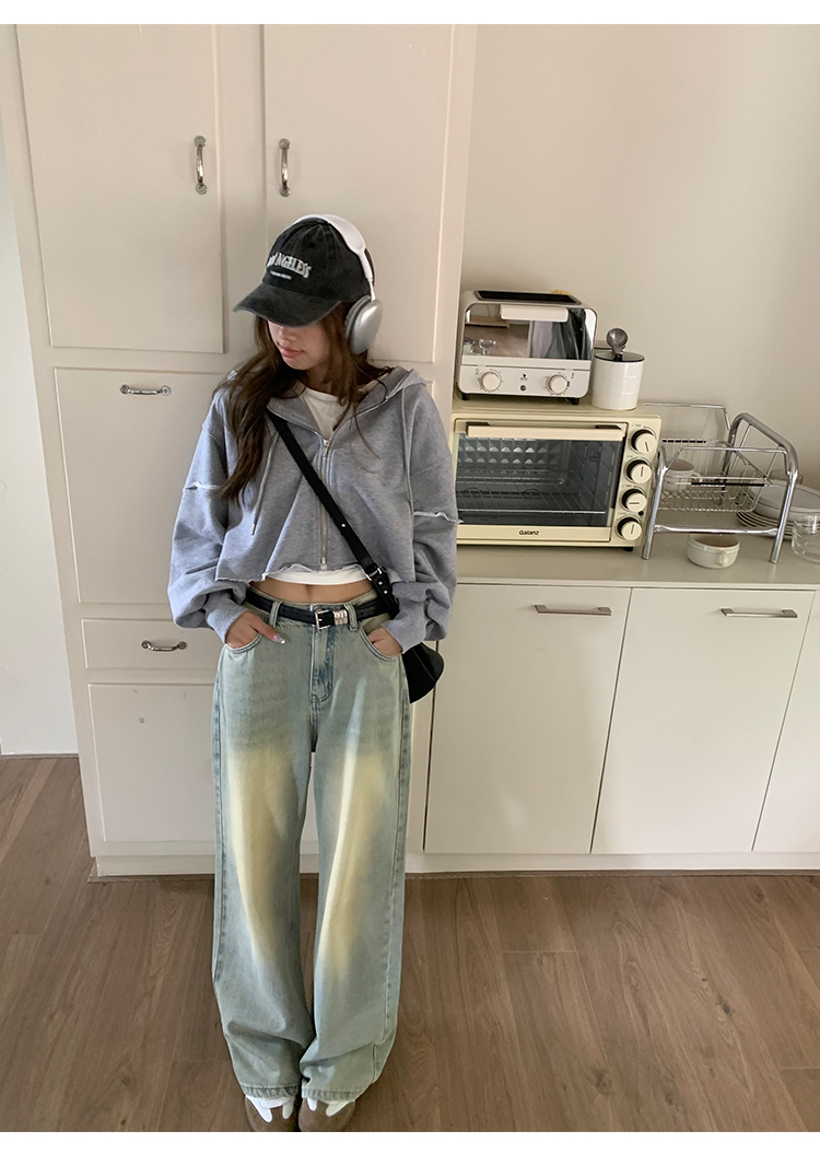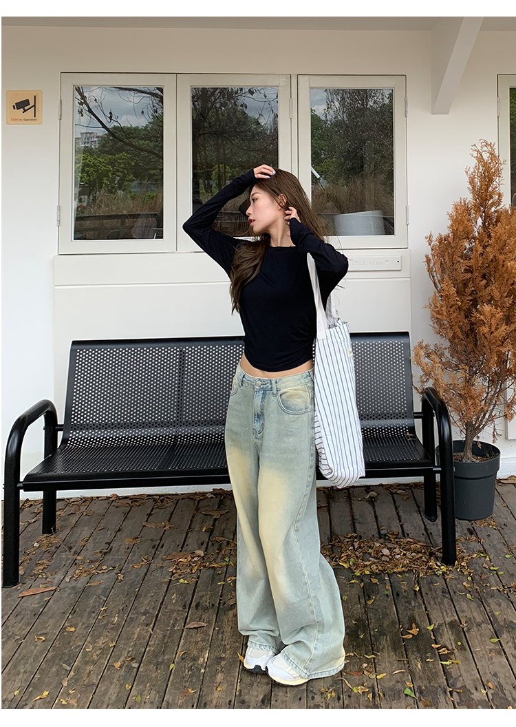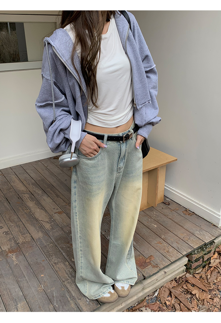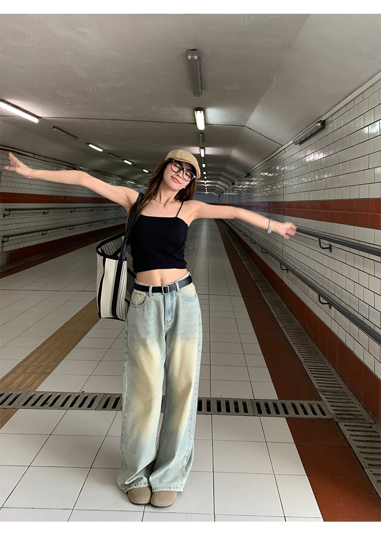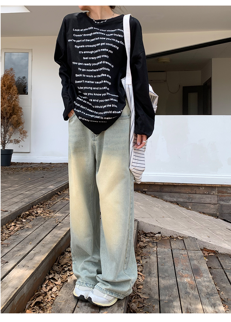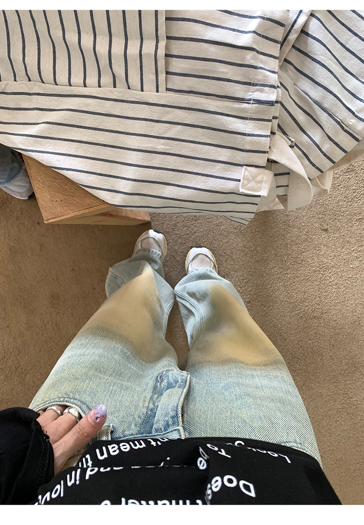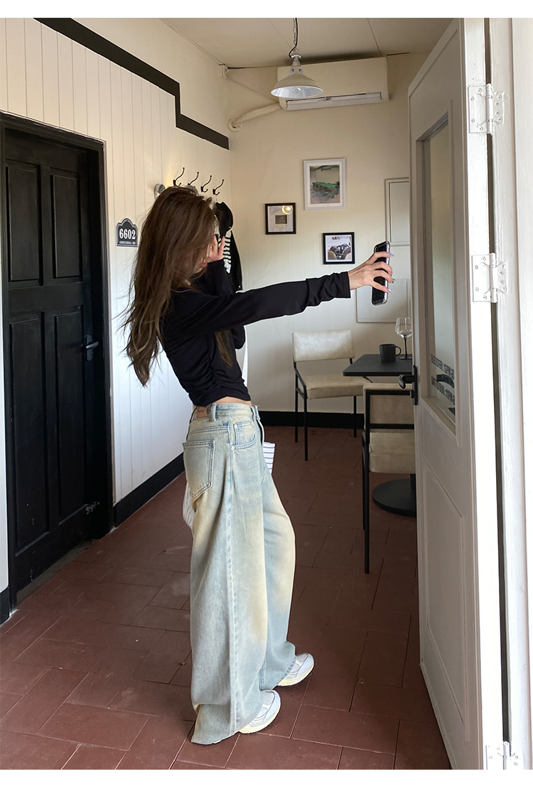 荒荒家水洗做舊牛仔褲2023年秋款美式復古淺色高腰寬鬆拖地闊腿褲