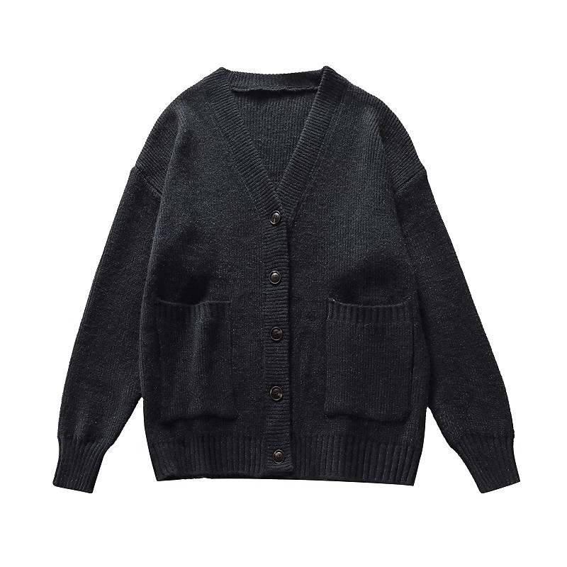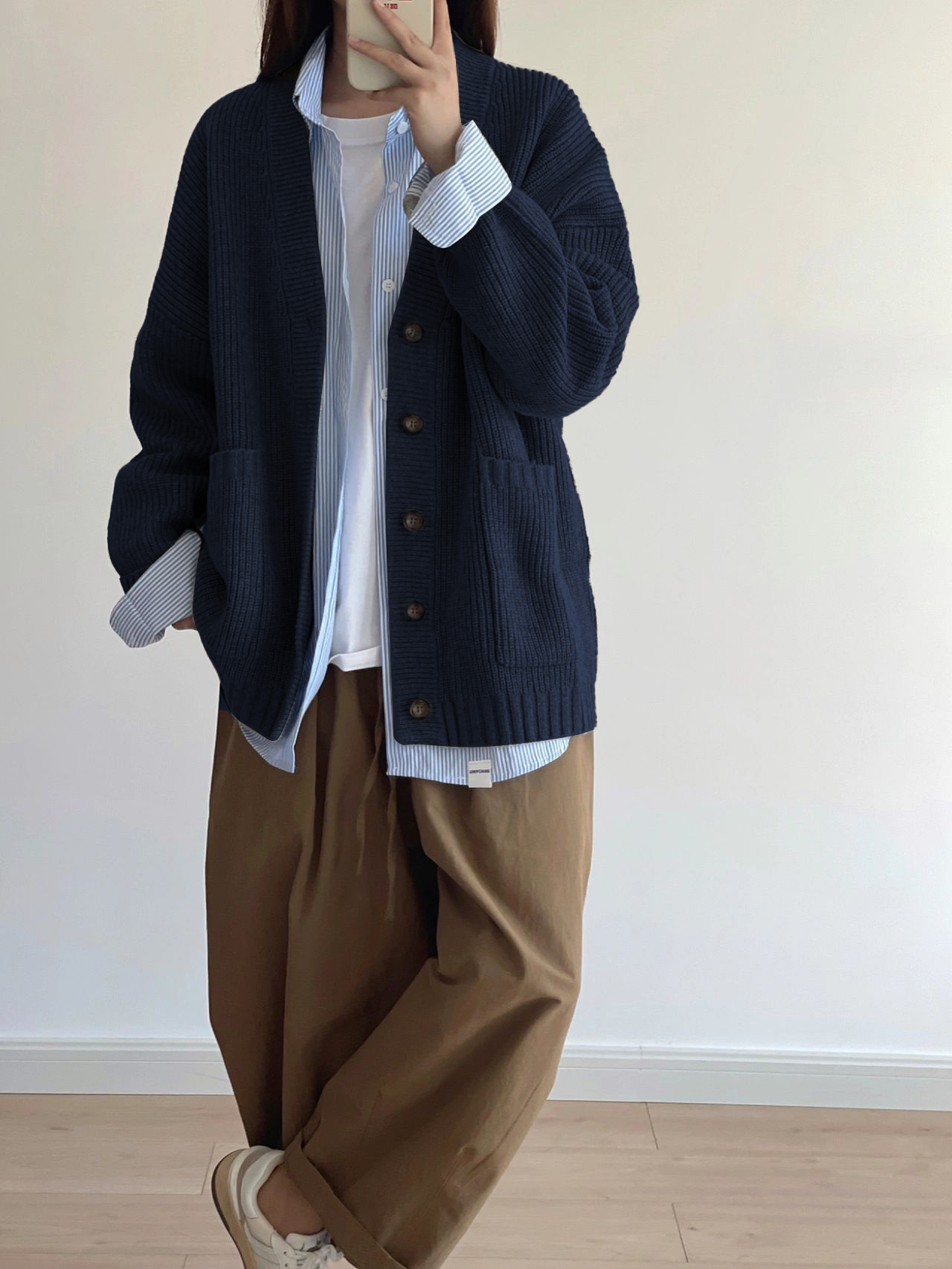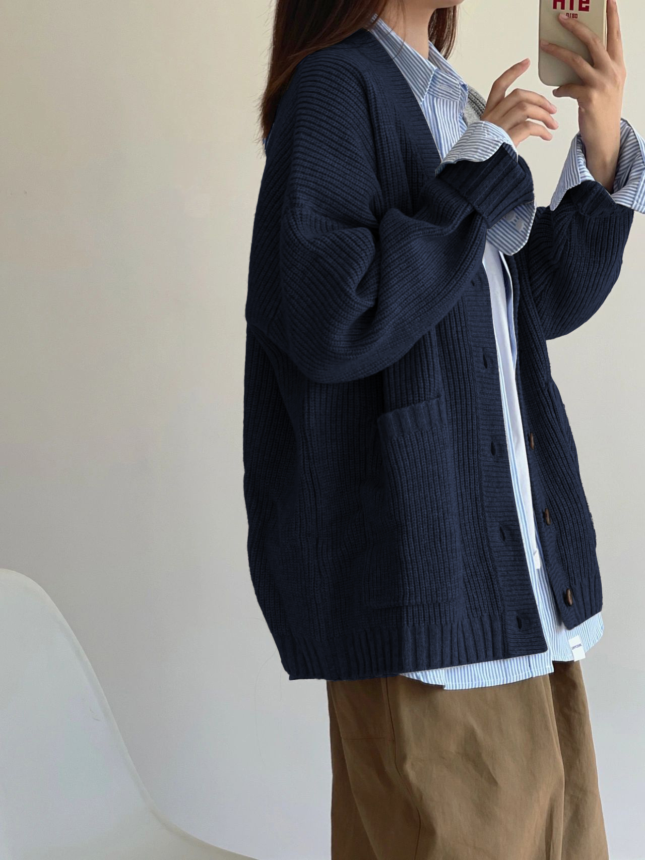 藏青色V領毛衣女秋冬季外搭針織衫寬鬆慵懶小眾開衫外套2023新款