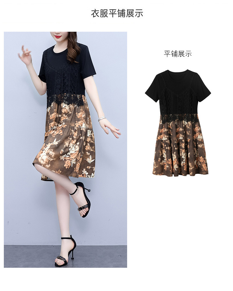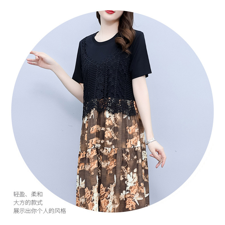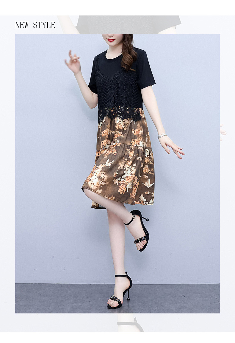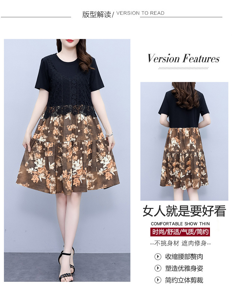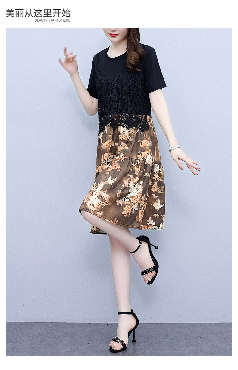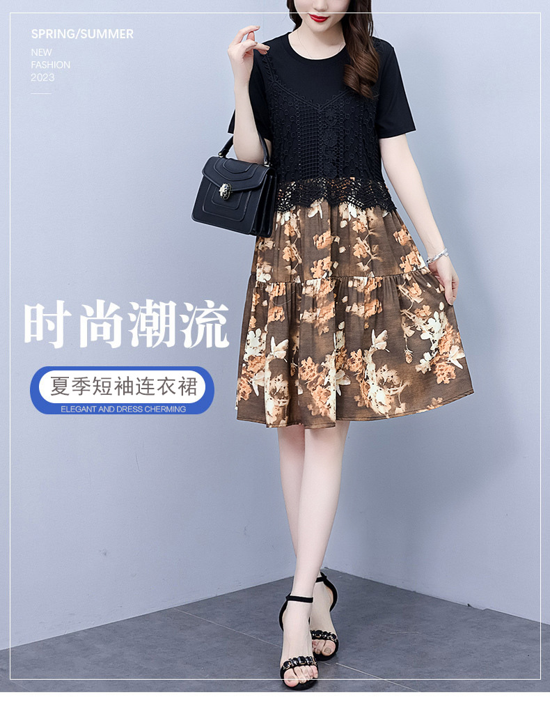 碎花连衣裙女2023夏季新款时尚气质胖MM遮肚显瘦蕾丝印花假两件