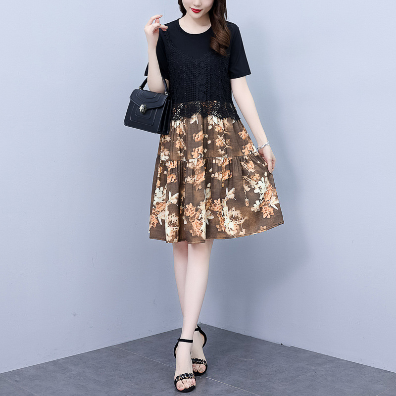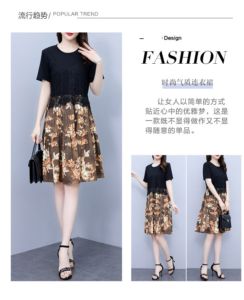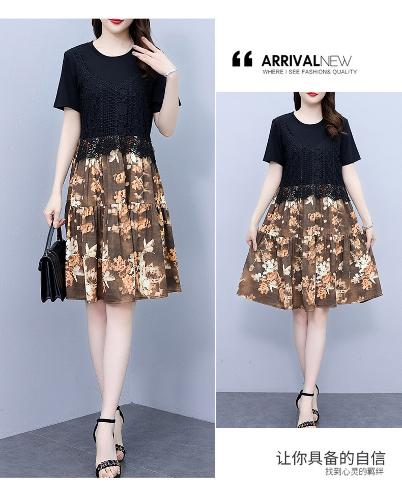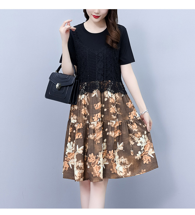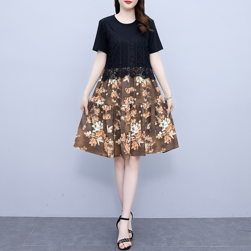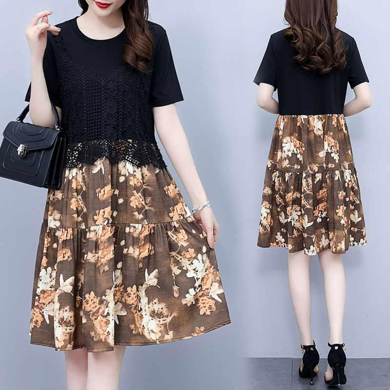 碎花连衣裙女2023夏季新款时尚气质胖MM遮肚显瘦蕾丝印花假两件