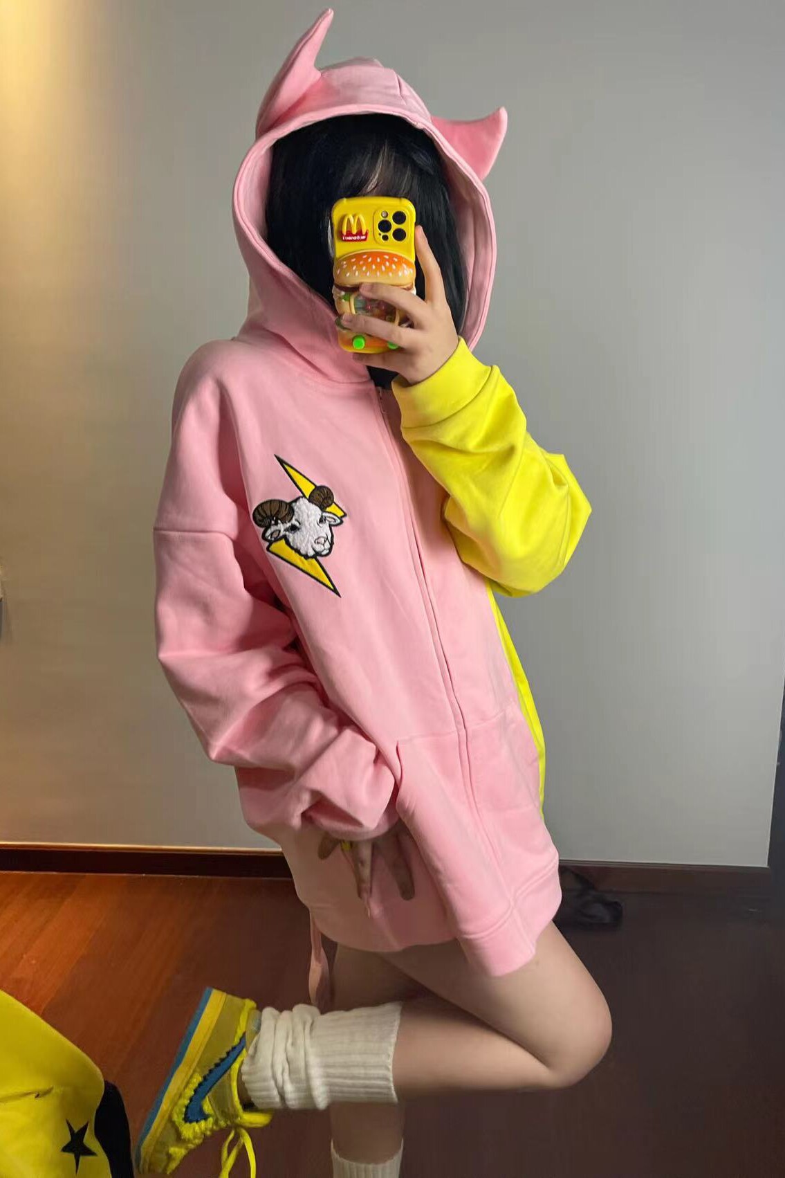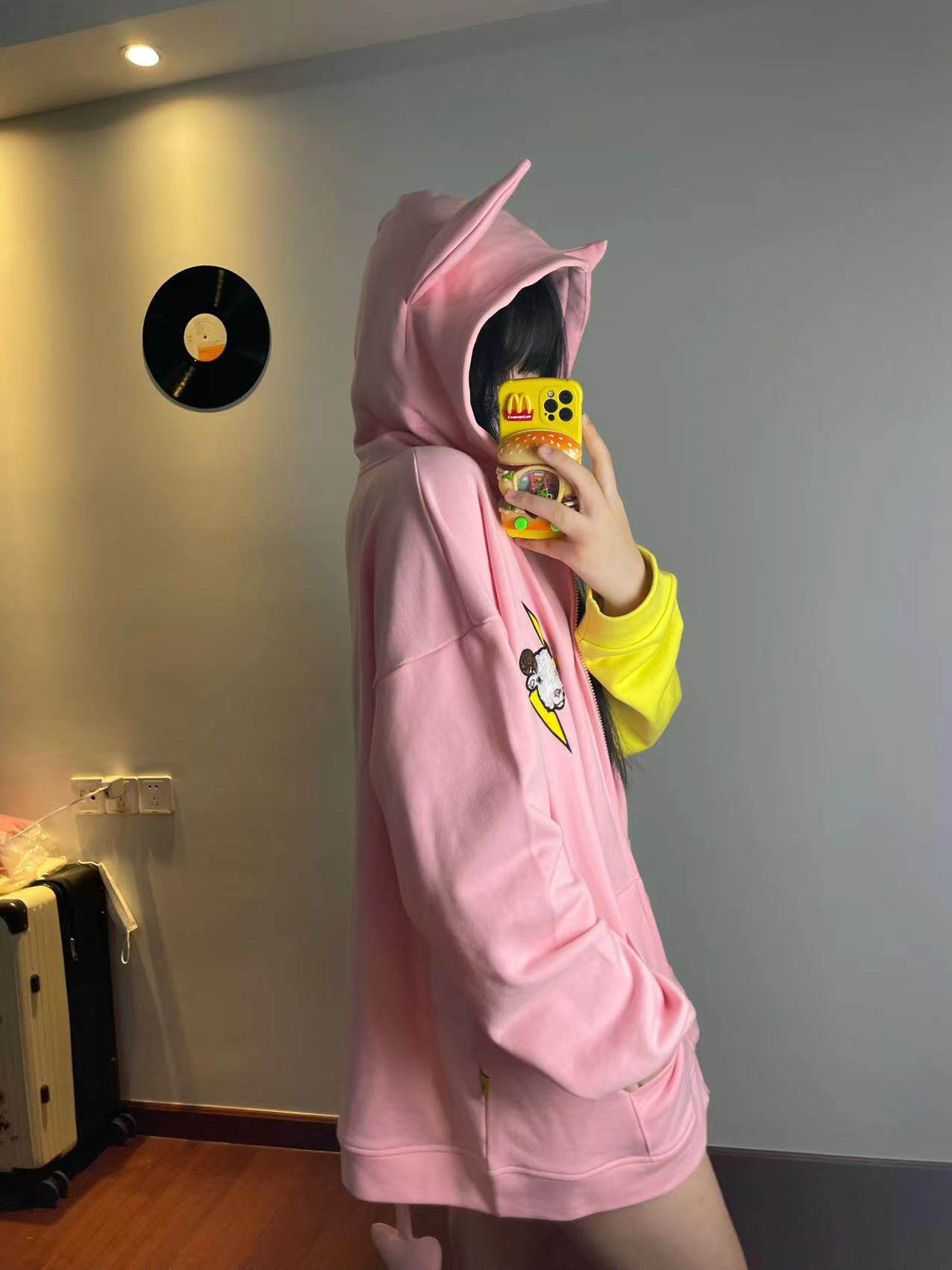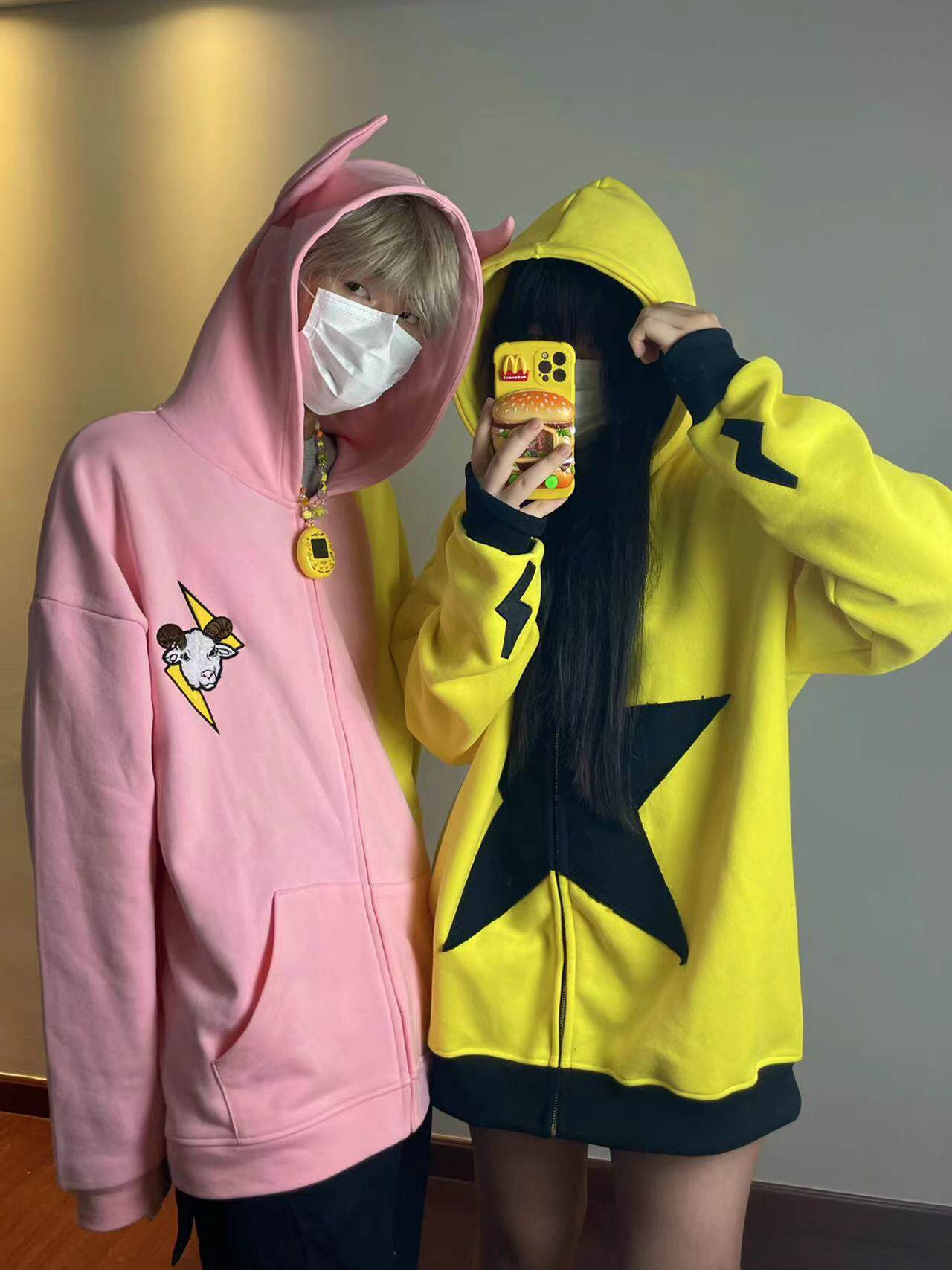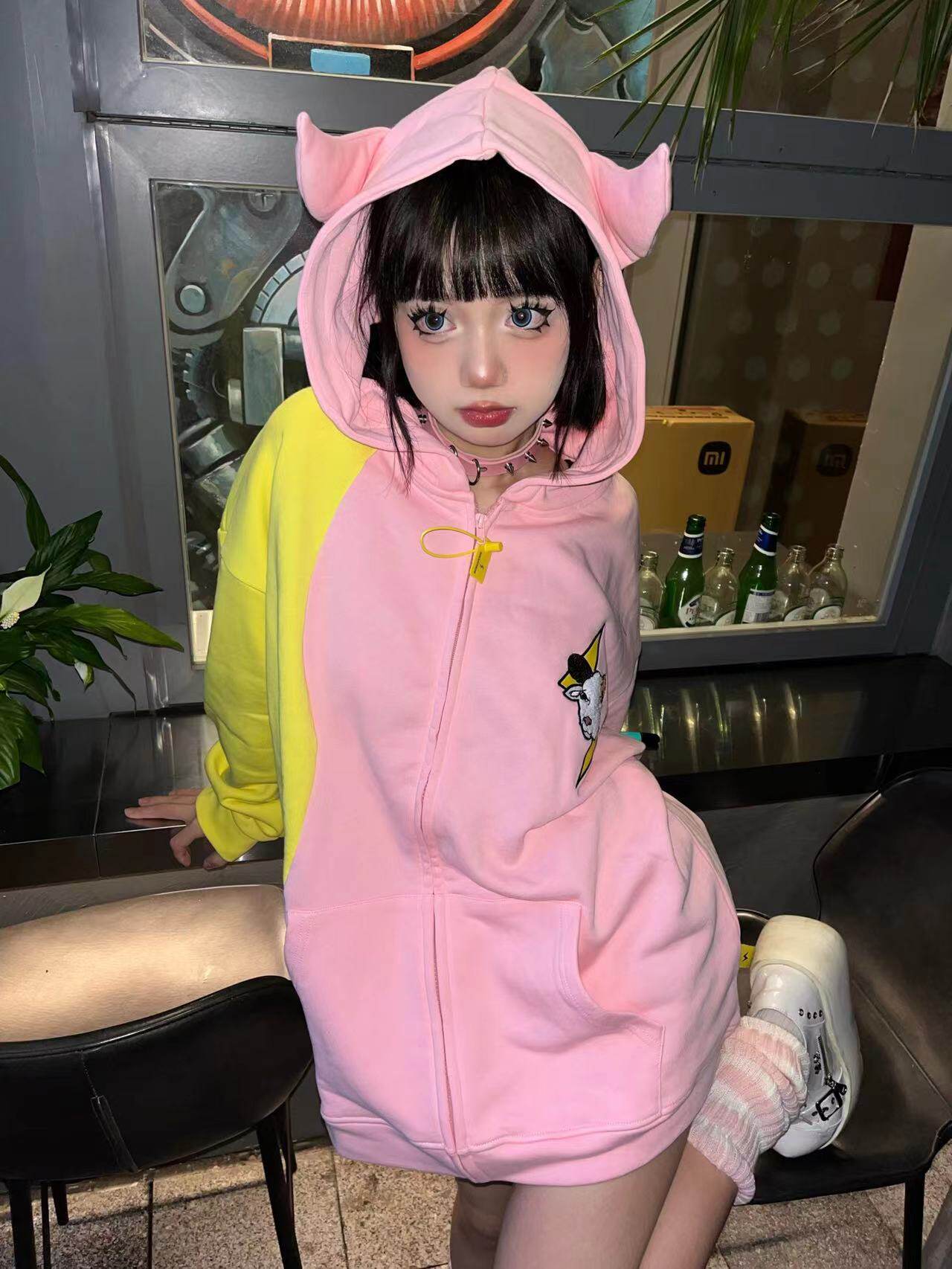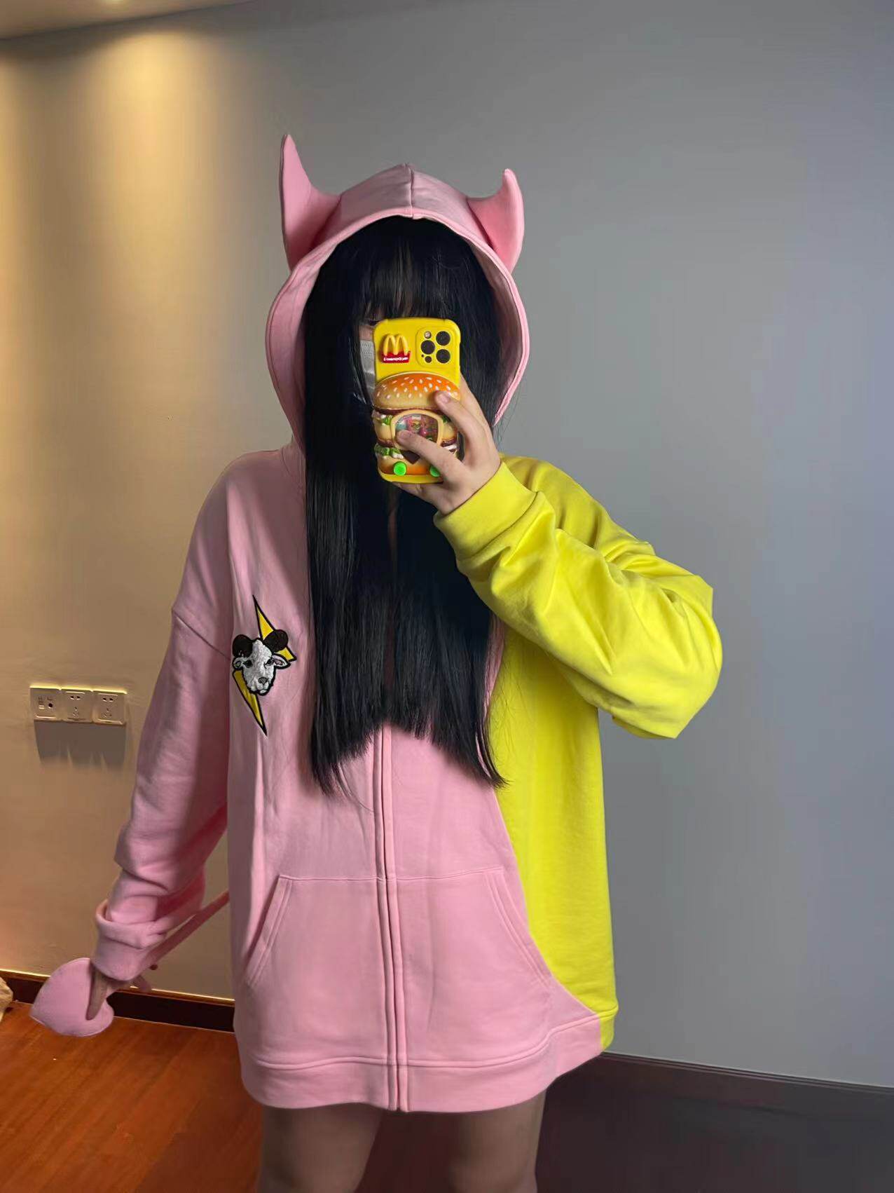 電次羊原創黃粉撞色寬鬆拼接小惡魔角刺繡連帽拉鍊可拆卸尾巴衛衣