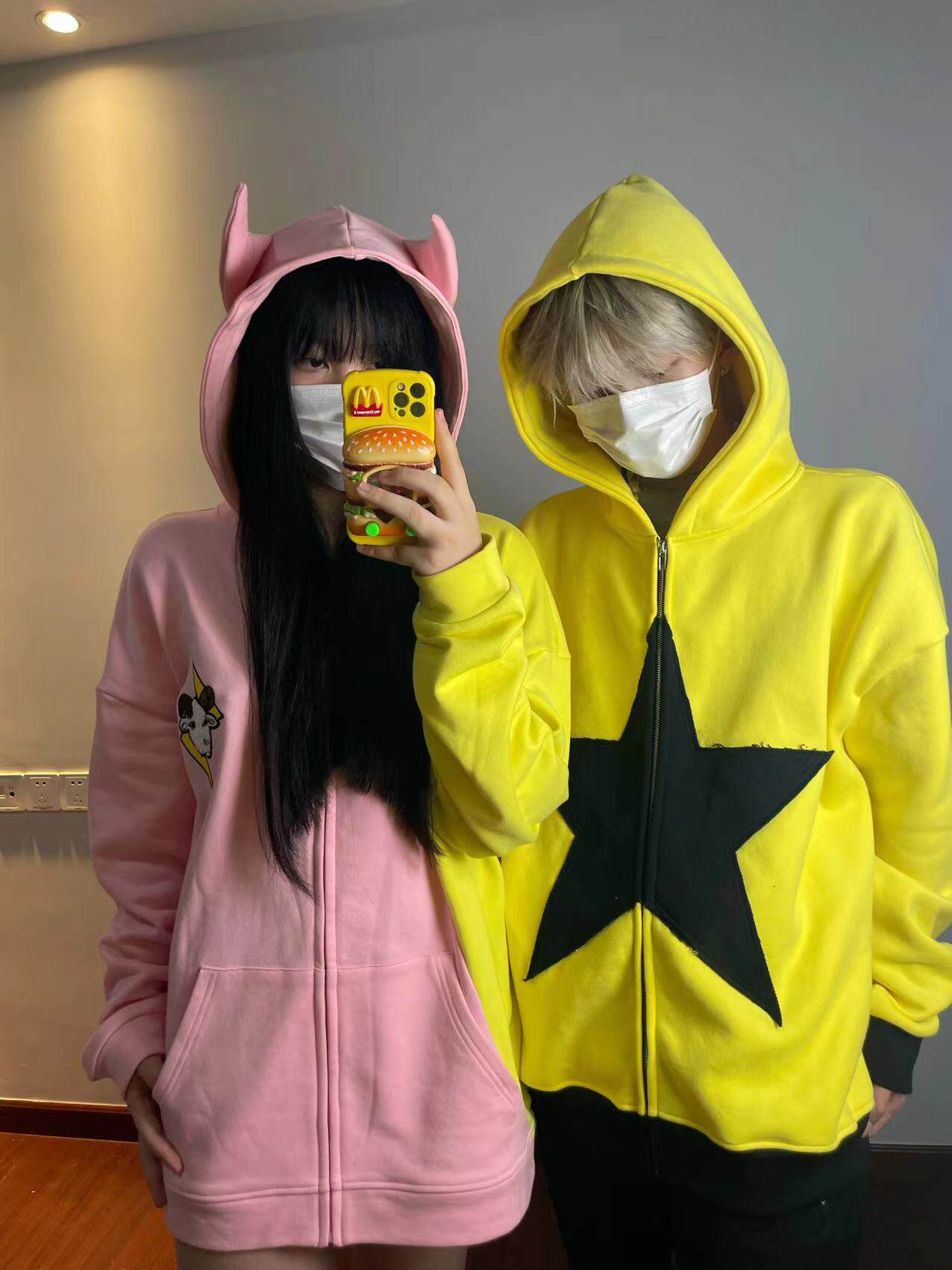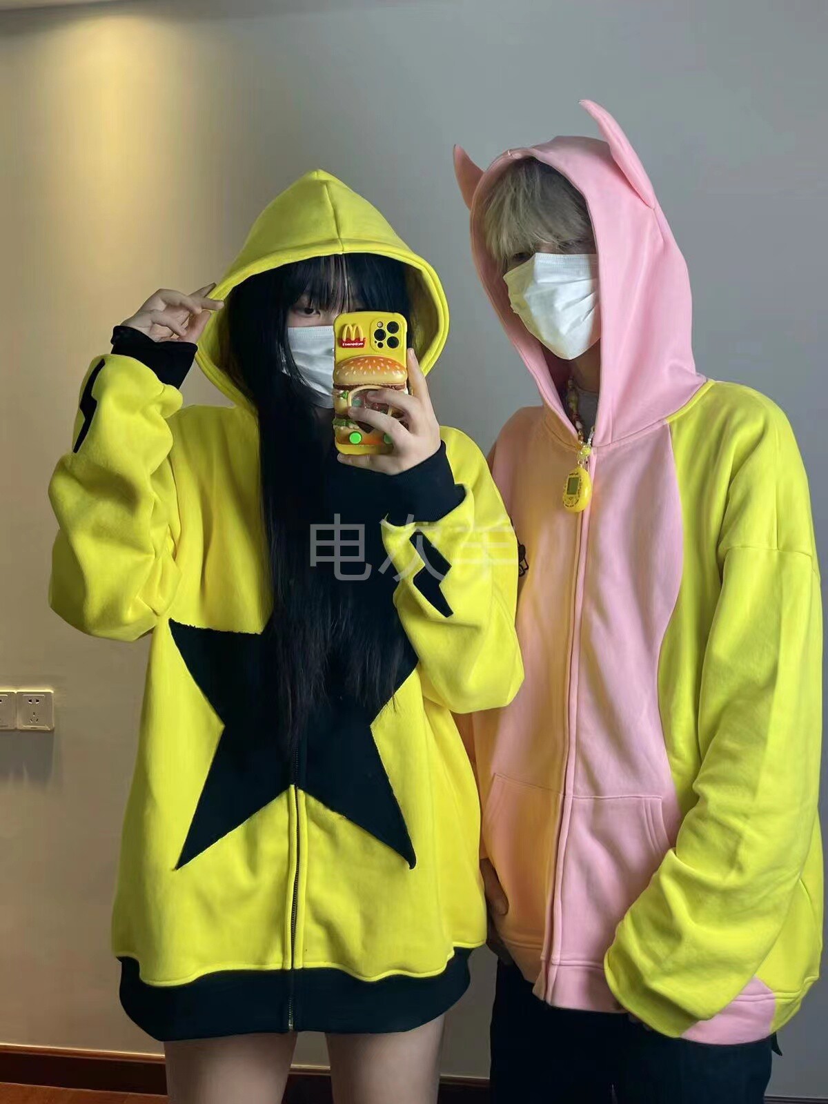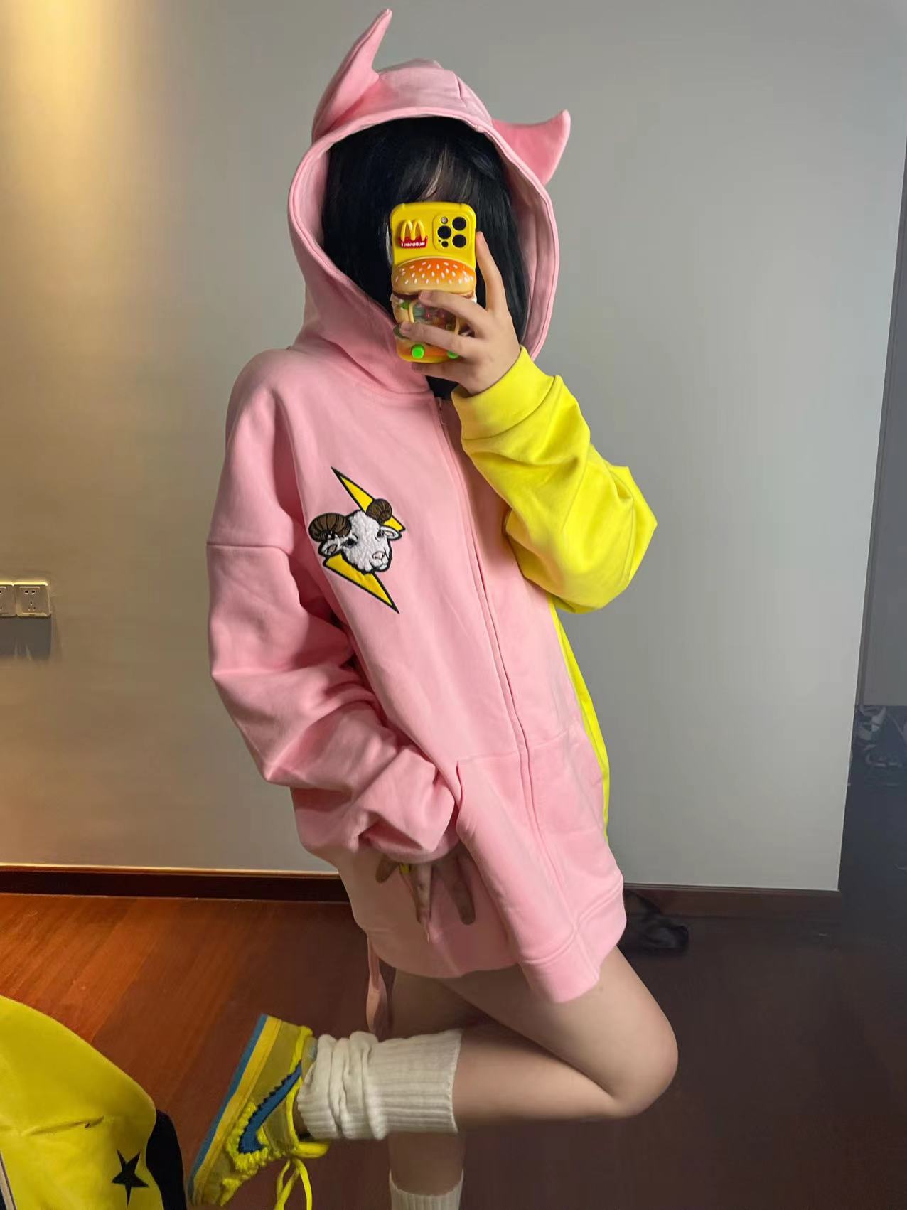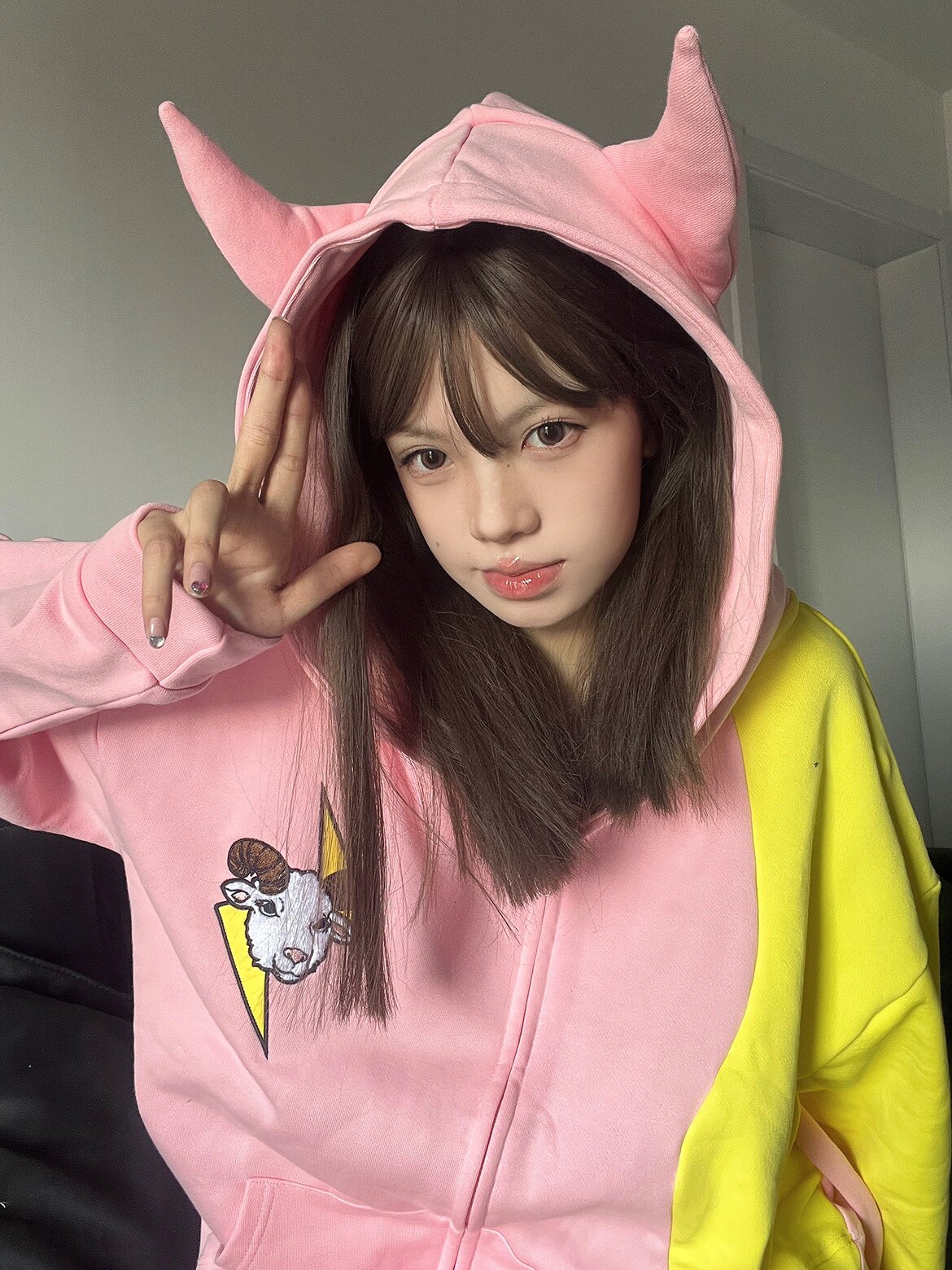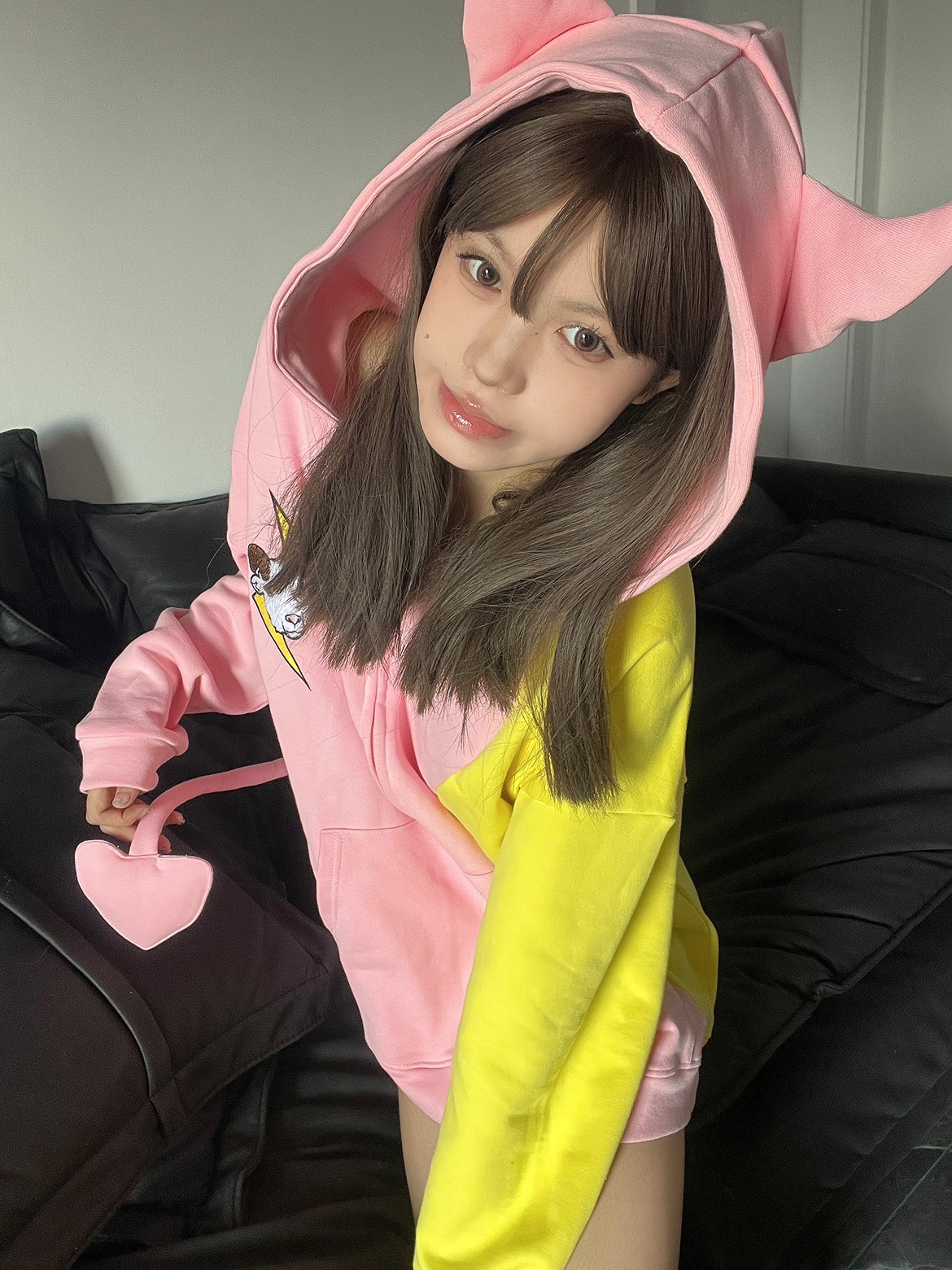 電次羊原創黃粉撞色寬鬆拼接小惡魔角刺繡連帽拉鍊可拆卸尾巴衛衣