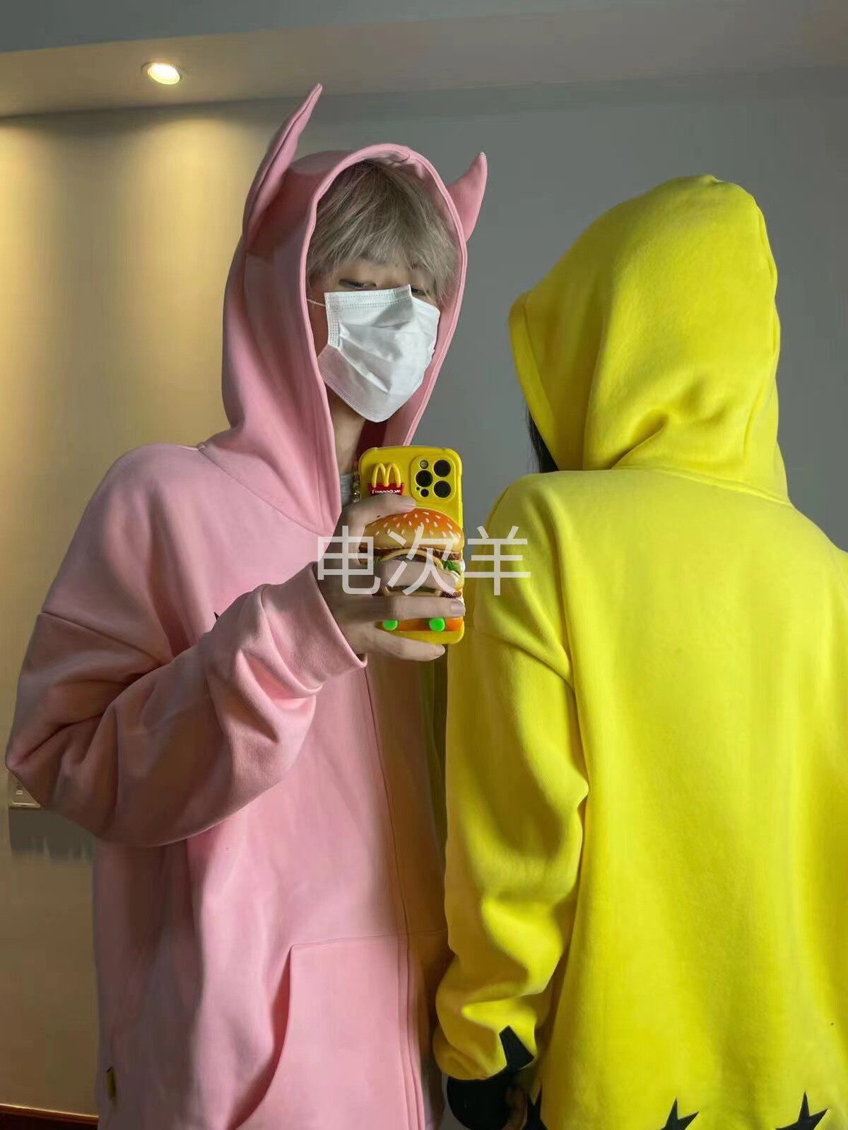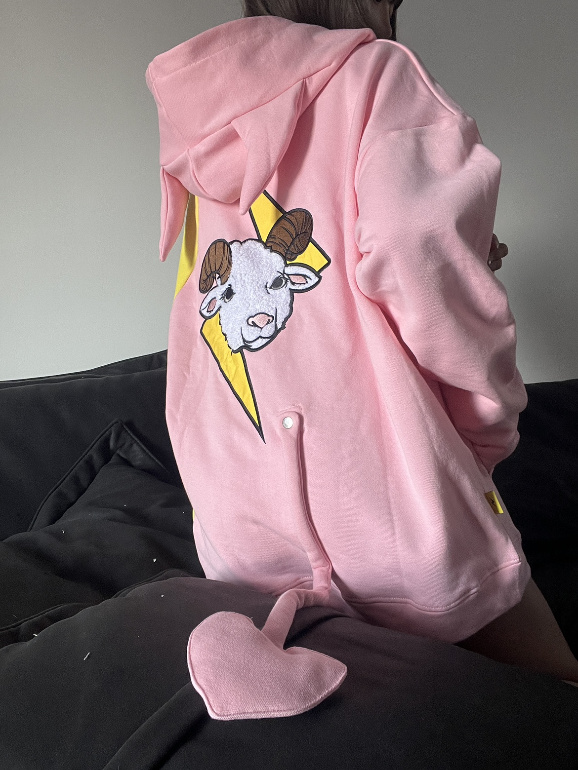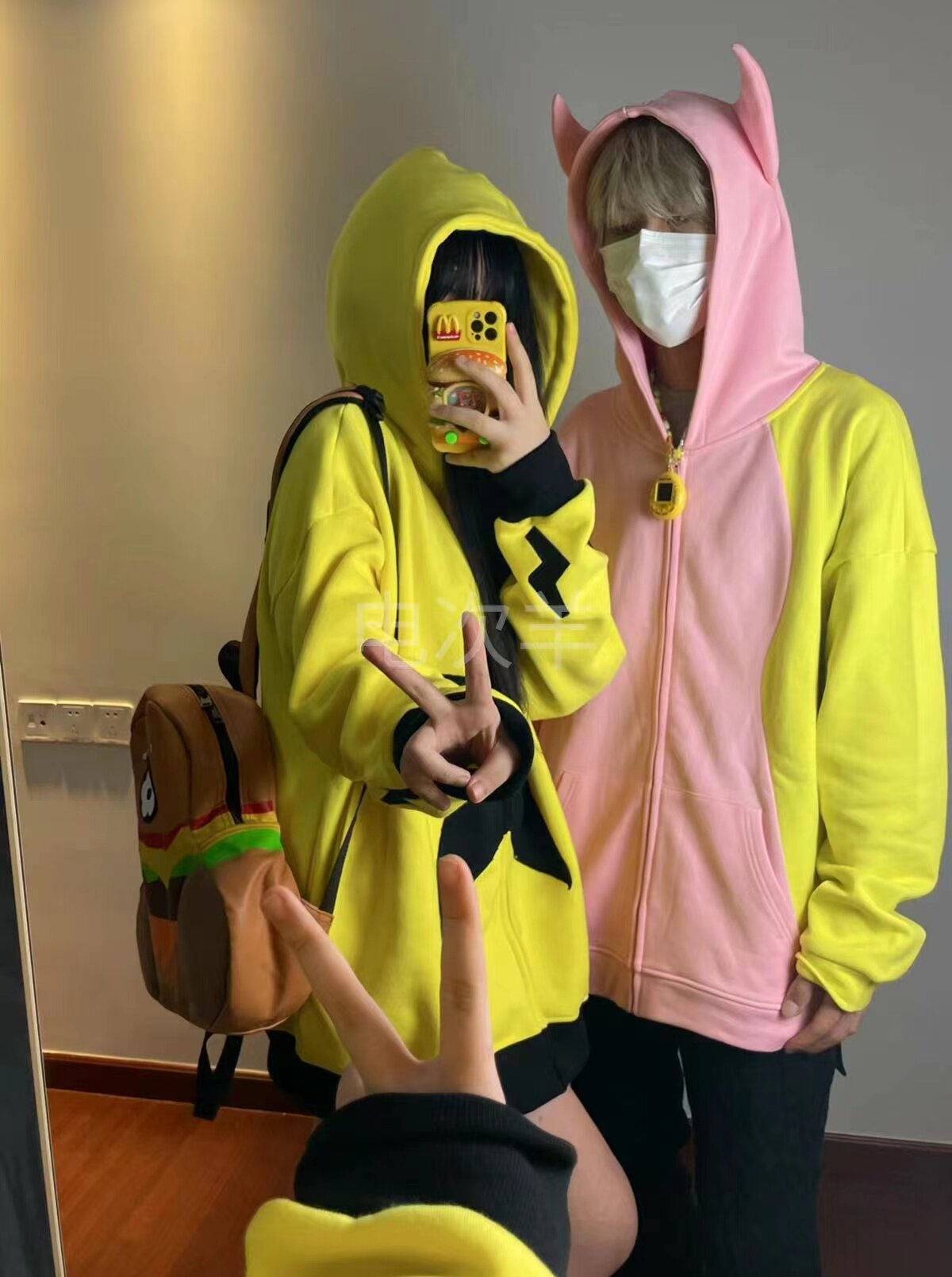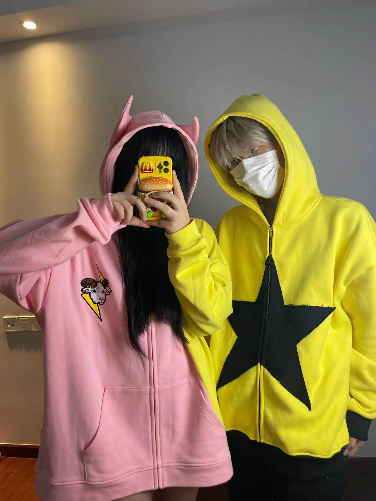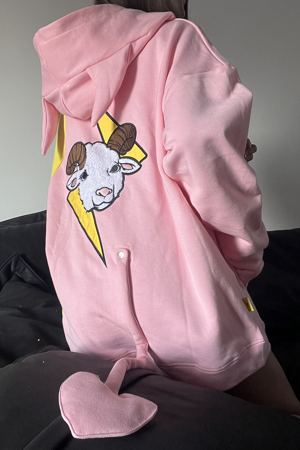 電次羊原創黃粉撞色寬鬆拼接小惡魔角刺繡連帽拉鍊可拆卸尾巴衛衣