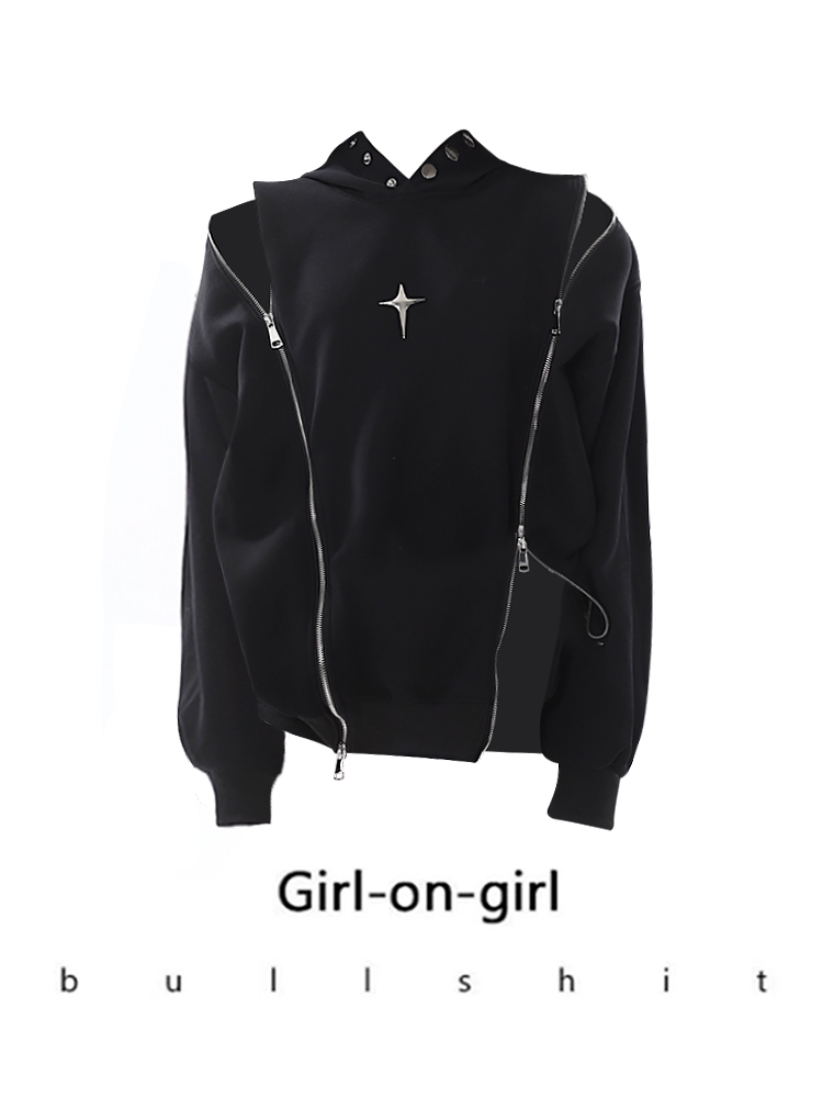 鬼馬 甜酷早秋新款小眾外套雙拉鍊鏤空帽衫設計感露肩連帽運動衫女