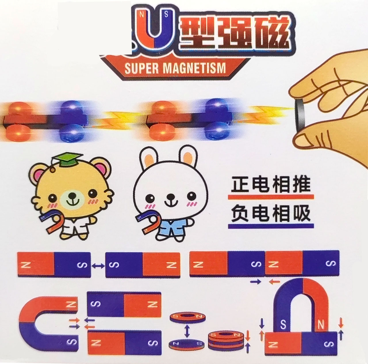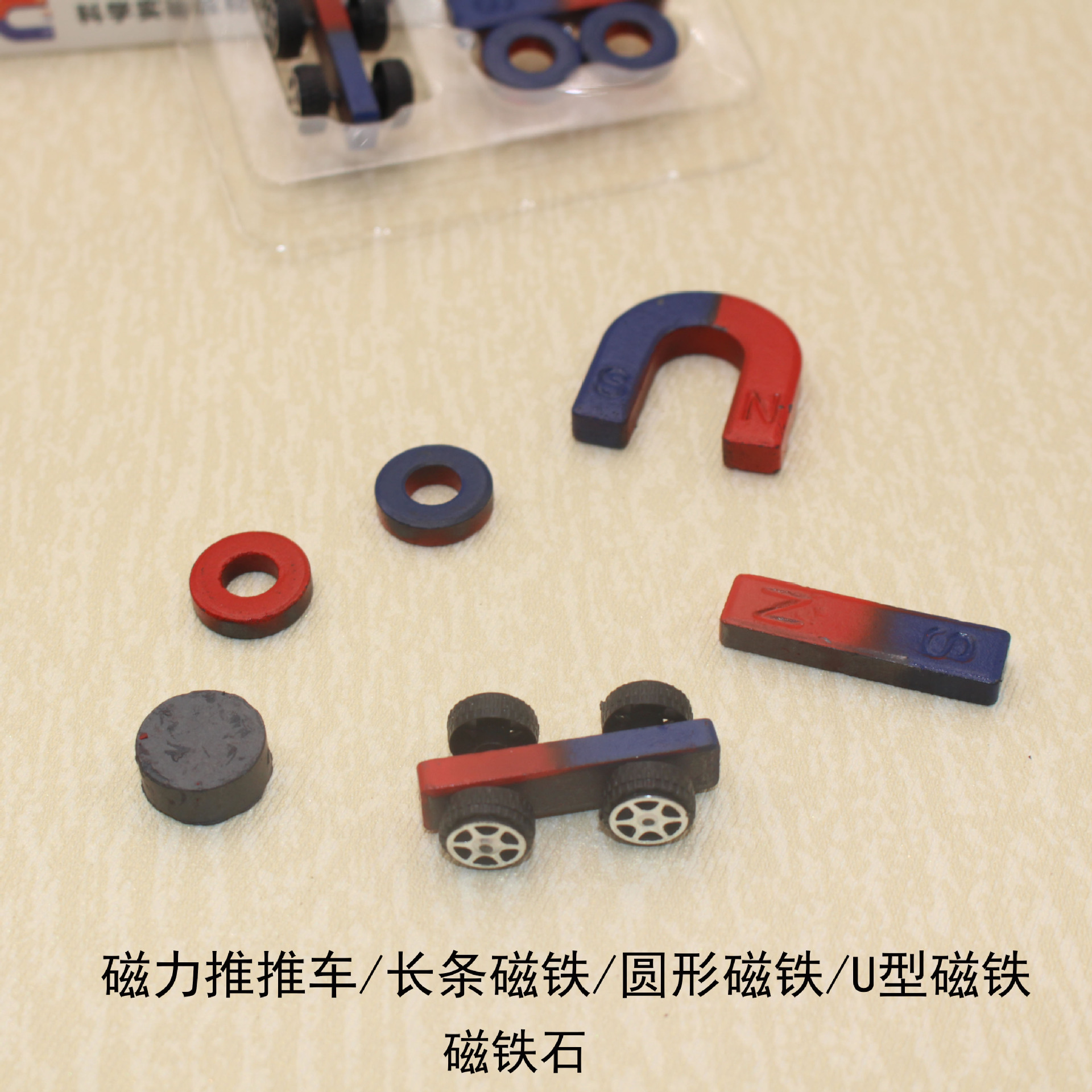 【包含】:磁力小车一个/长条磁铁一个/U型磁铁一个/圆形磁铁2个/圆形吸铁石一个