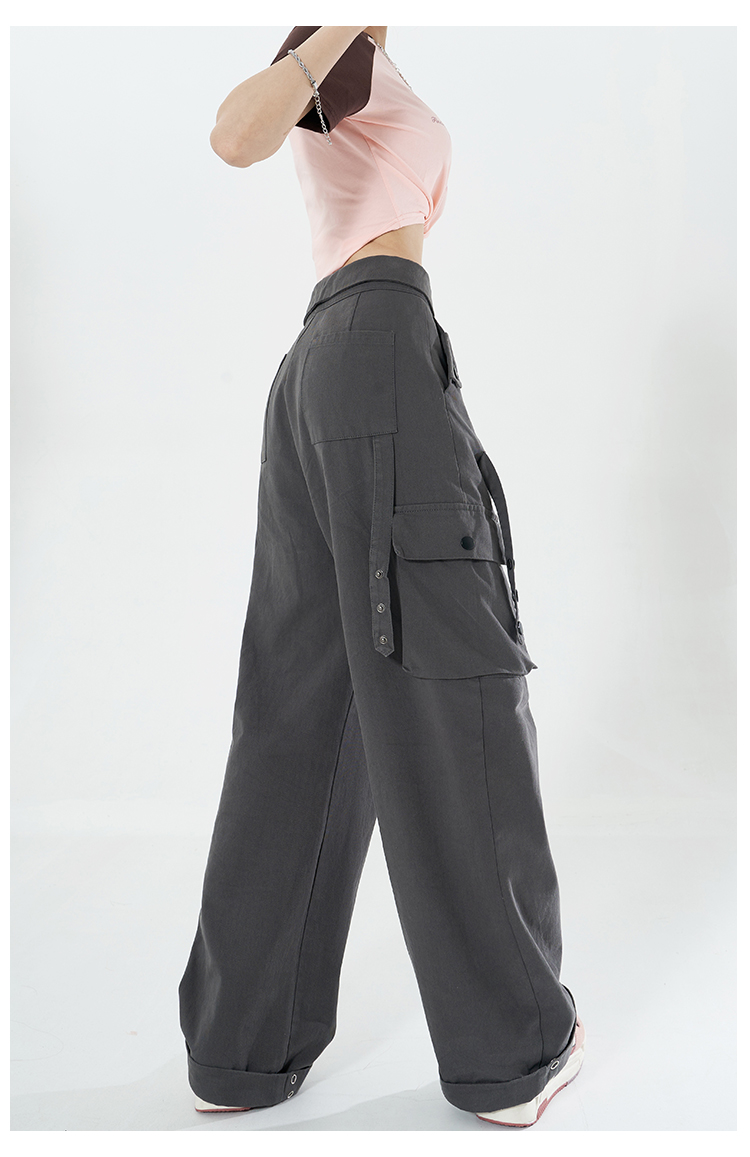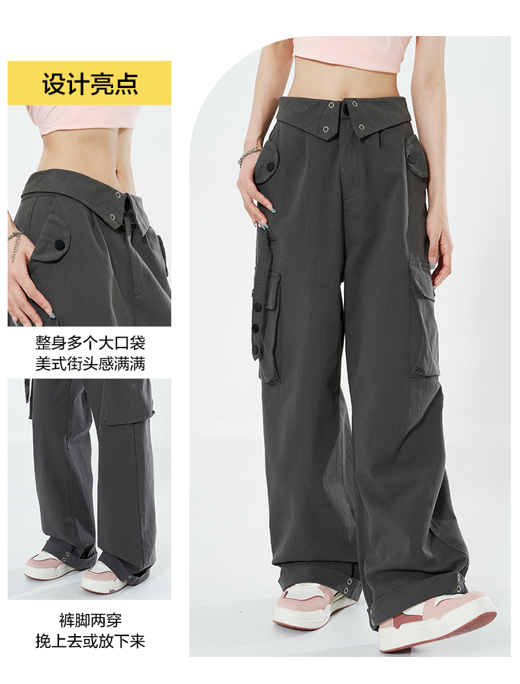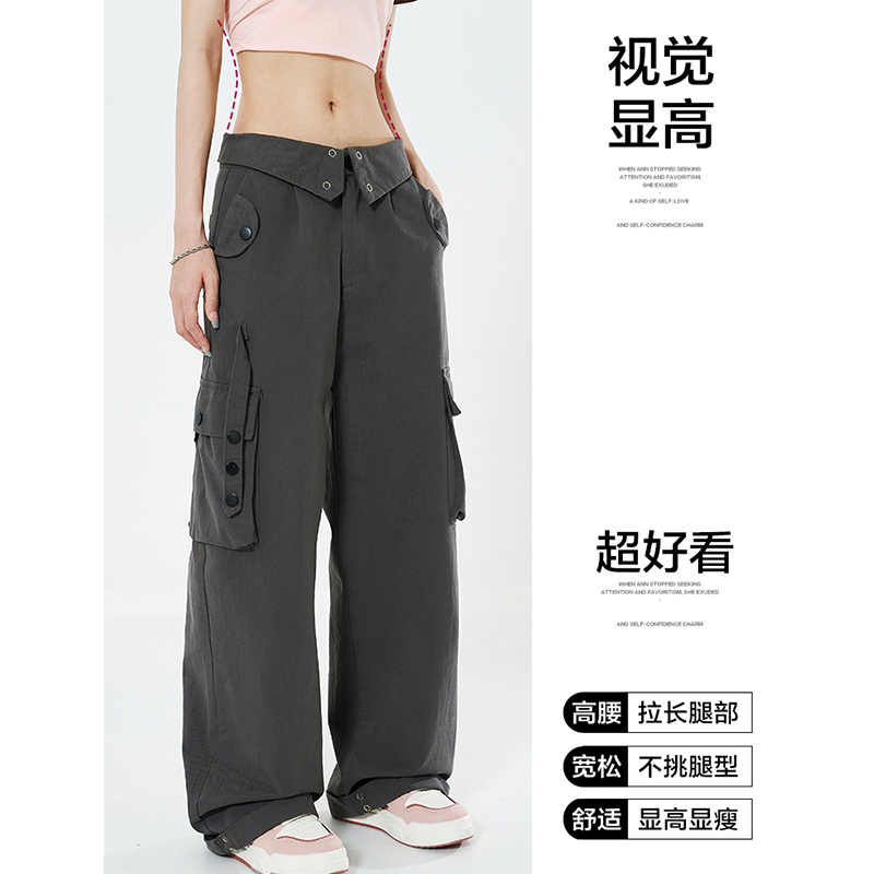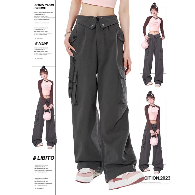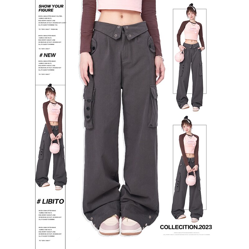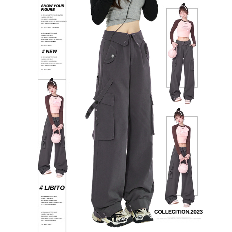 Libito秋季美式高腰工裝褲女辣妹休閒寬褲2023新款灰色褲子夏天