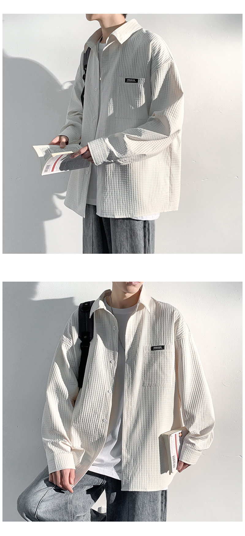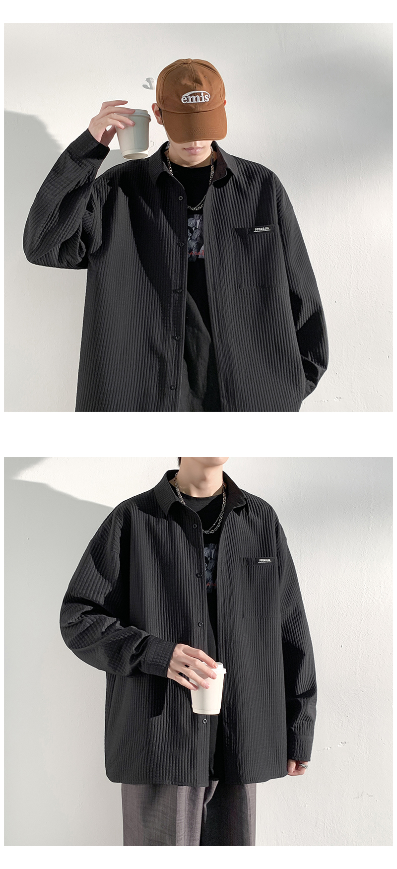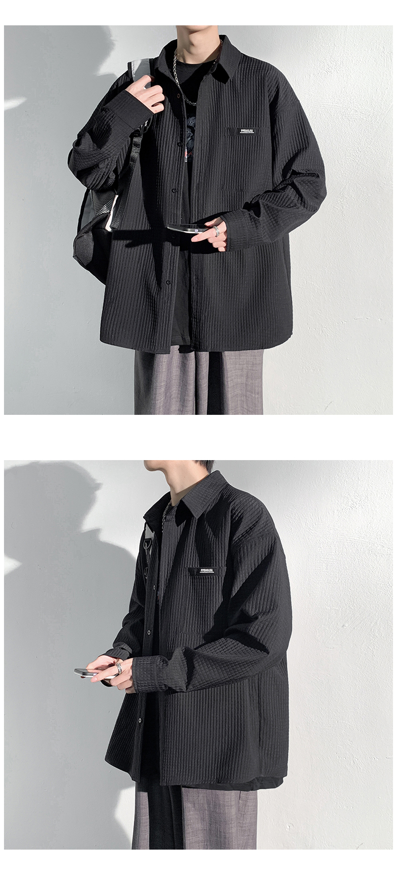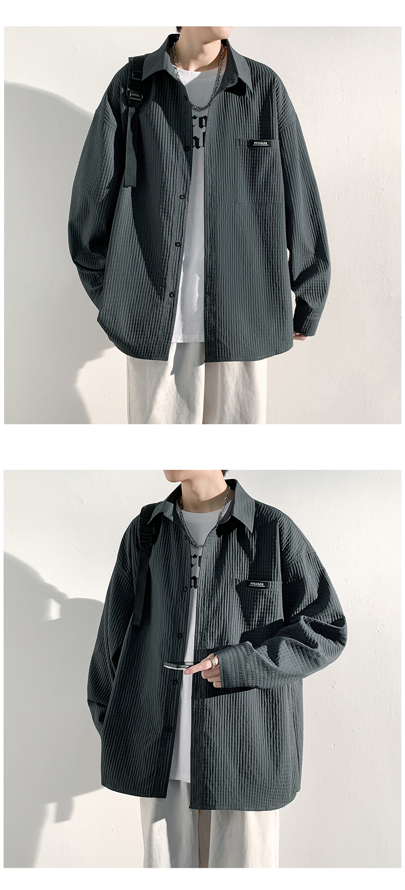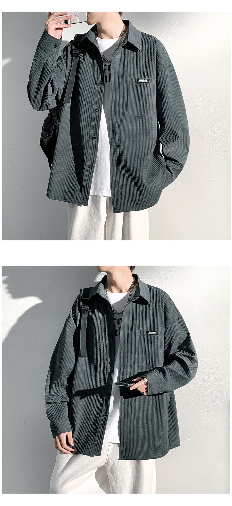 華夫格長袖襯衫男ins港風痞帥工裝襯衣外套寬鬆情侶潮流休閒衣服