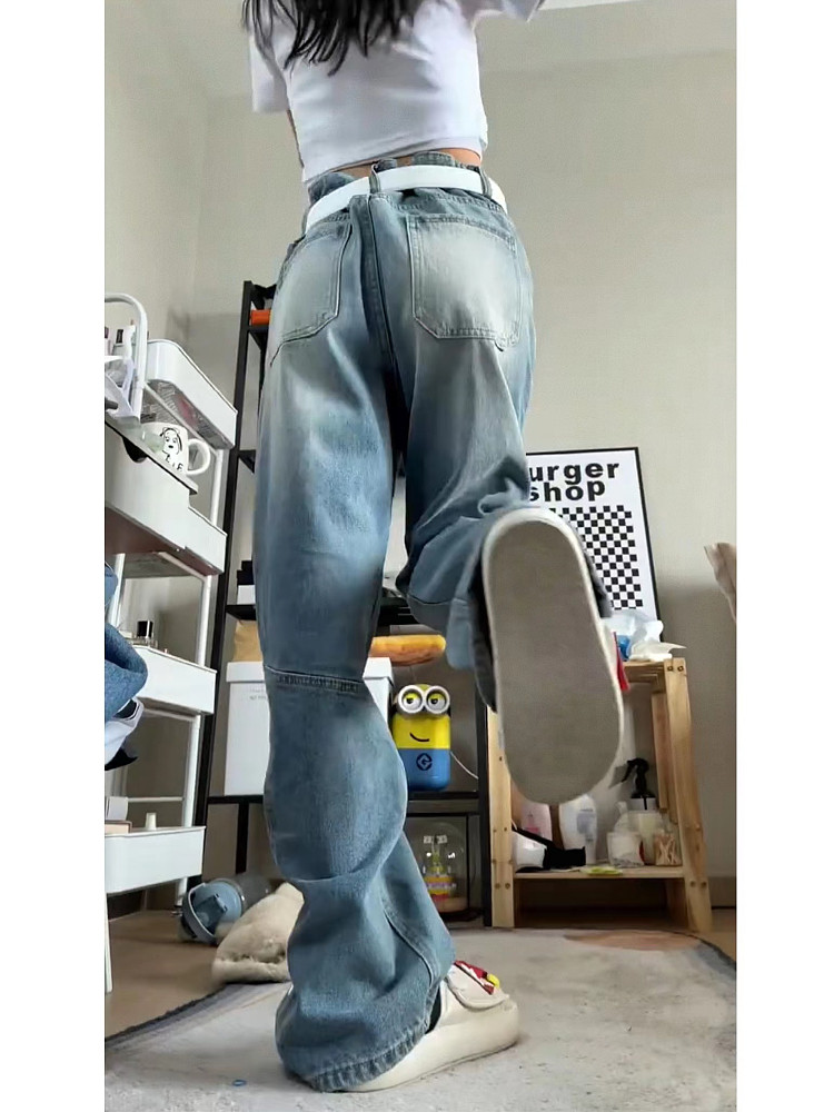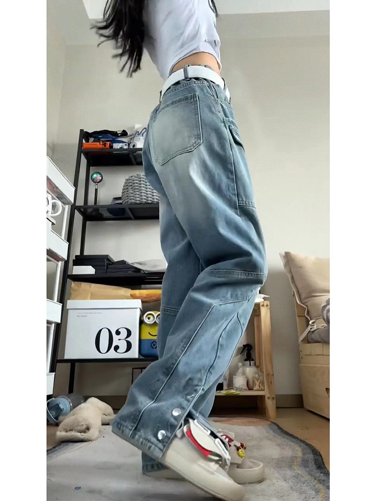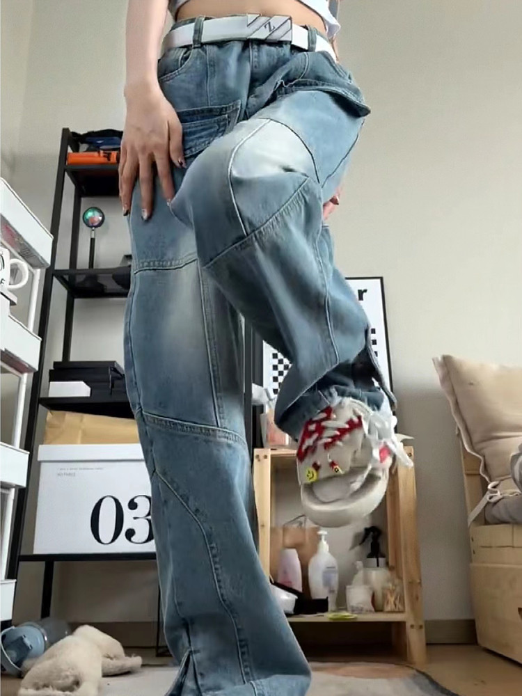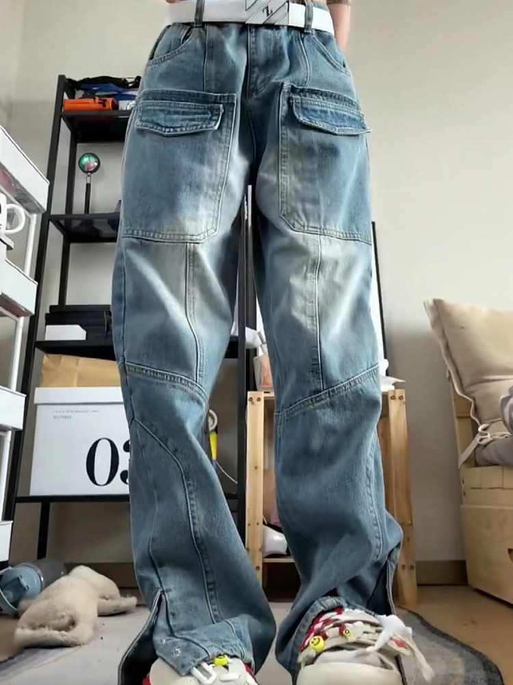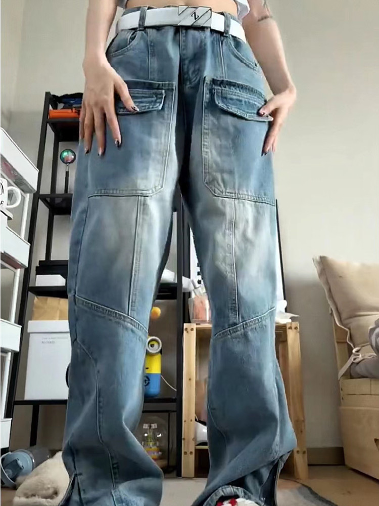 美式vibe復古工裝牛仔褲女高街hiphop多口袋設計感寬鬆直筒寬褲