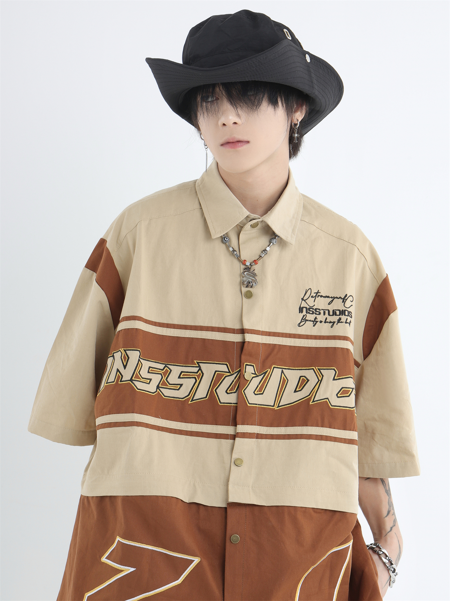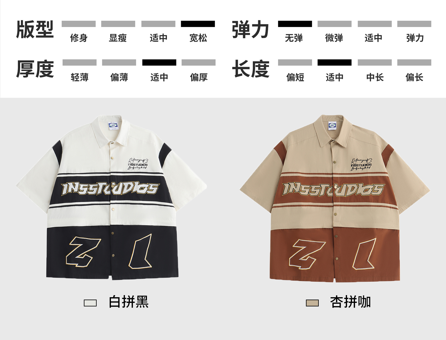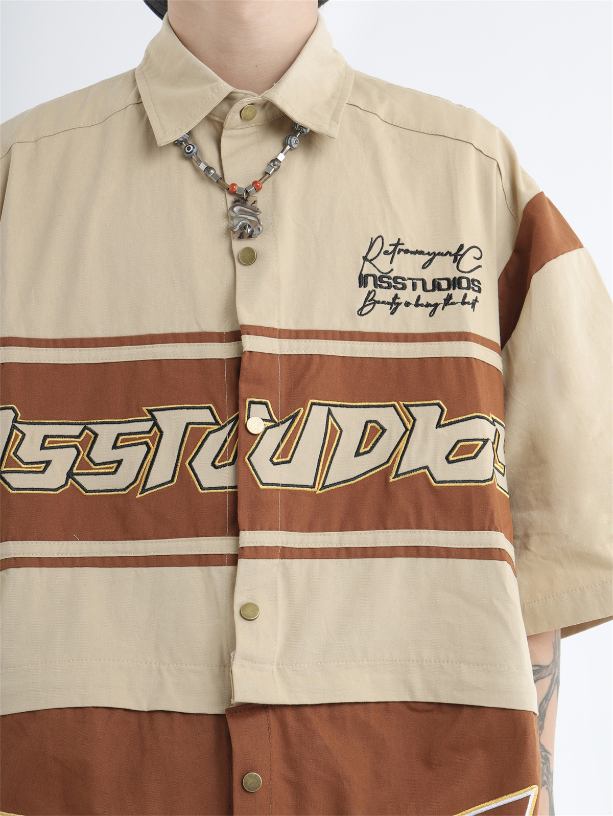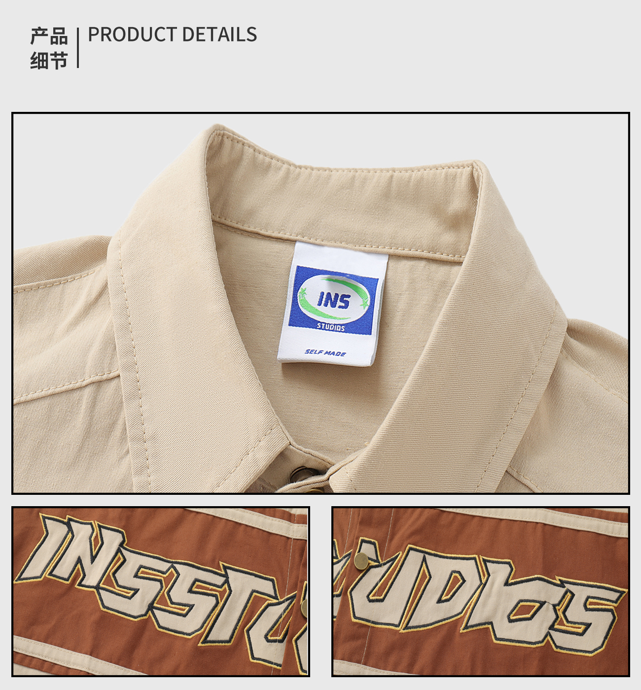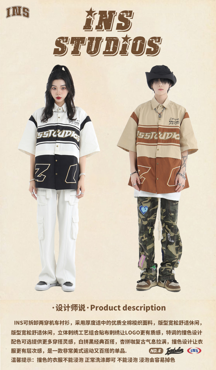 INSstudios 可拆卸兩穿機車襯衫自制國潮情侶美式復古短袖襯衫男