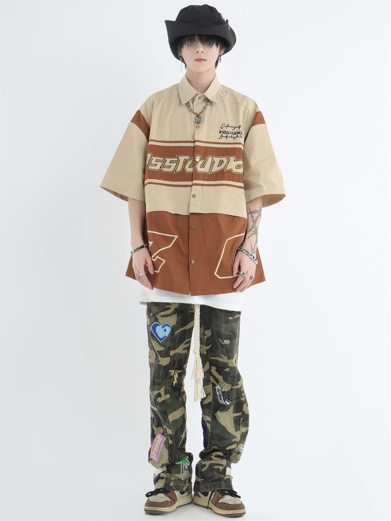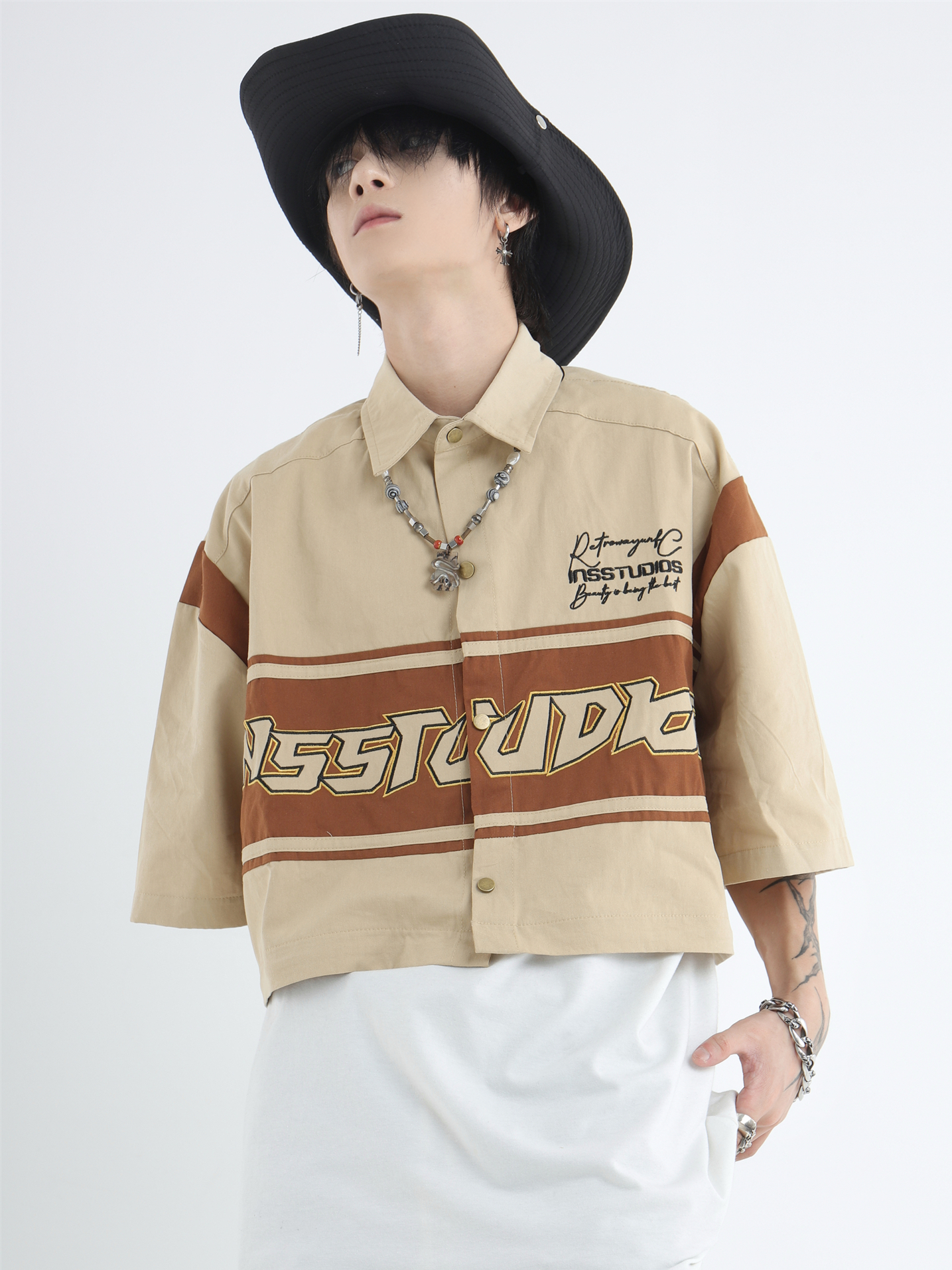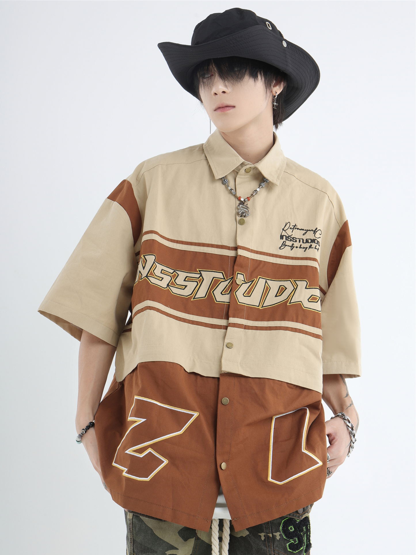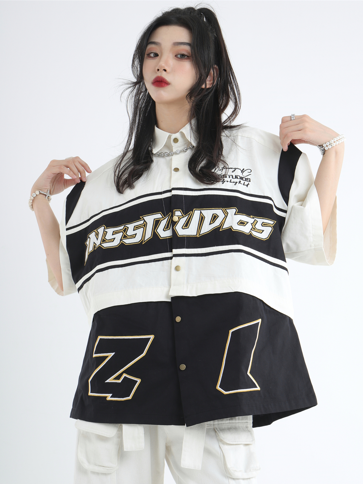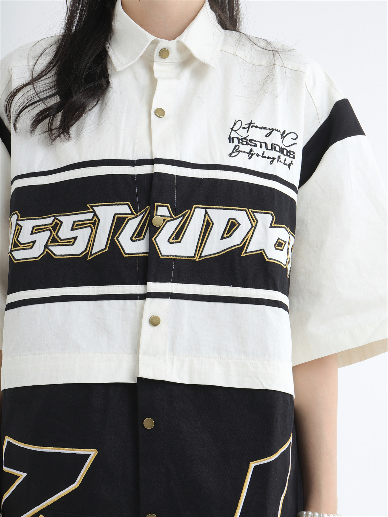 INSstudios 可拆卸兩穿機車襯衫自制國潮情侶美式復古短袖襯衫男