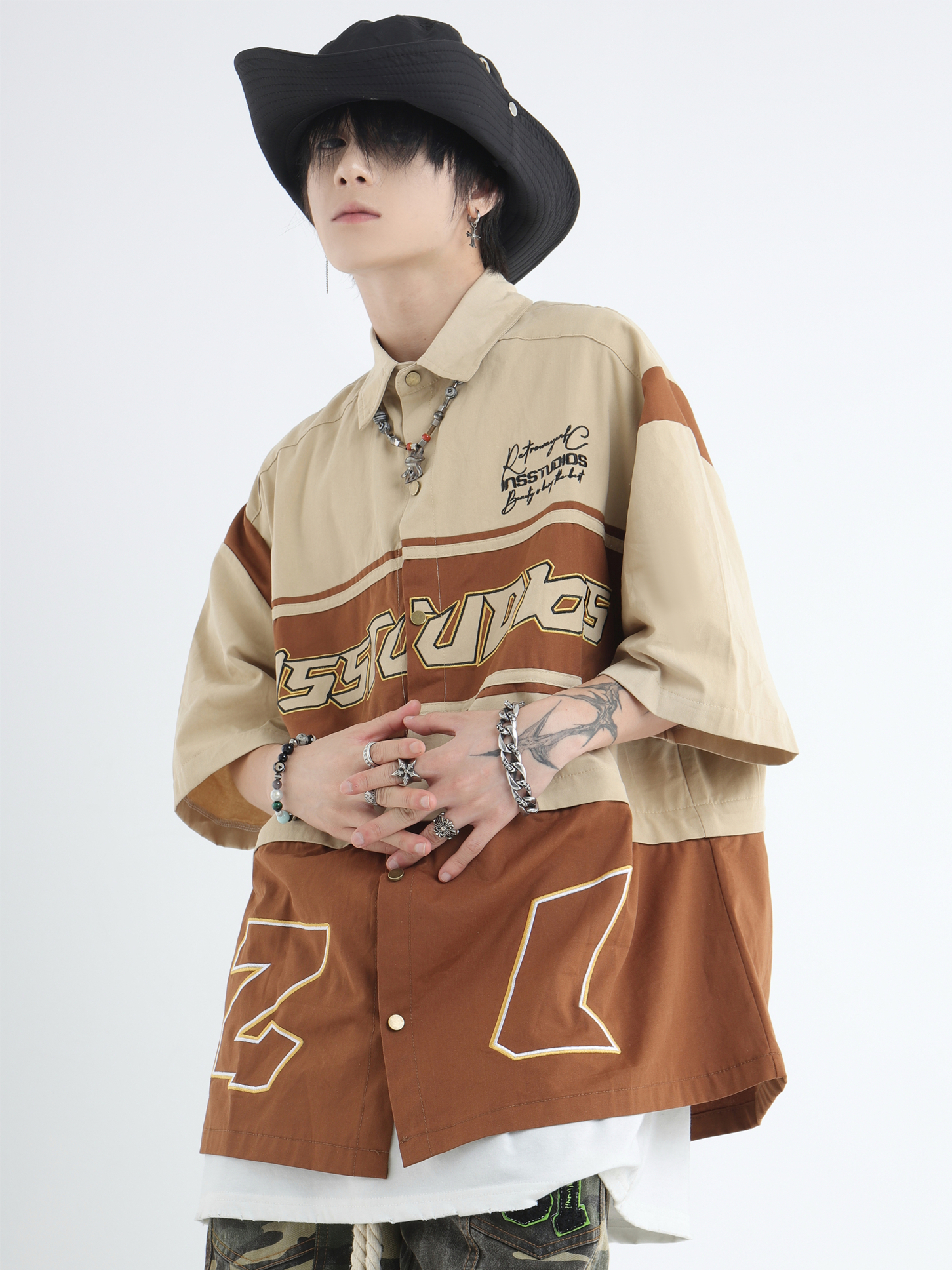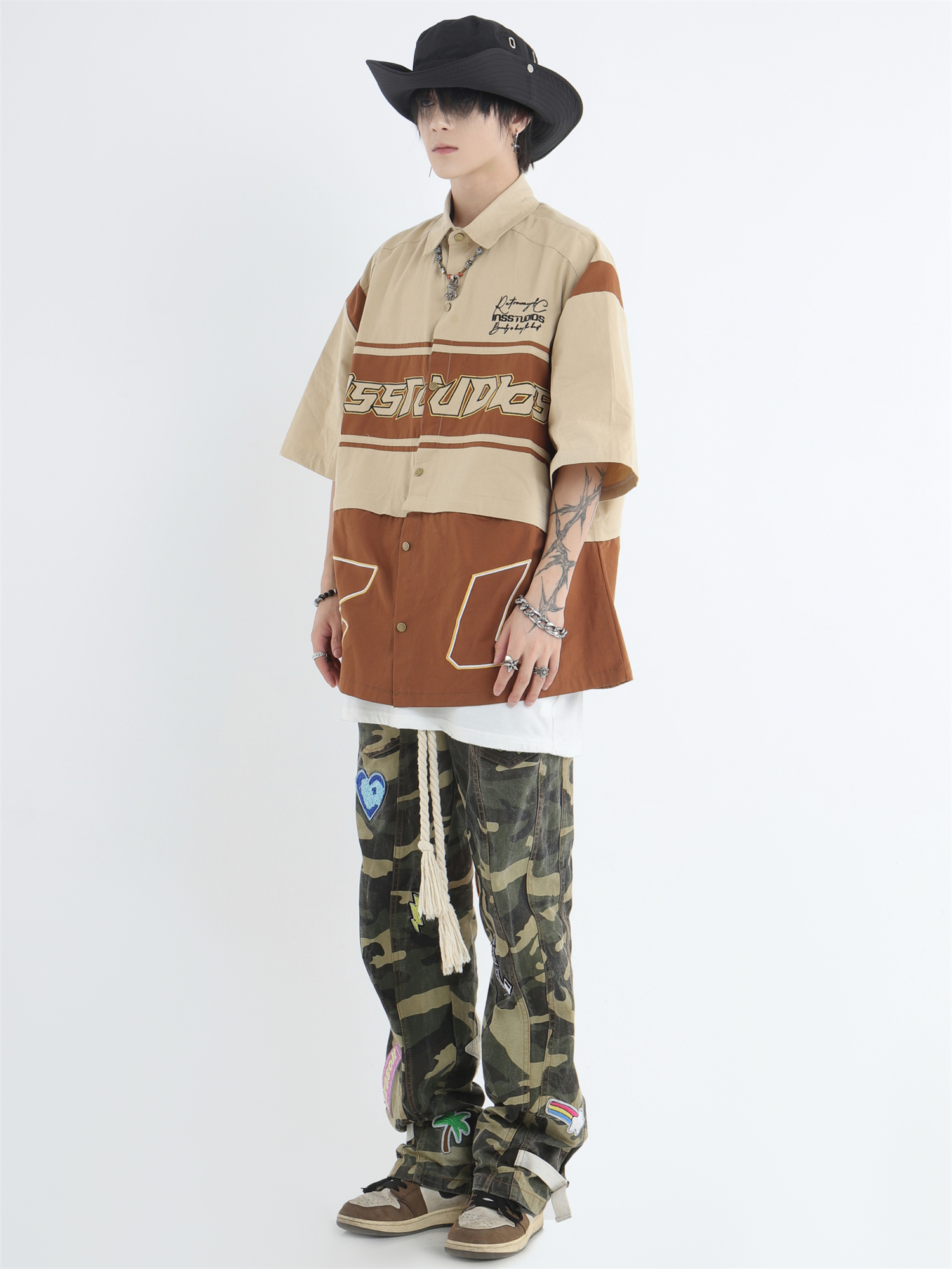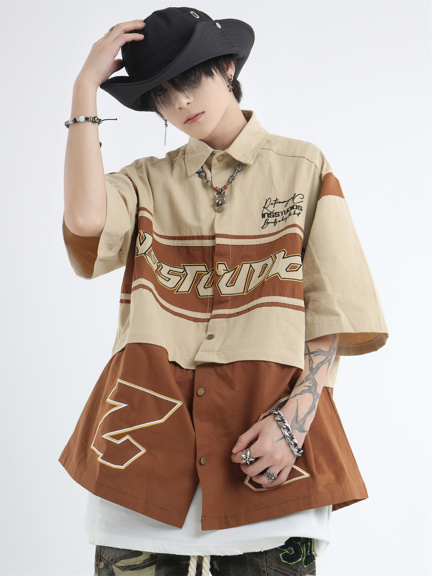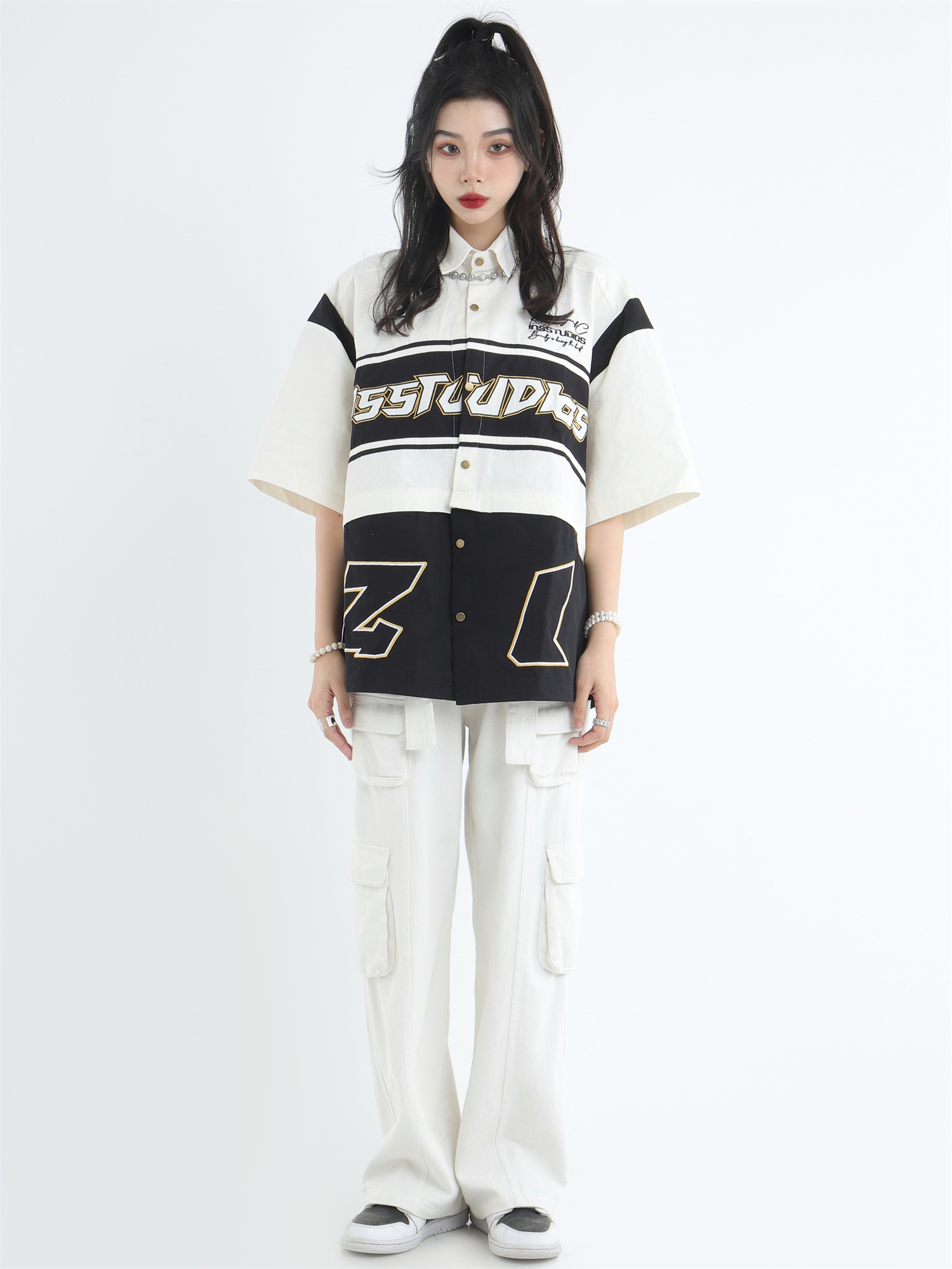 INSstudios 可拆卸兩穿機車襯衫自制國潮情侶美式復古短袖襯衫男
