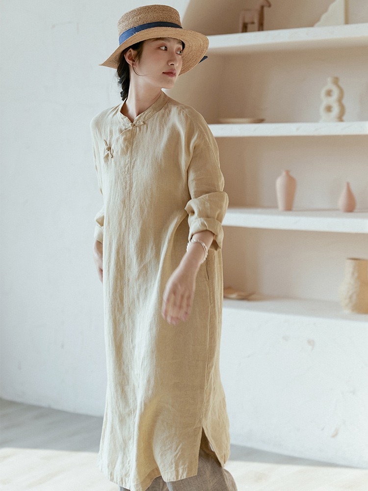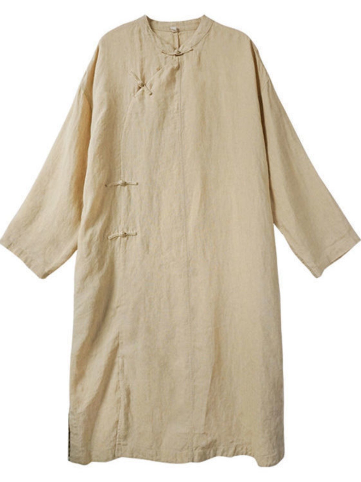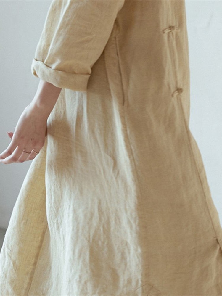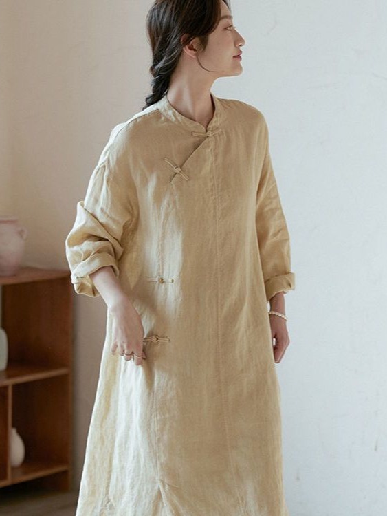 秋季優雅復古風改良版斜襟盤扣洋裝中長一片式簡約卡其日常氣質