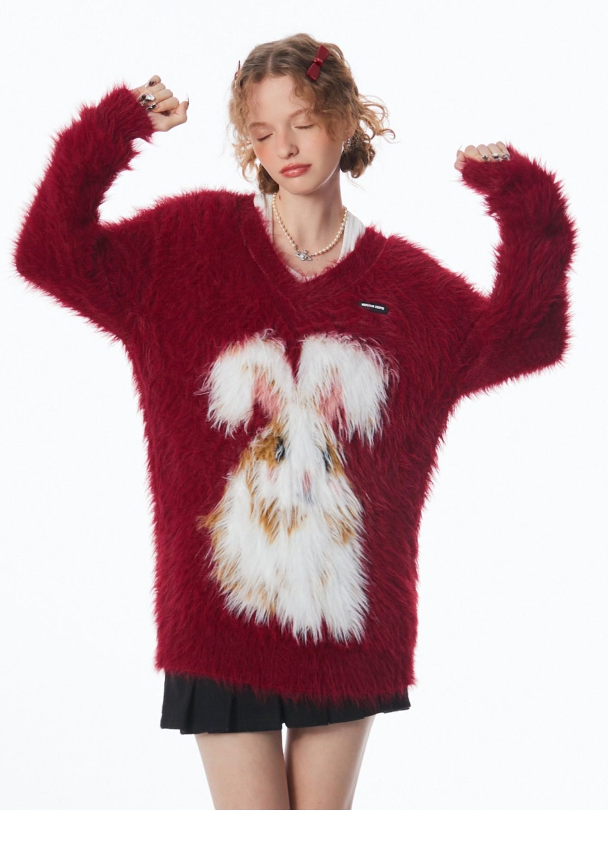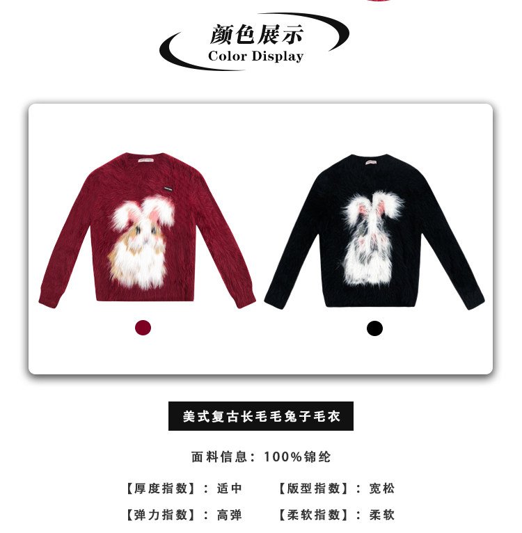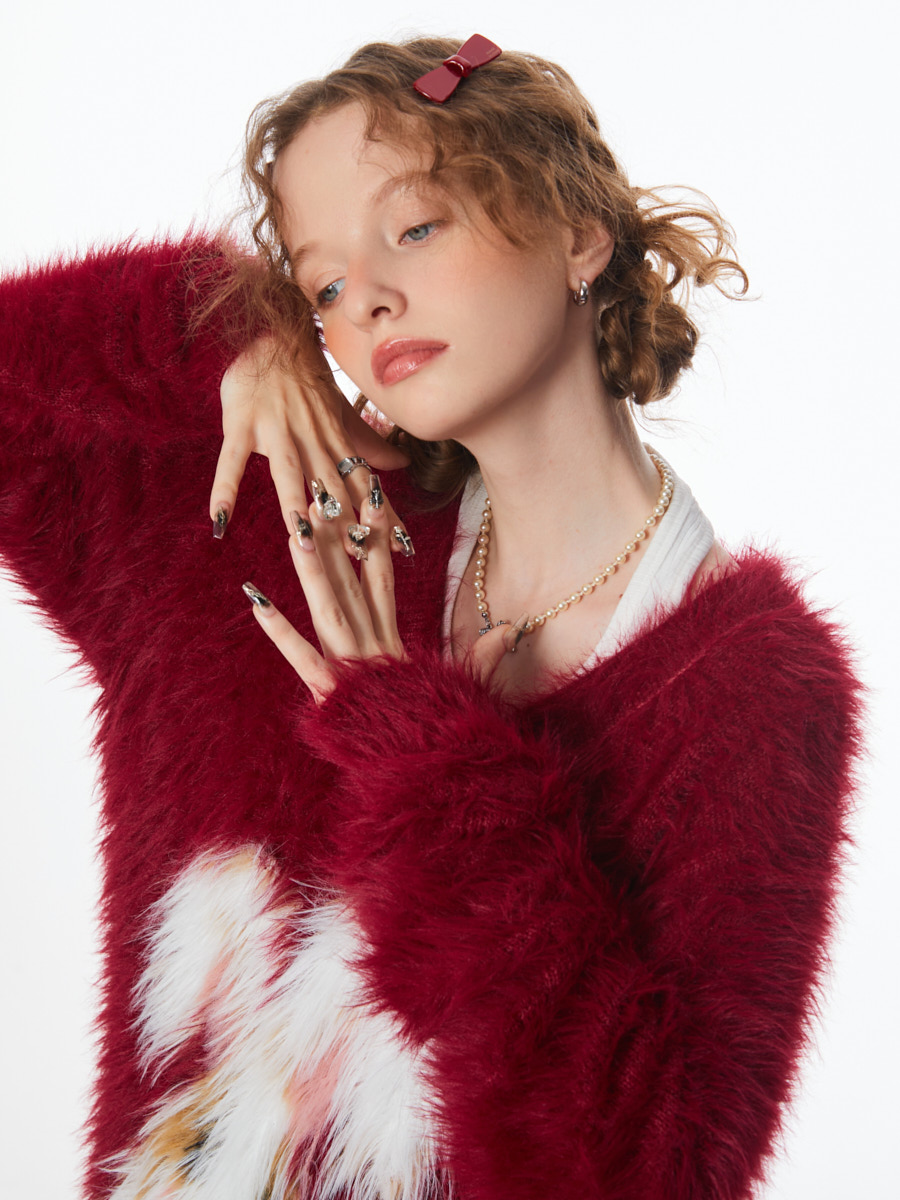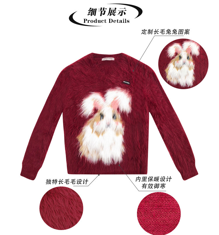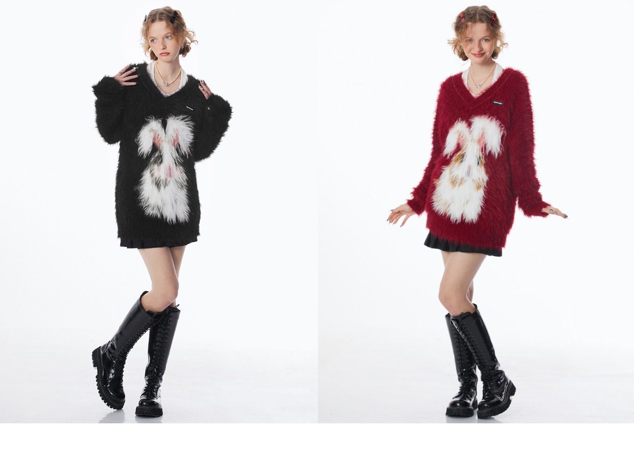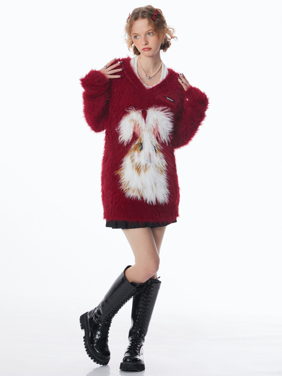 ziziFei秋冬季美式復古新年過年耶誕紅色高級感兔子V領毛毛衣女