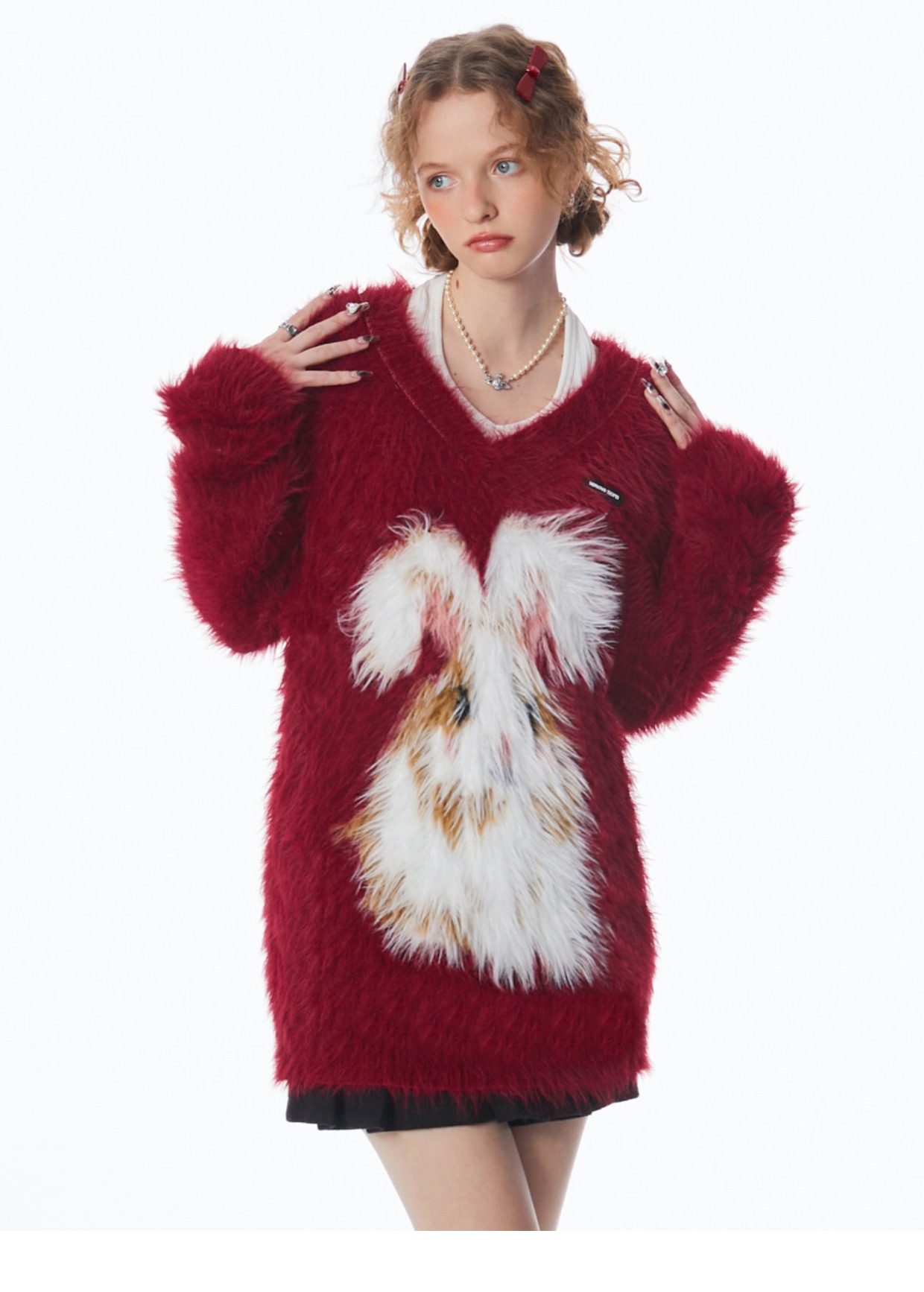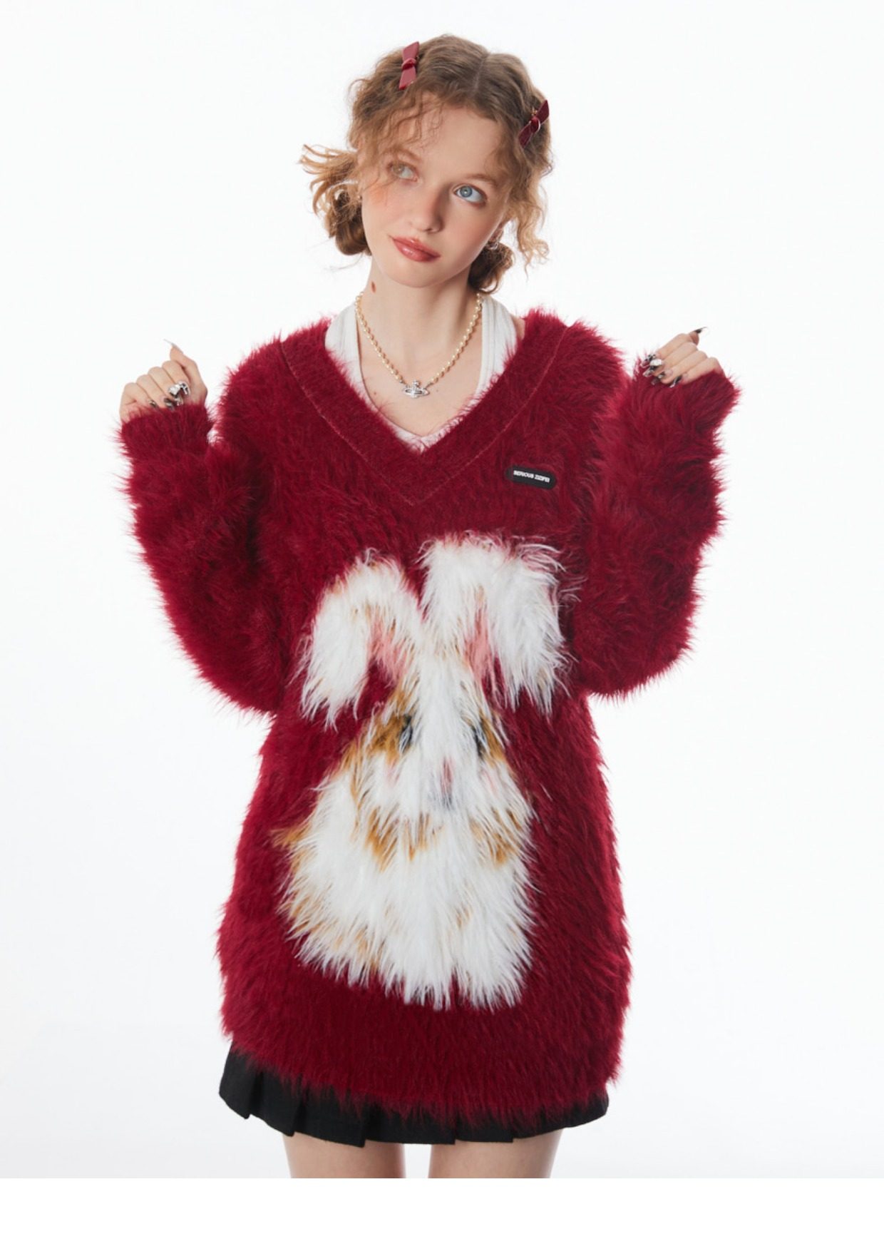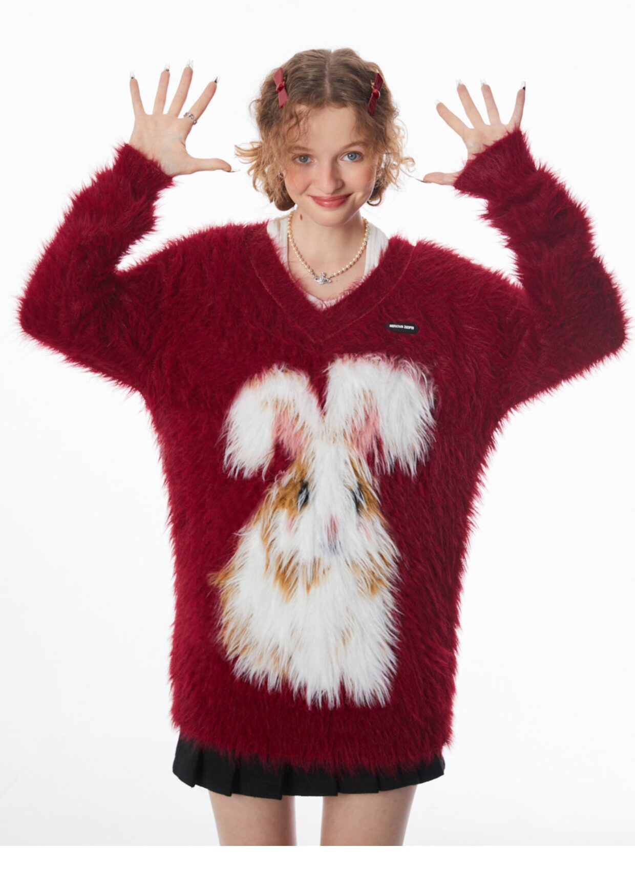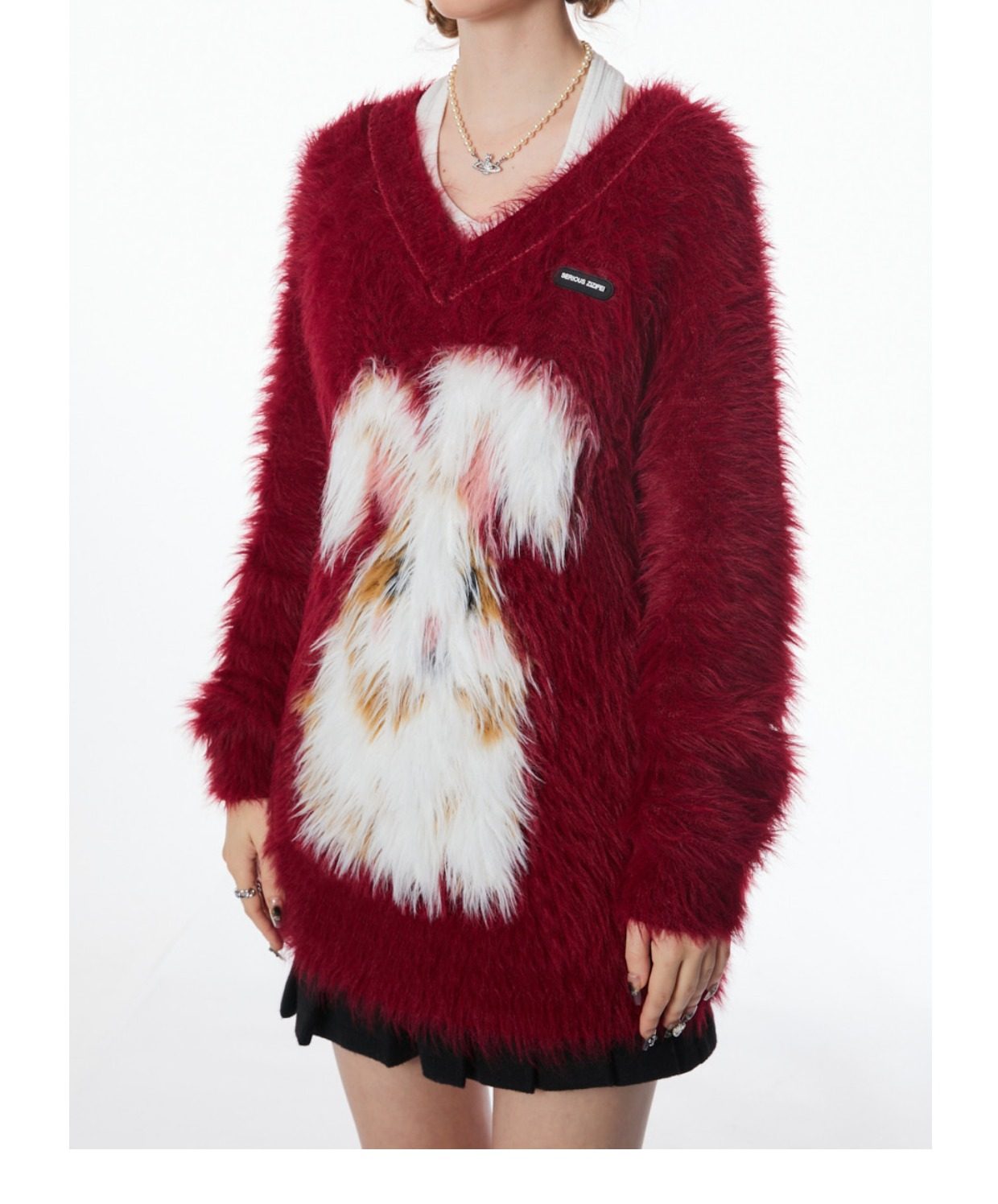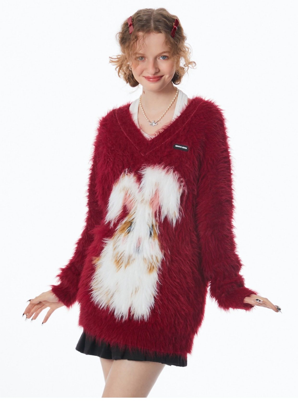 ziziFei秋冬季美式復古新年過年耶誕紅色高級感兔子V領毛毛衣女
