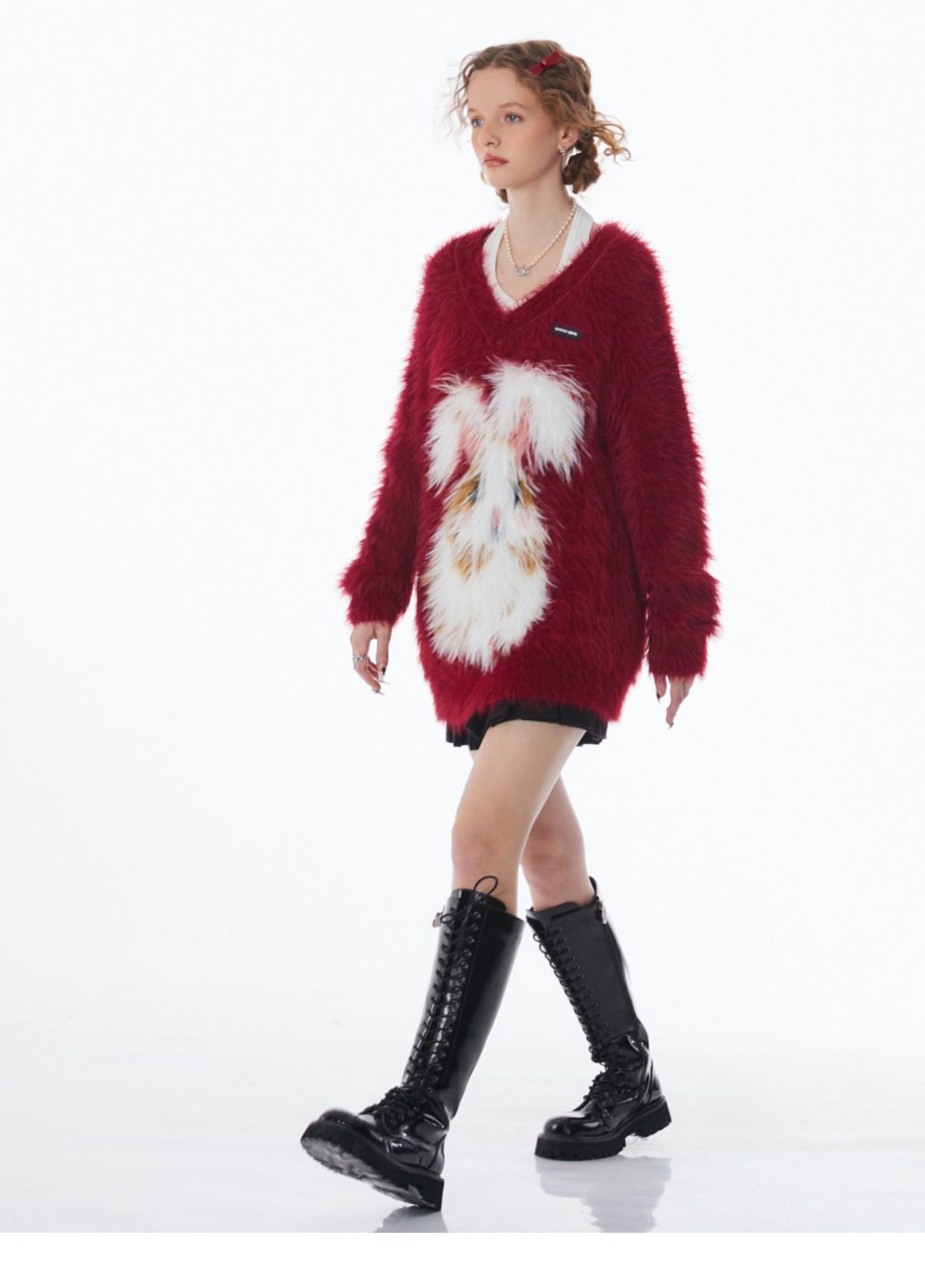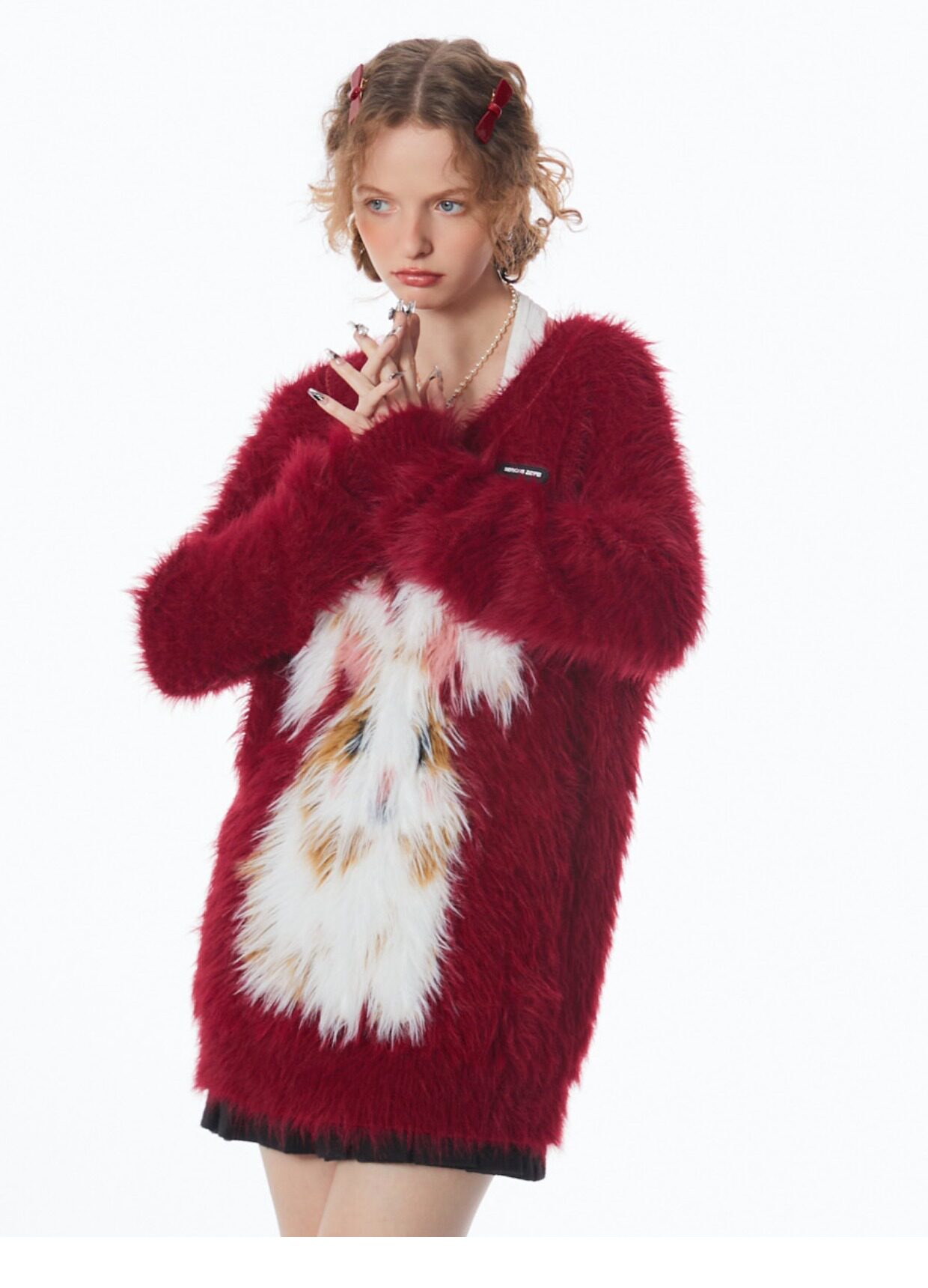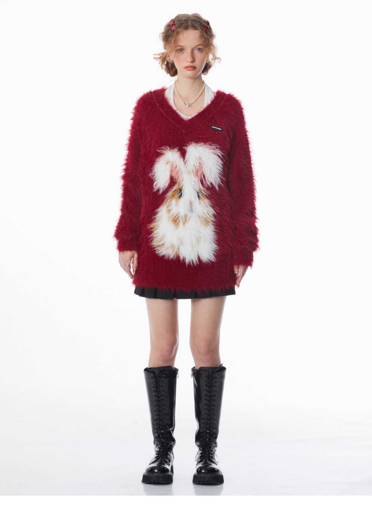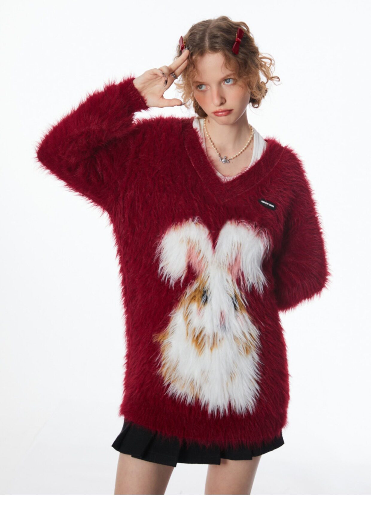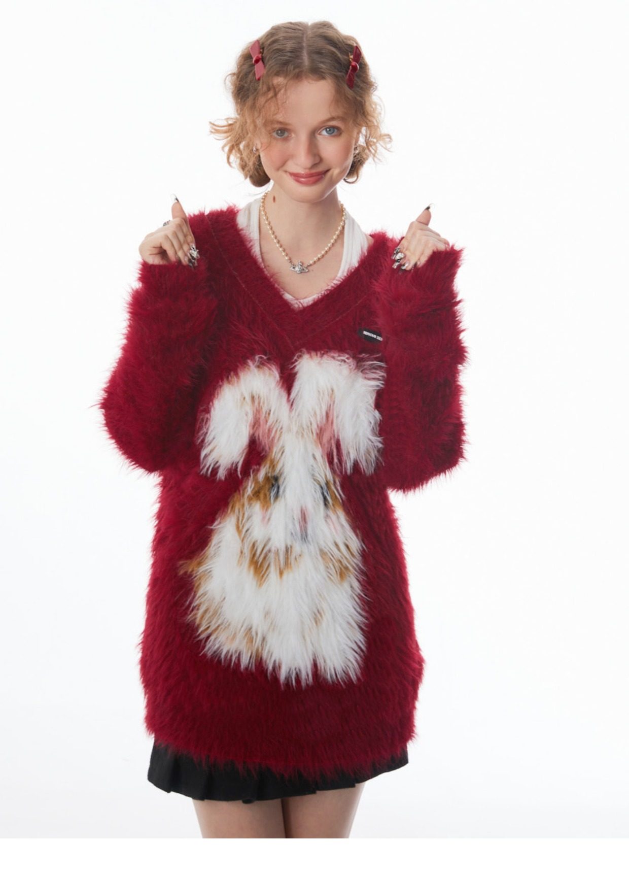 ziziFei秋冬季美式復古新年過年耶誕紅色高級感兔子V領毛毛衣女