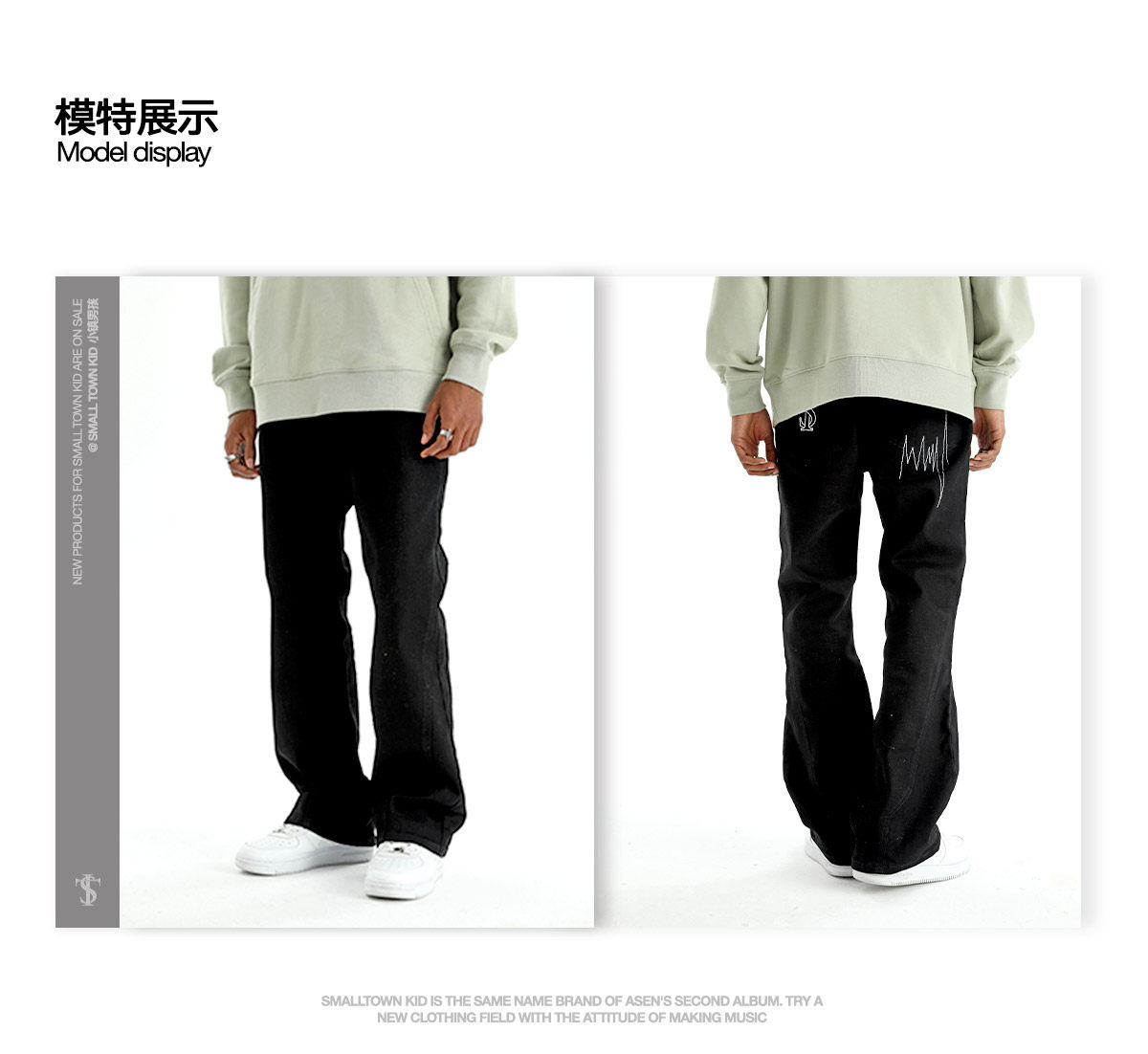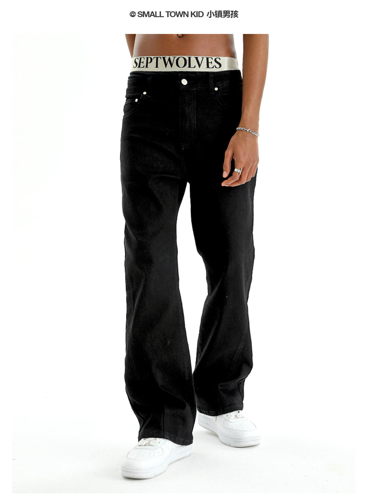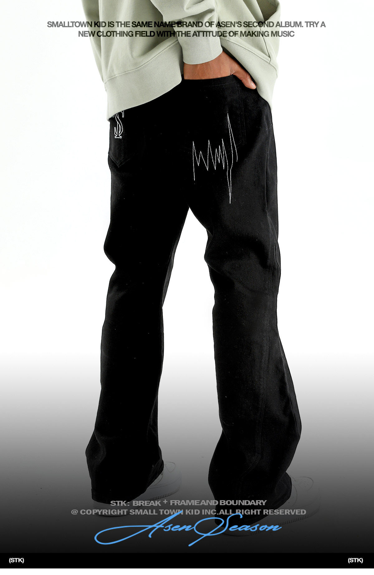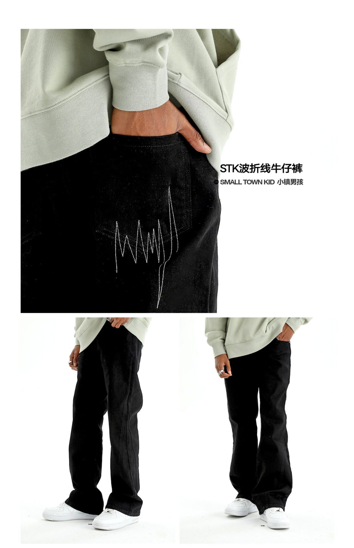 STK SmallTownKid 嘻哈潮牌波折線牛仔褲解構微喇叭水洗褲男女款