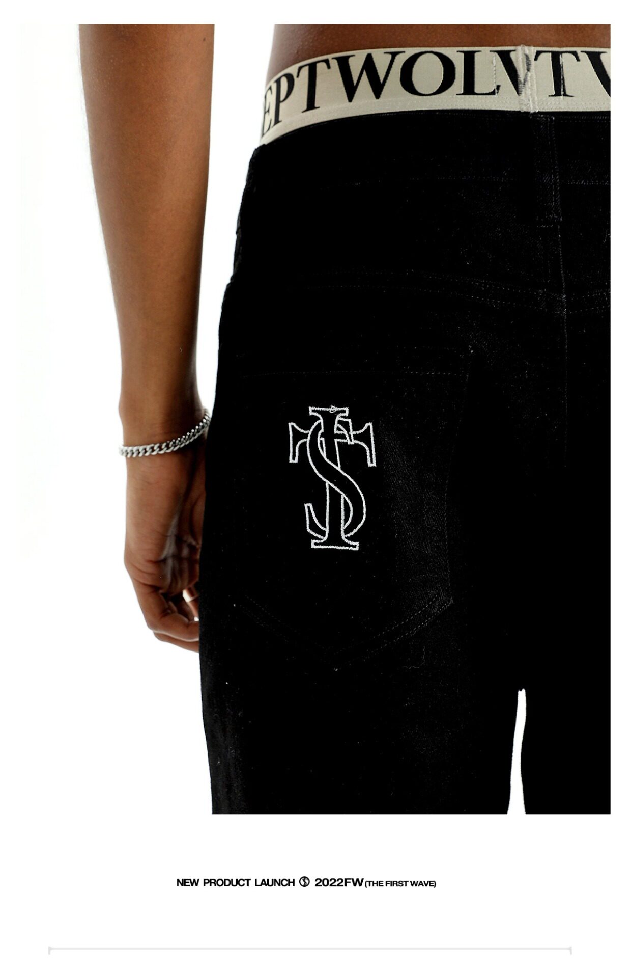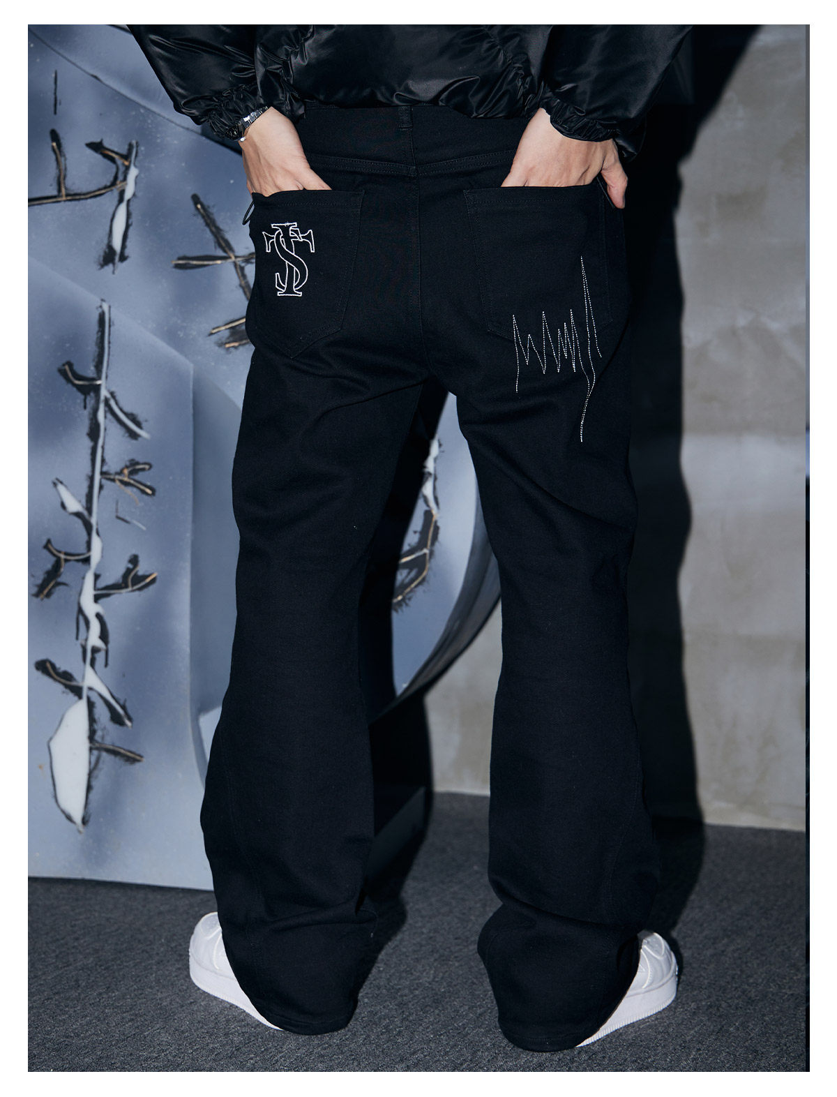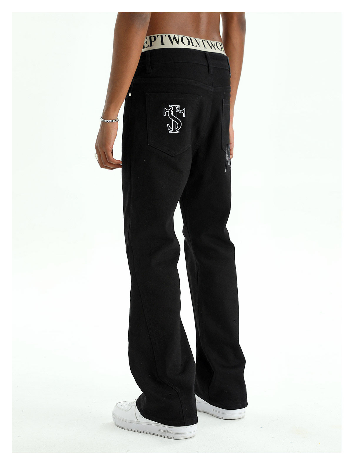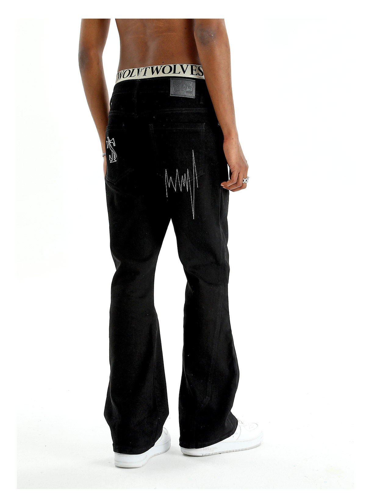 STK SmallTownKid 嘻哈潮牌波折線牛仔褲解構微喇叭水洗褲男女款