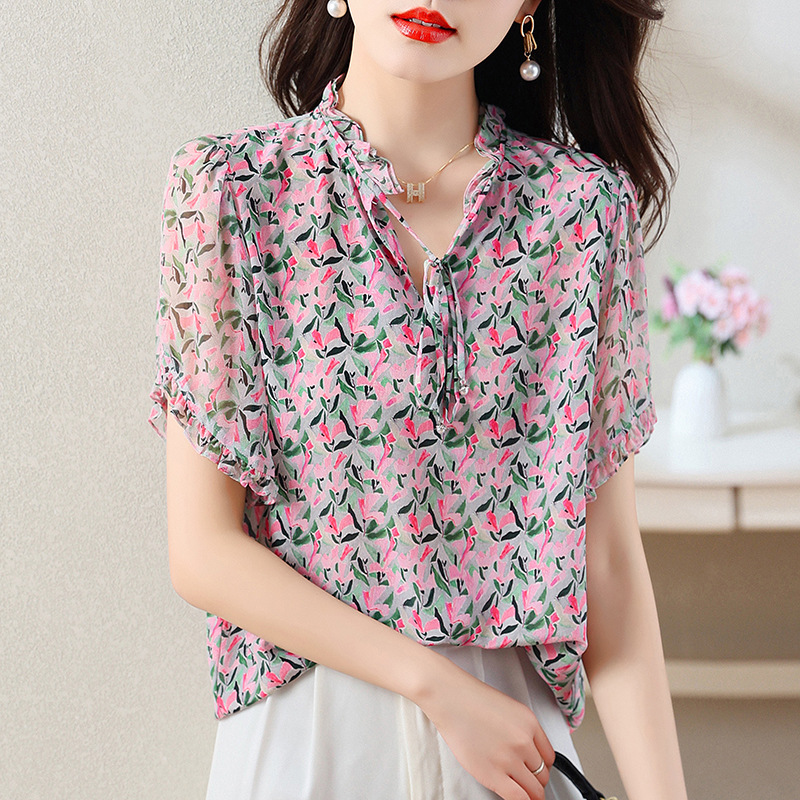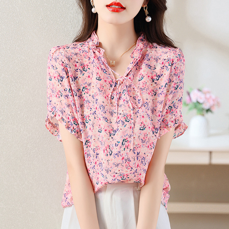 女士真丝衬衫2023夏季时尚年轻款小众设计感碎花洋气桑蚕丝小衫