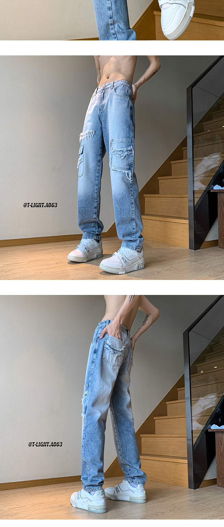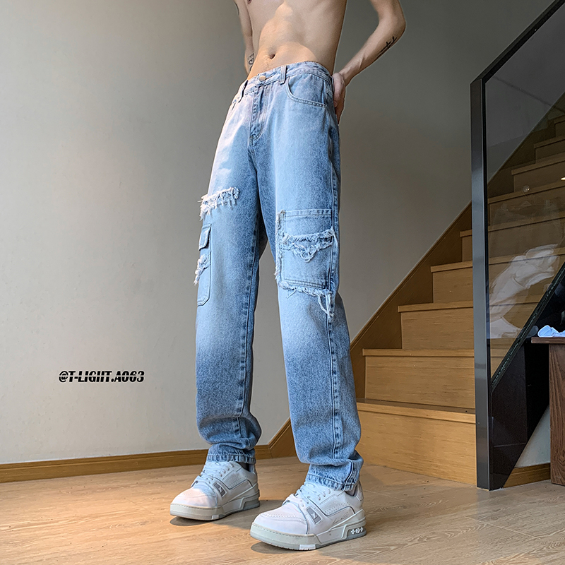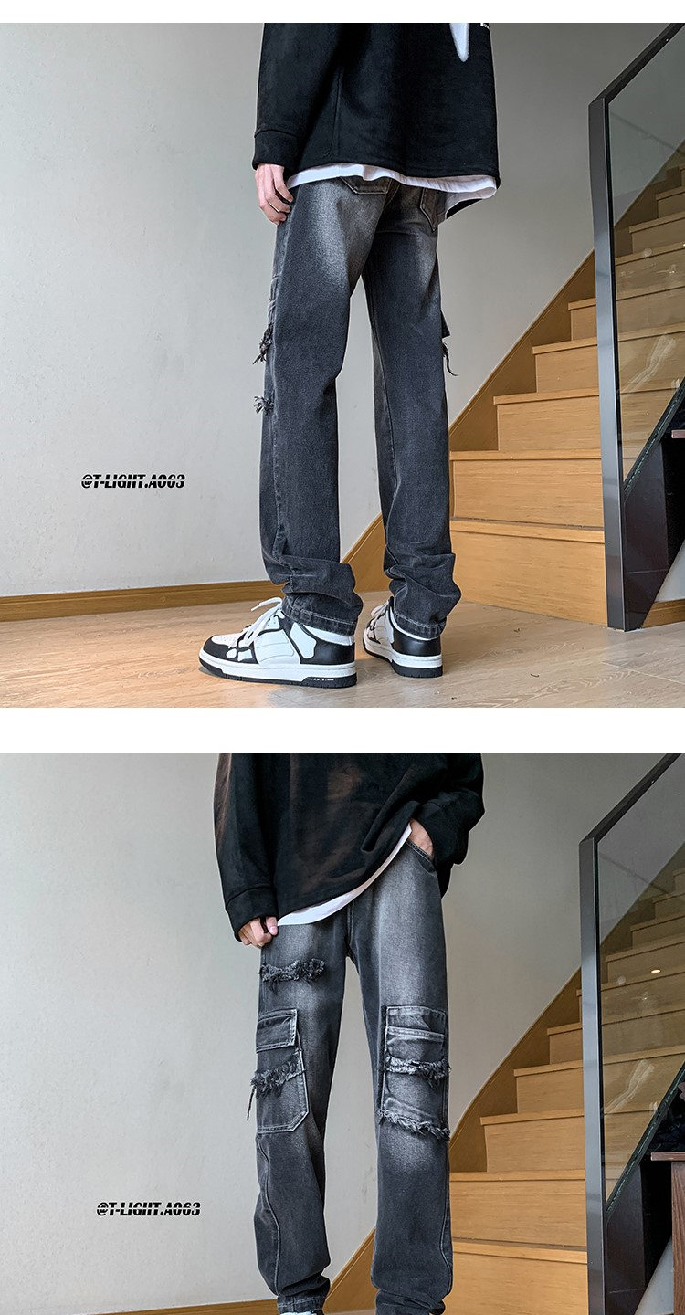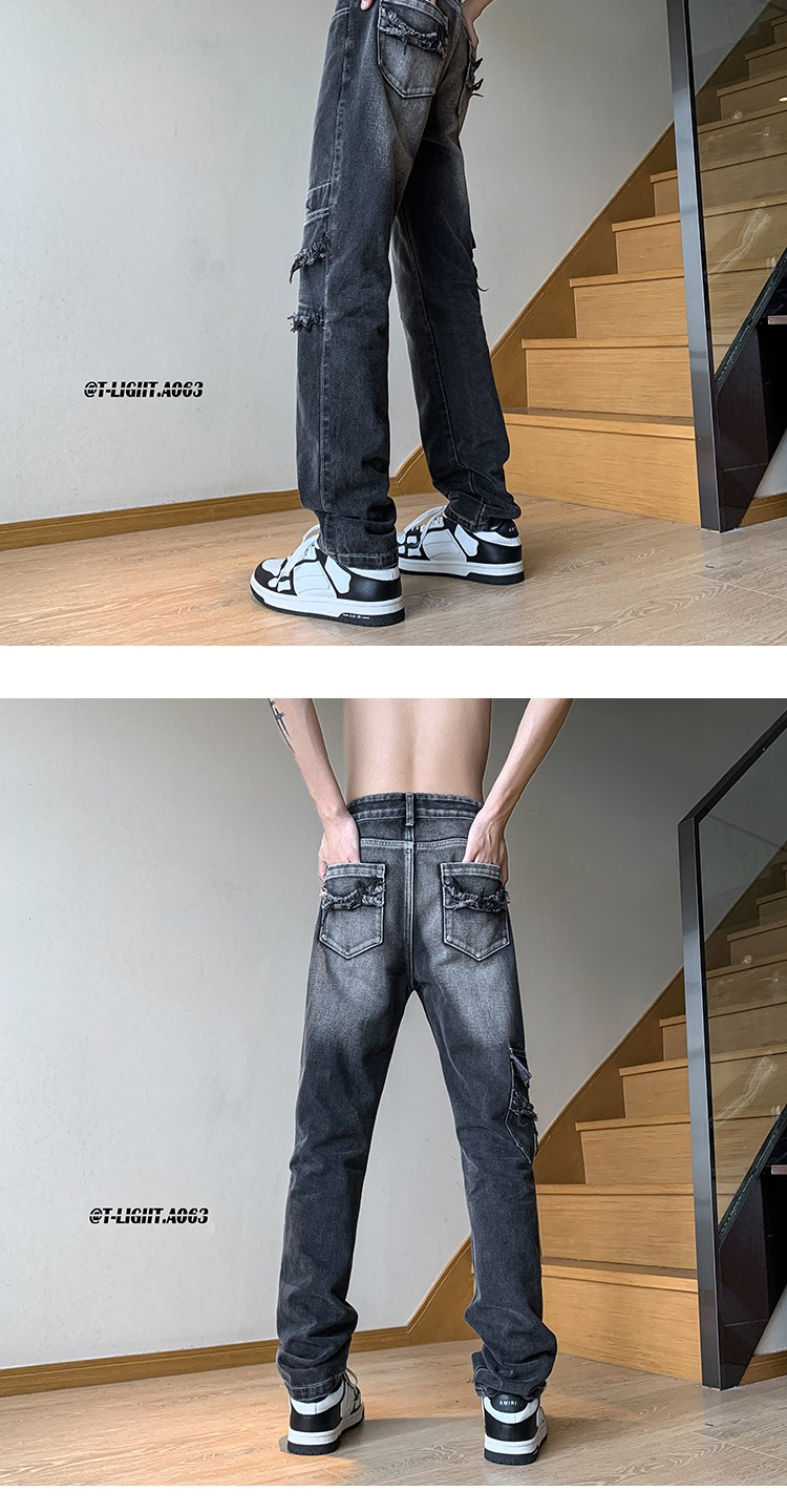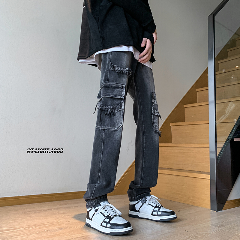 毛邊口袋工裝褲顯瘦小眾原創設計褲子高街美式vibe直筒褲潮男穿搭