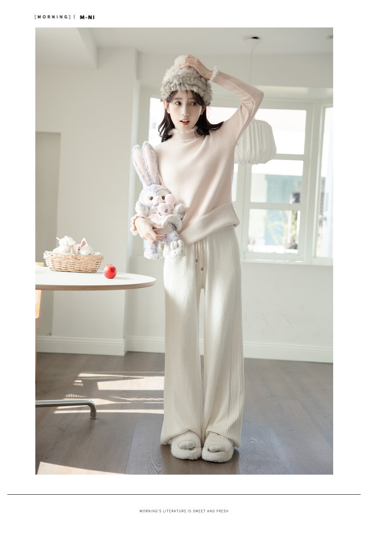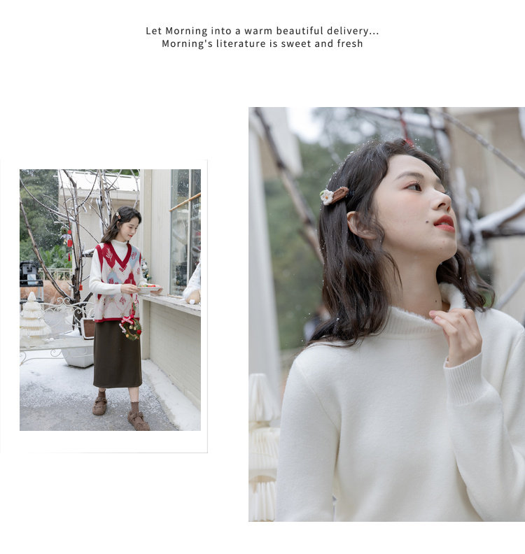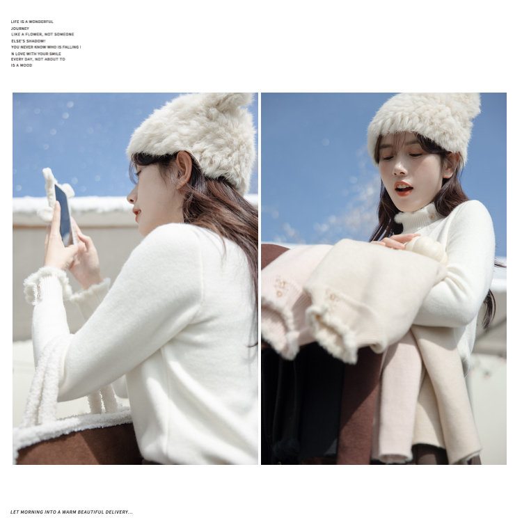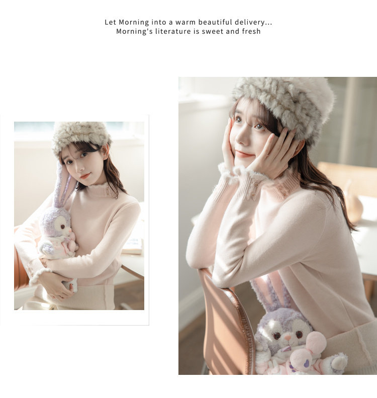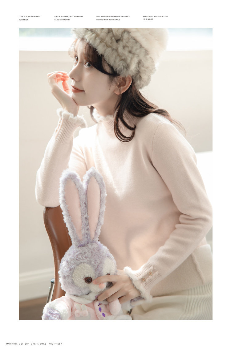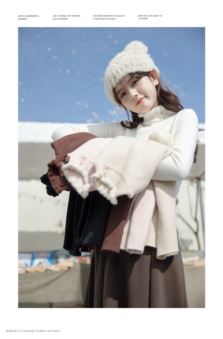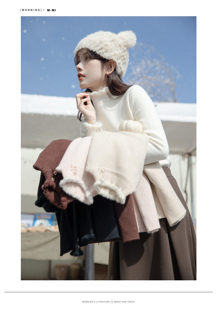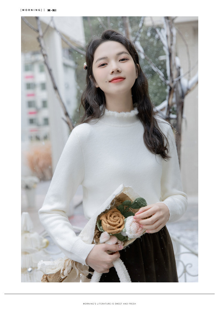 麼寧白色木耳邊加絨打底衫女秋冬2023新款半高領毛衣內搭針織上衣