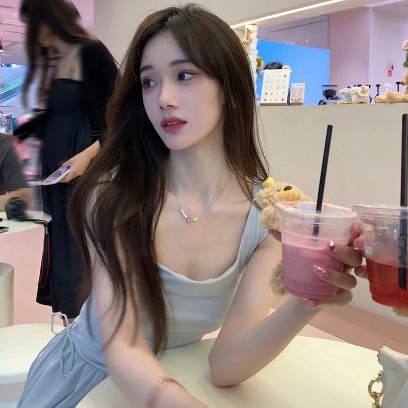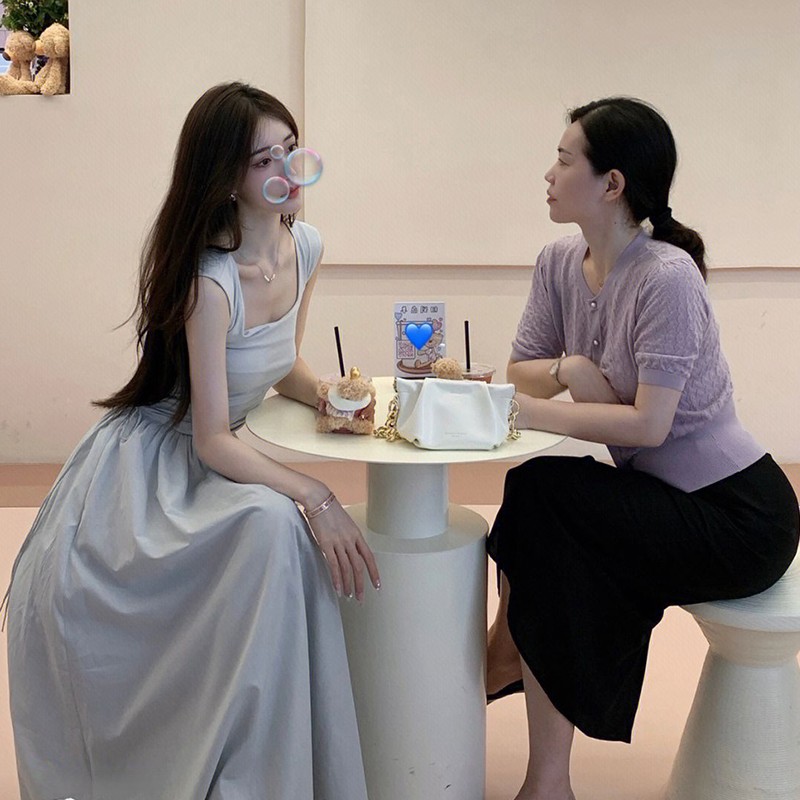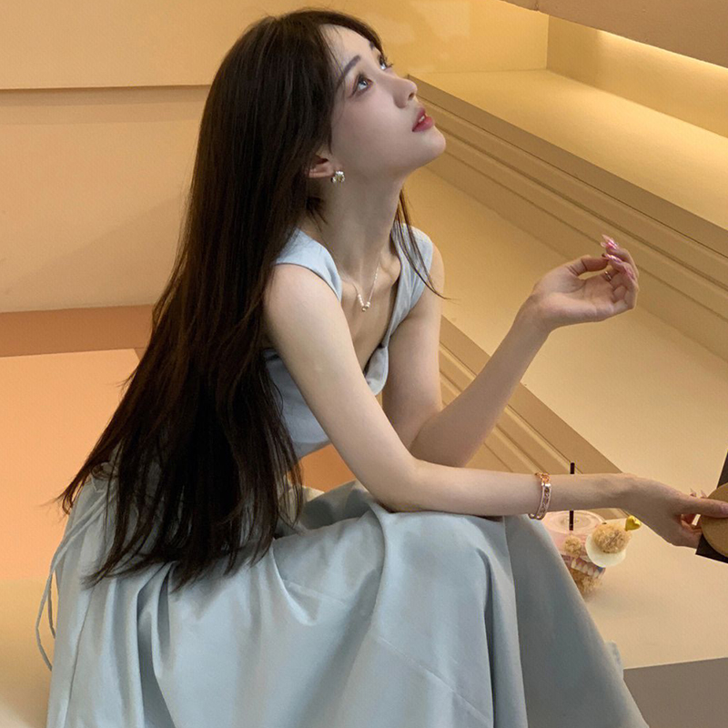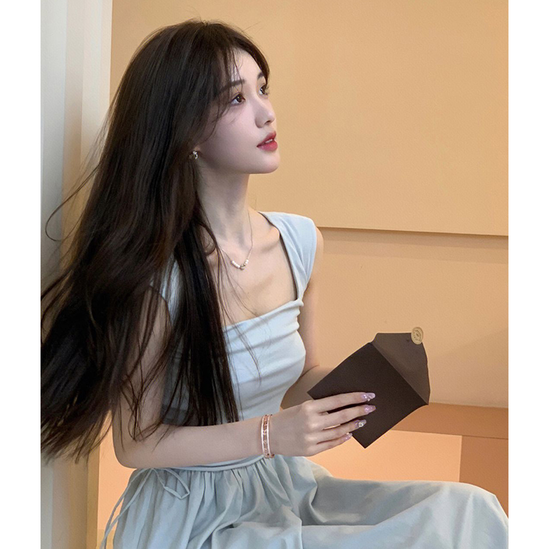 極簡風方領收腰洋裝女夏季新款高級感高腰顯瘦拼接針織長版裙子