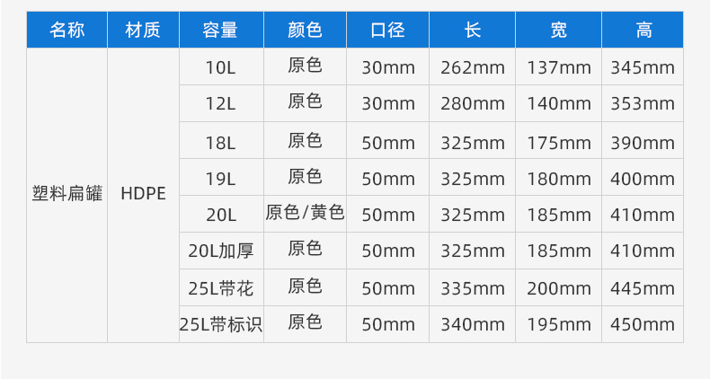 颜色 10L塑料扁罐,12L塑料扁罐,20L塑料扁罐 黄色,25L塑料扁罐 带花,20L扁罐原色 加厚,18L塑料扁罐,19L塑料扁罐,20L塑料扁罐 原色,25L扁罐 带容量标识