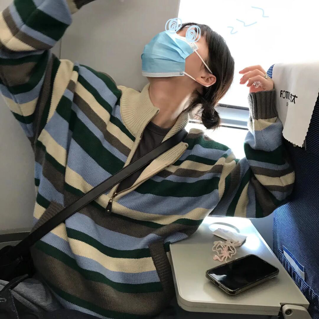 美式復古條紋拉鍊毛衣外套女秋冬學院風小眾設計感奶系針織衫上衣