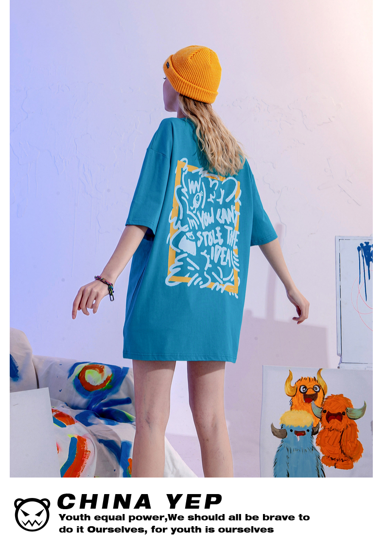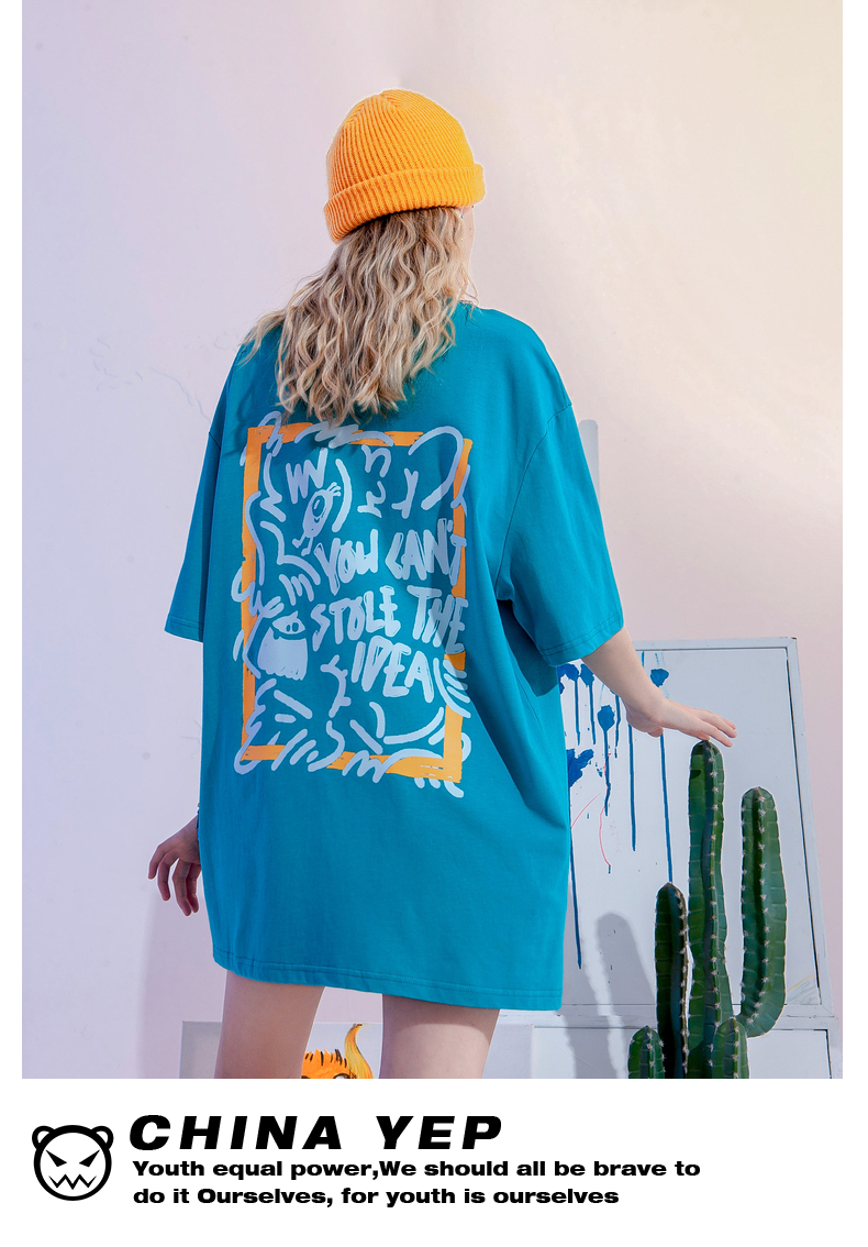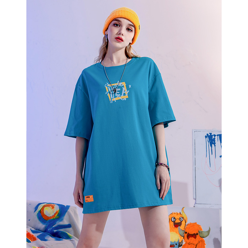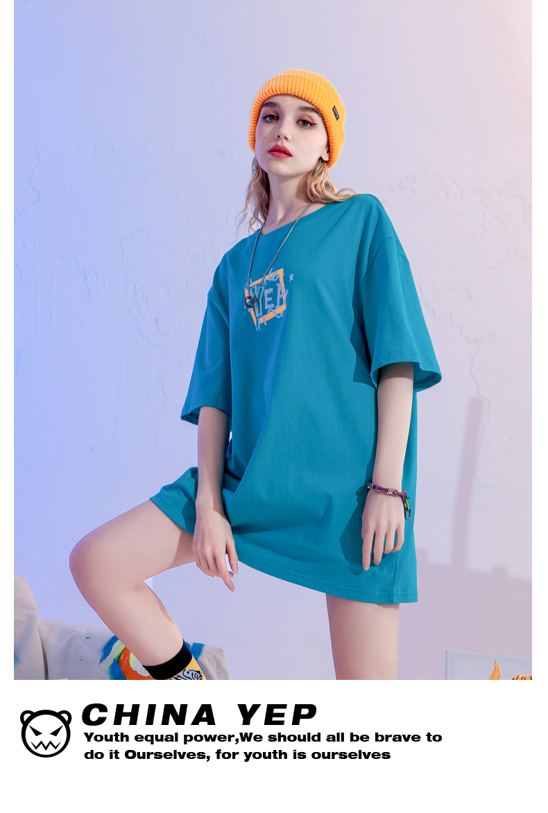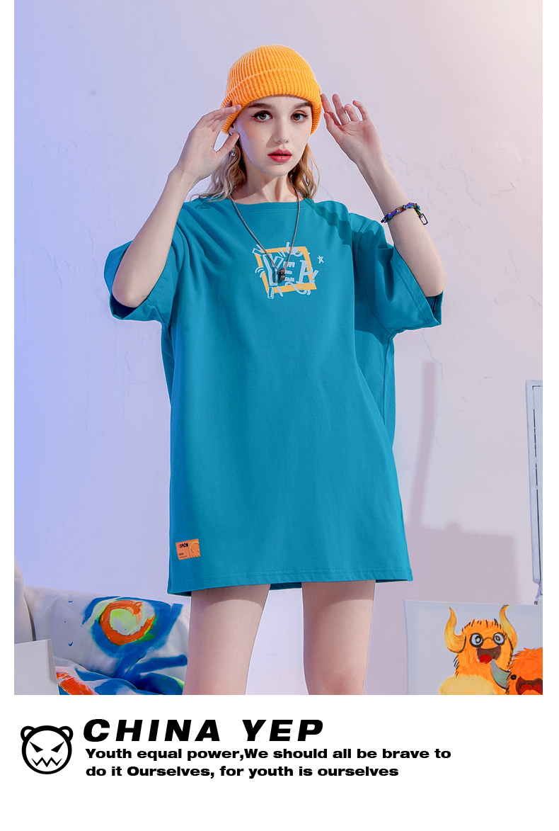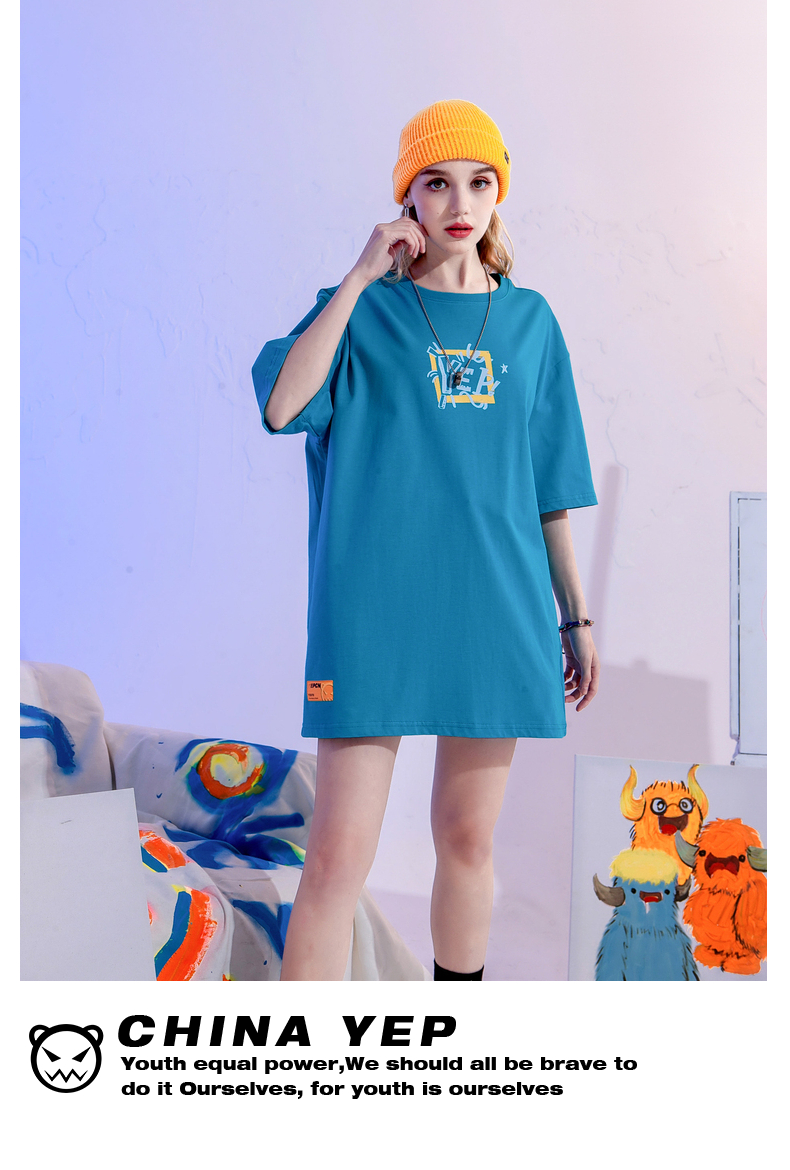 YEP潮牌湖藍色T恤女亮色短袖大版夏季寬鬆純棉內搭打底衫上衣T恤