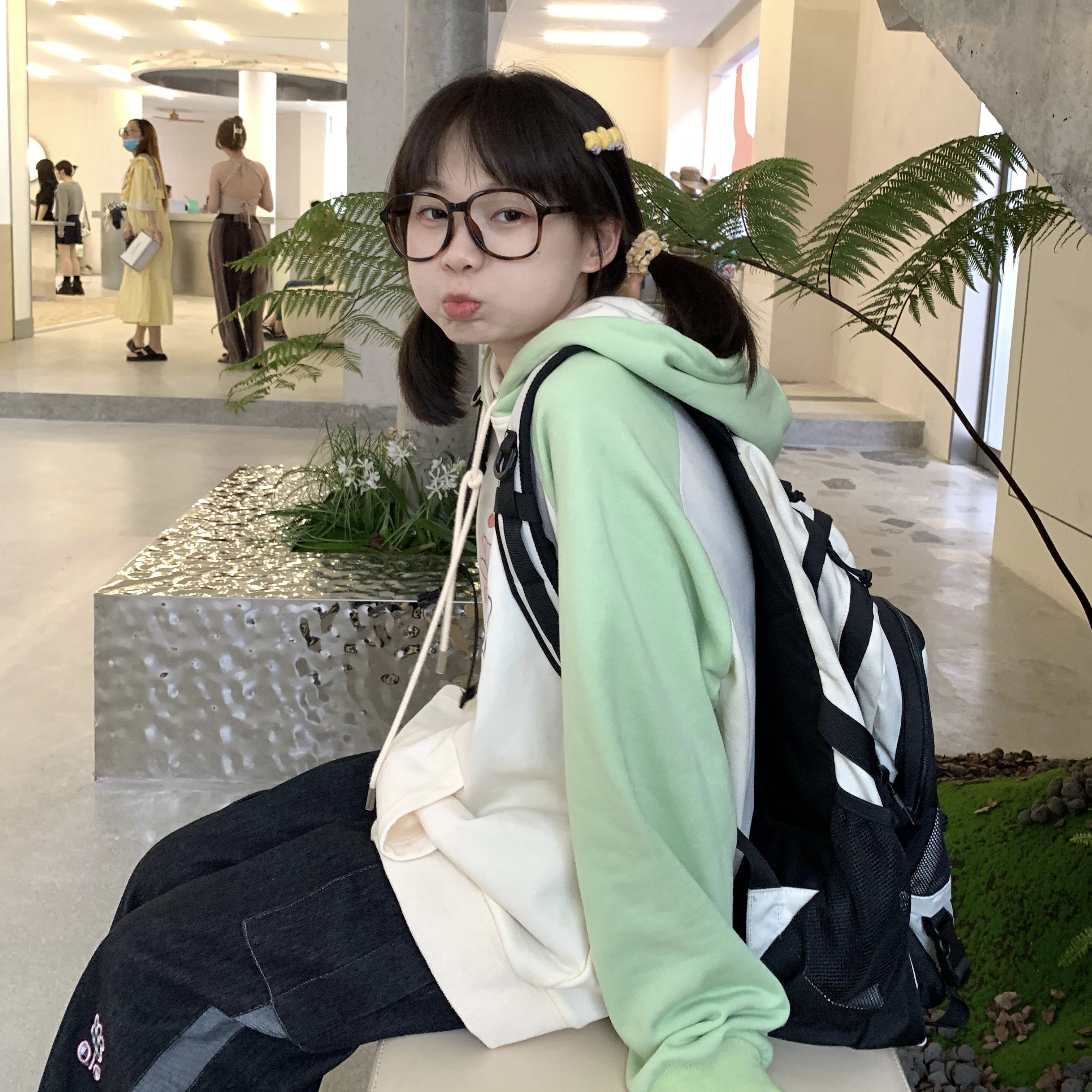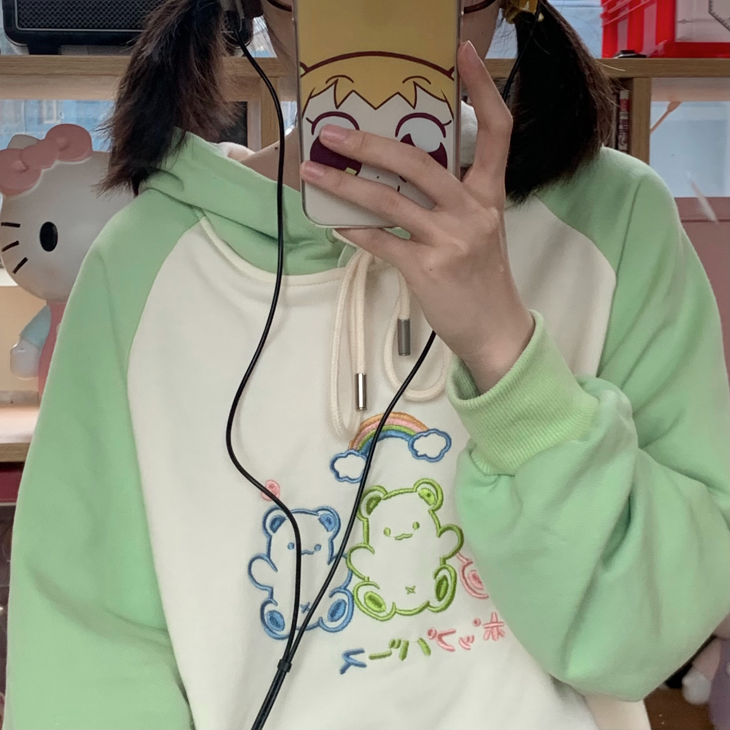 泡泡巴士popbus原創小熊軟糖刺繡連帽撞色厚棉T長袖少女日系寬鬆