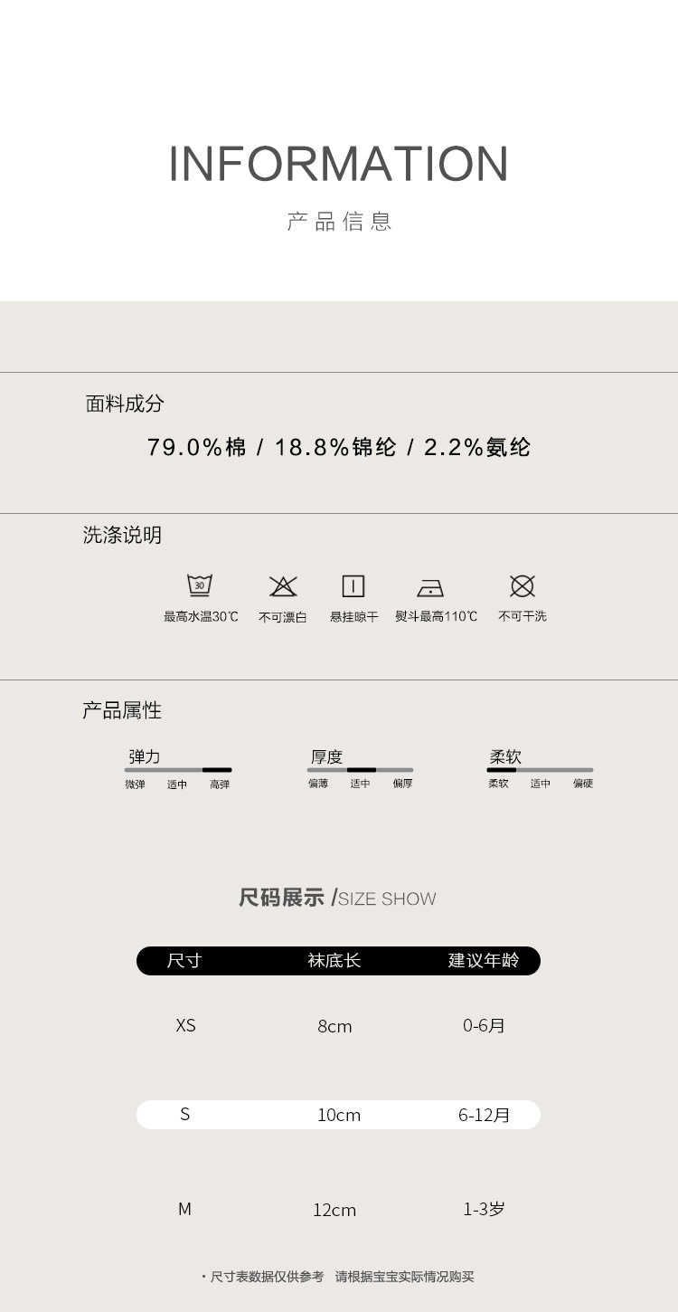童袜尺码 XS码0-6个月,S码6-12个月,M码1-3岁