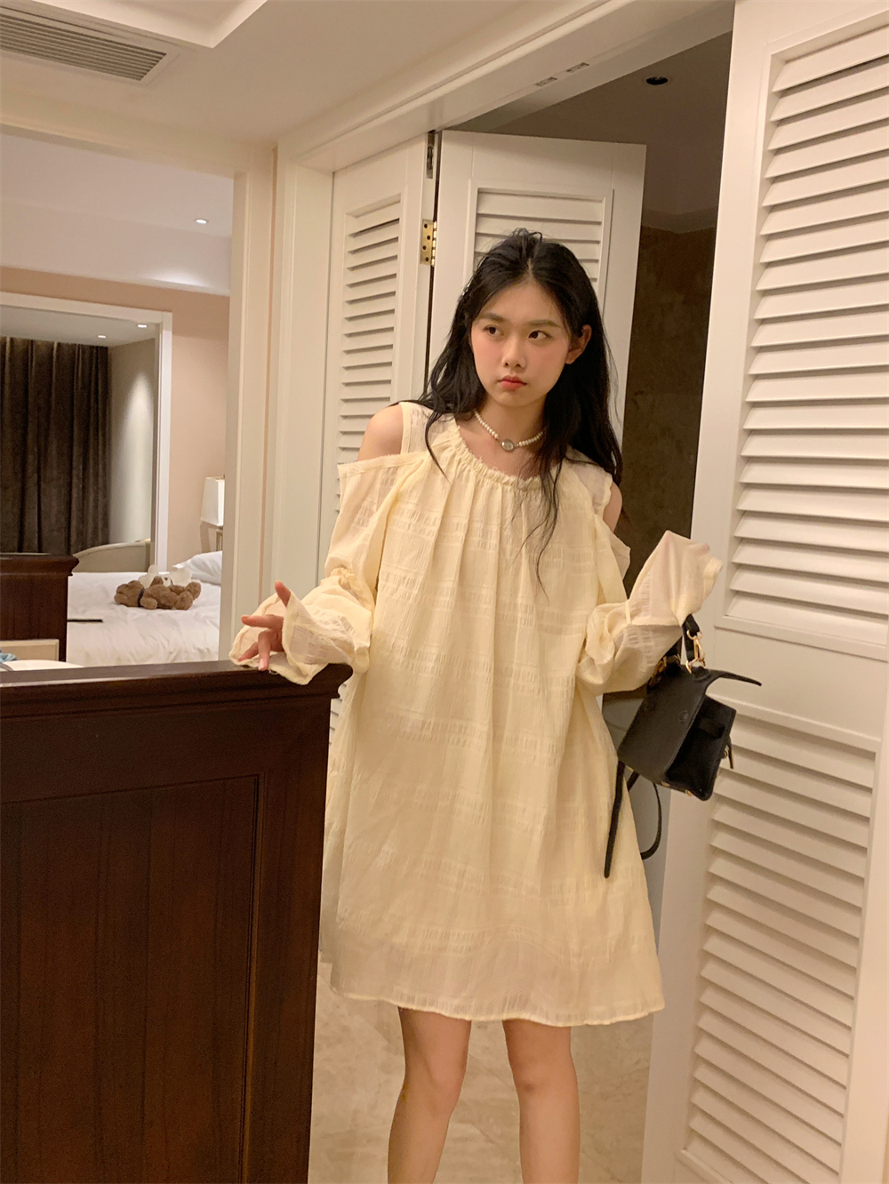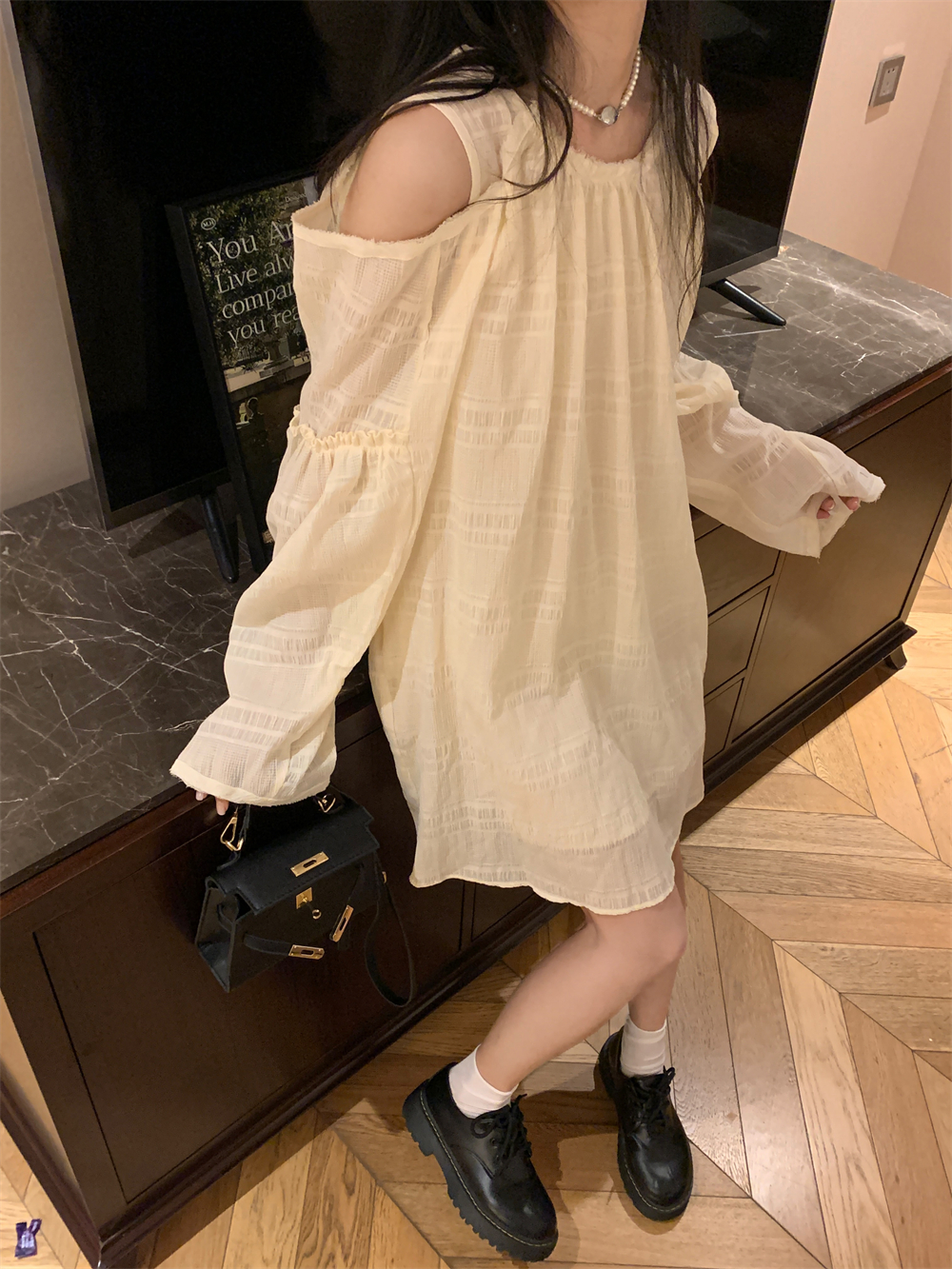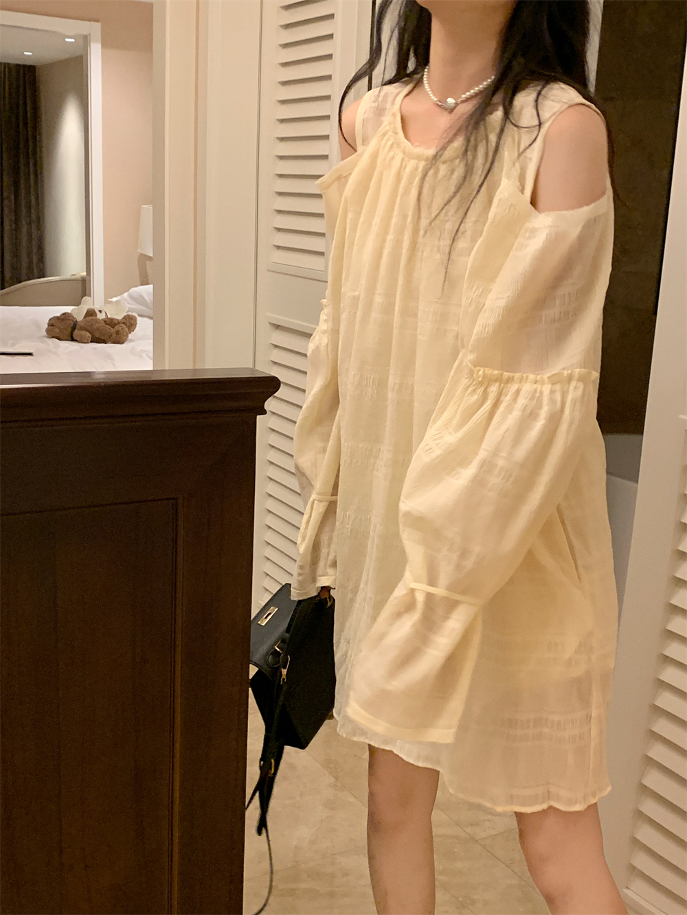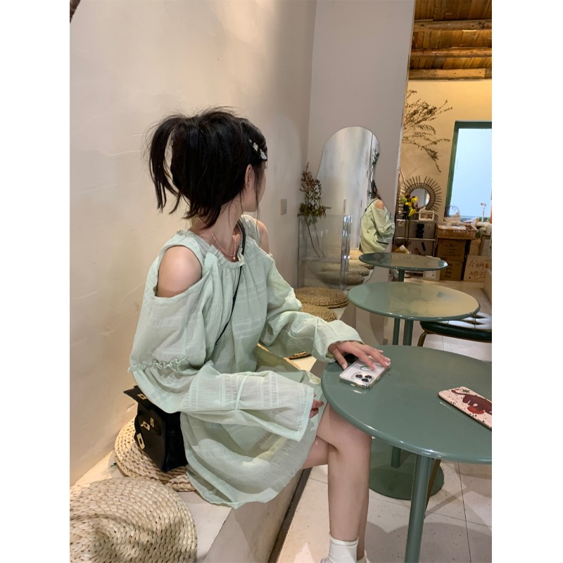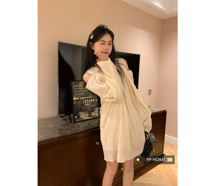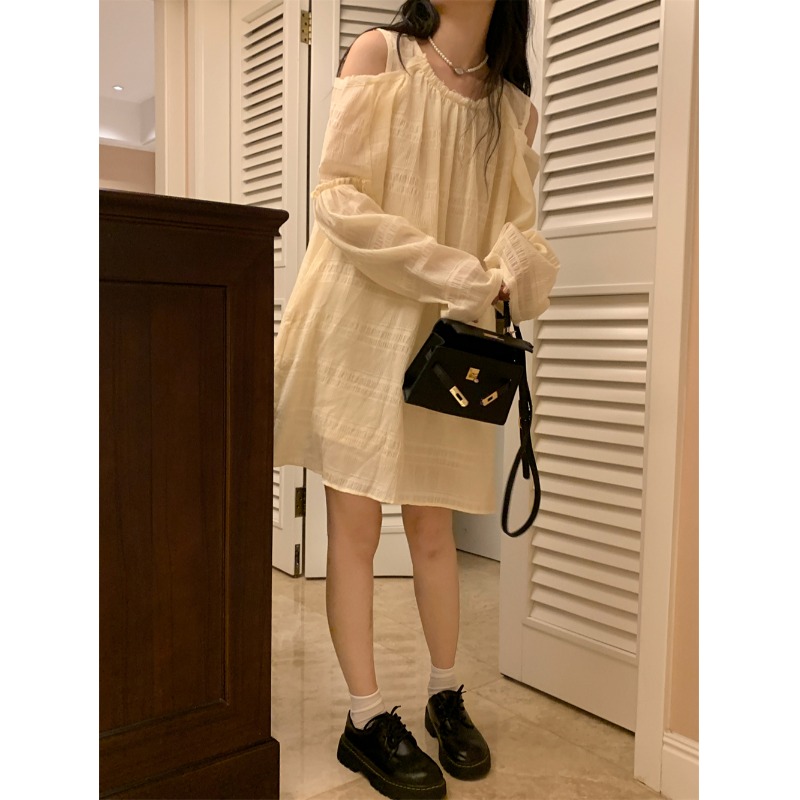 PPHOME乖甜達令~兩色茶歇甜美風洋裝設計感防曬長袖露肩短裙女