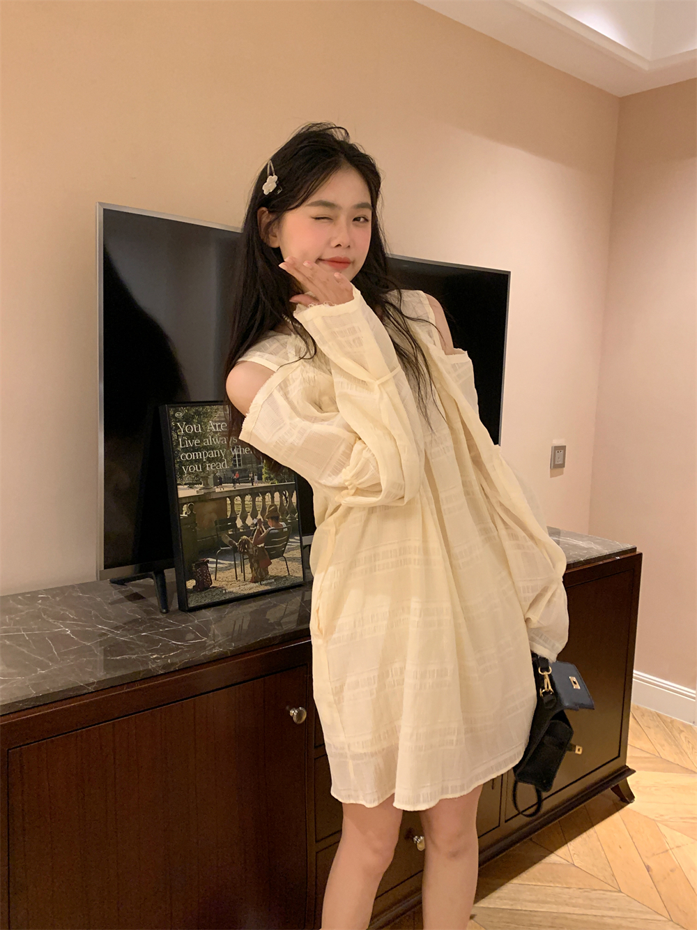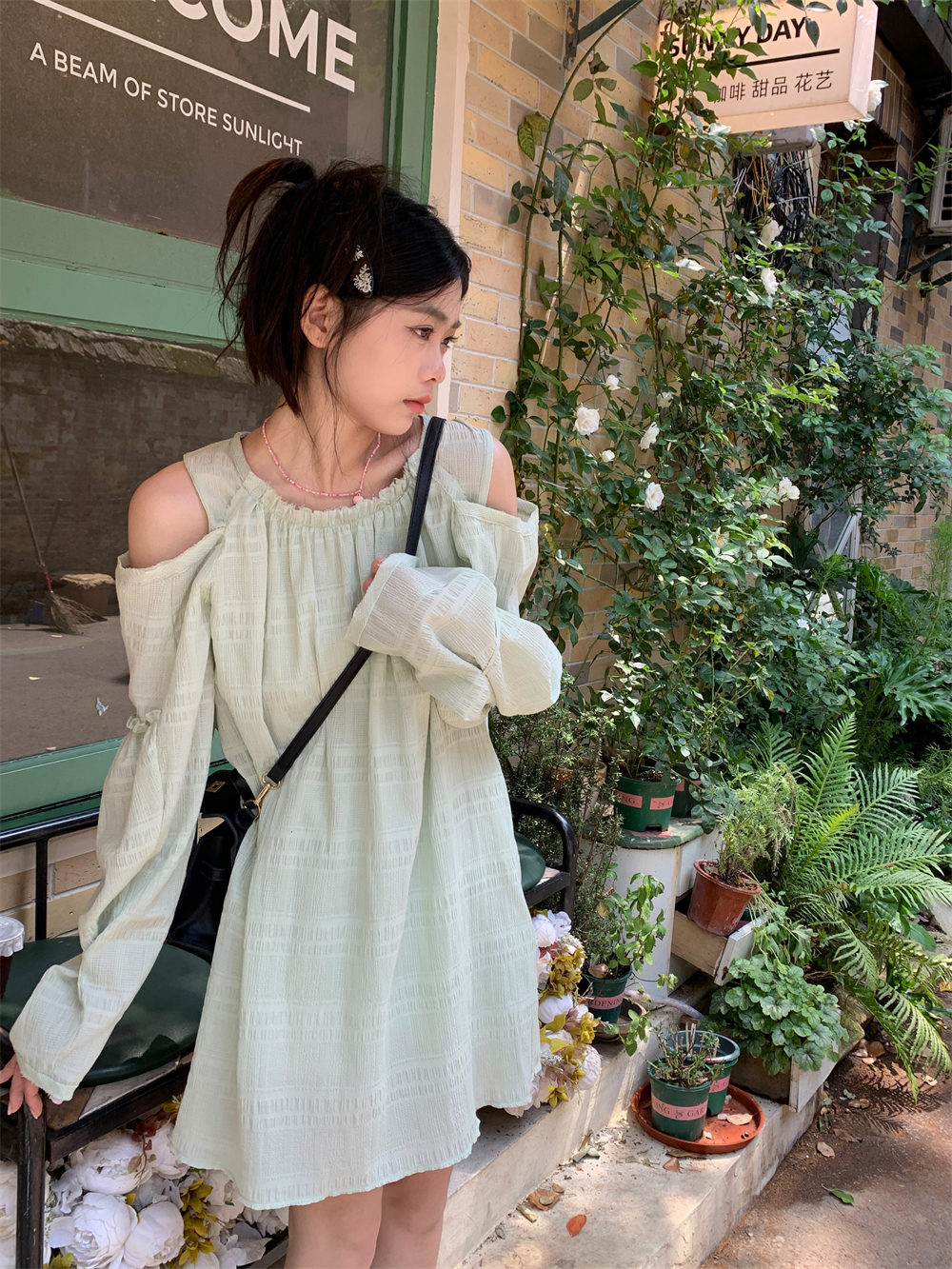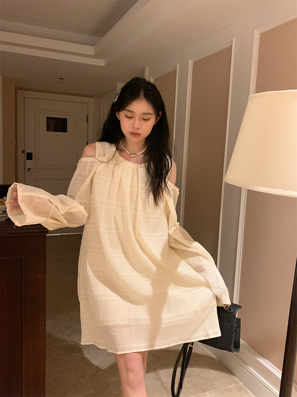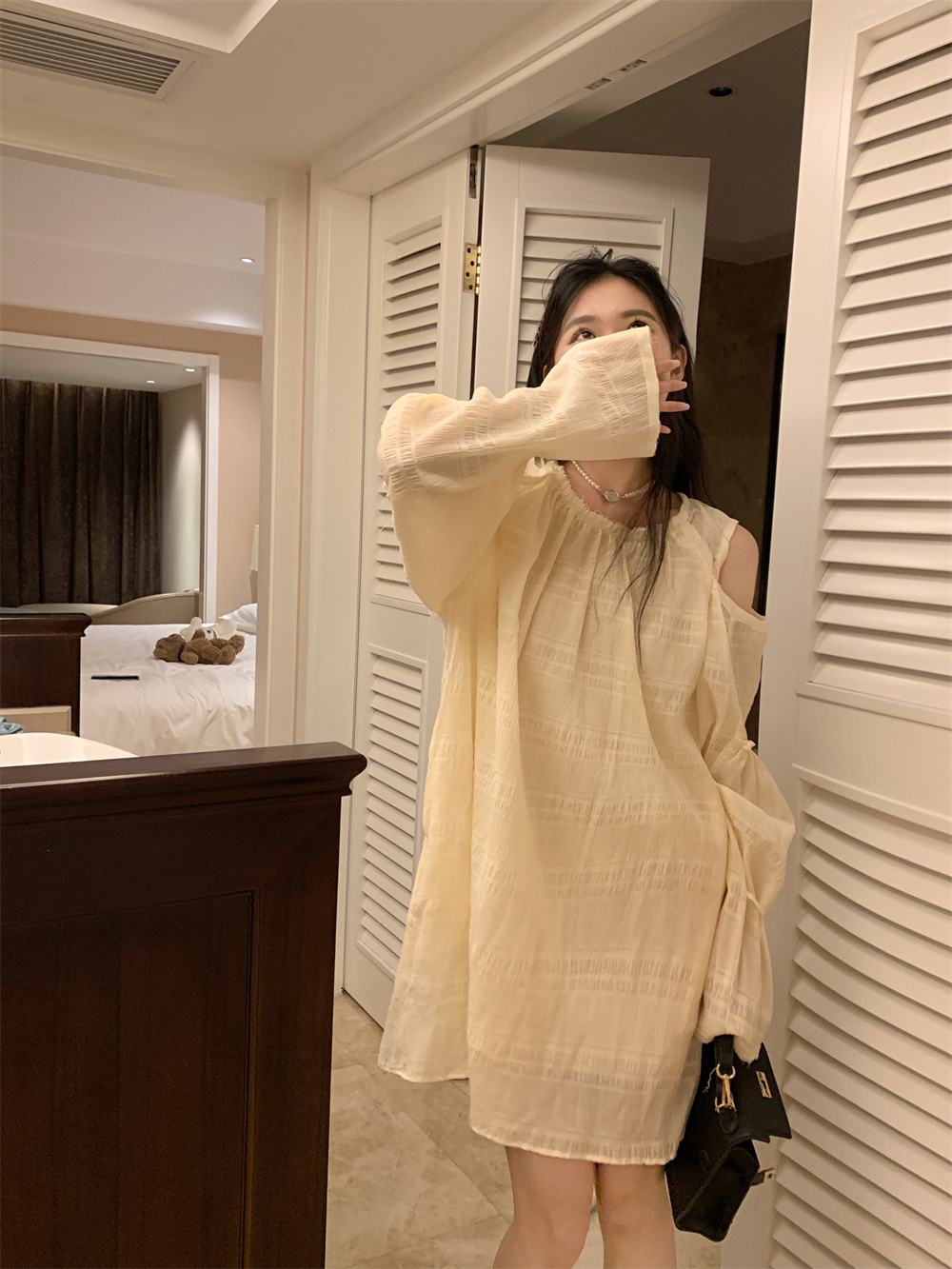 PPHOME乖甜達令~兩色茶歇甜美風洋裝設計感防曬長袖露肩短裙女
