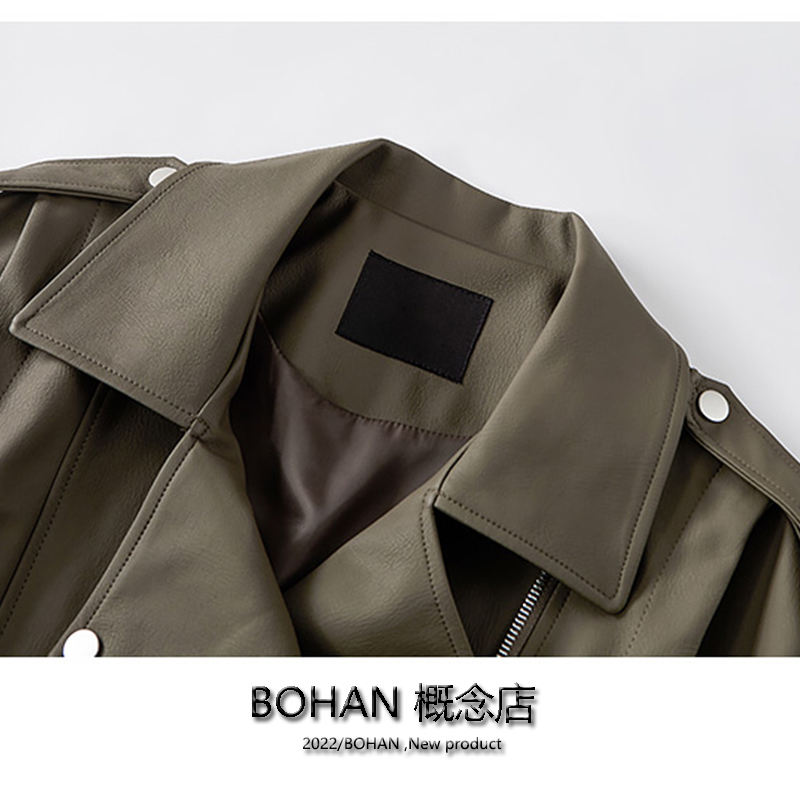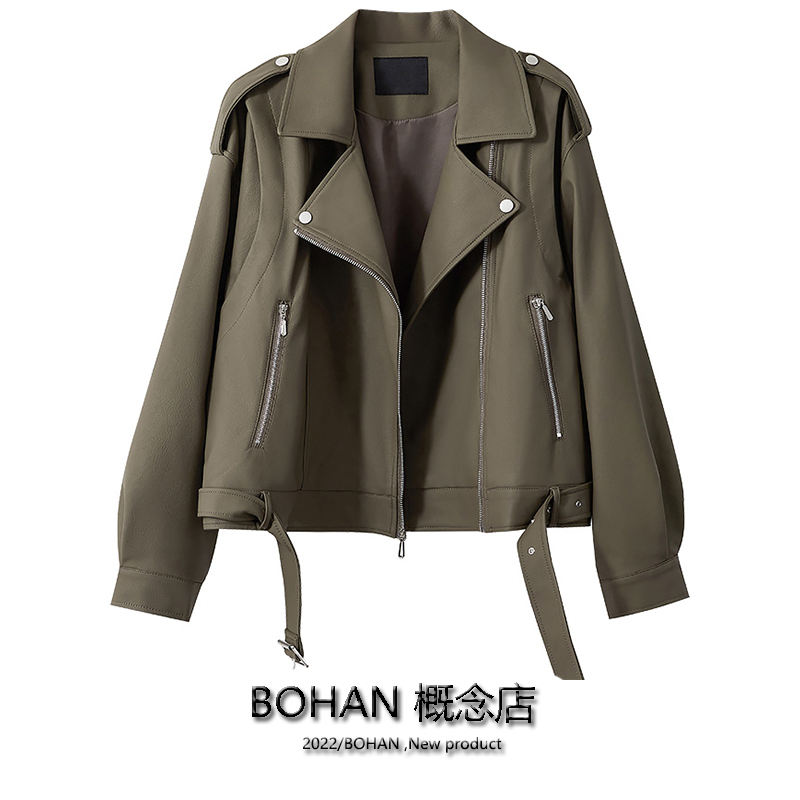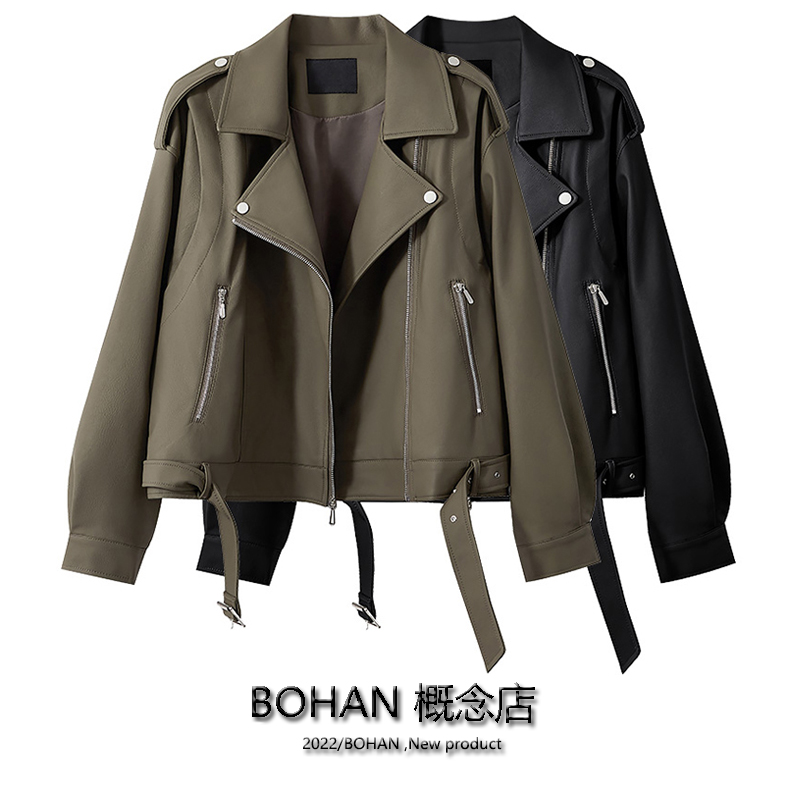 清倉品牌折扣黑色機車服高腰寬鬆顯瘦翻領pu皮夾克休閒外套上衣女