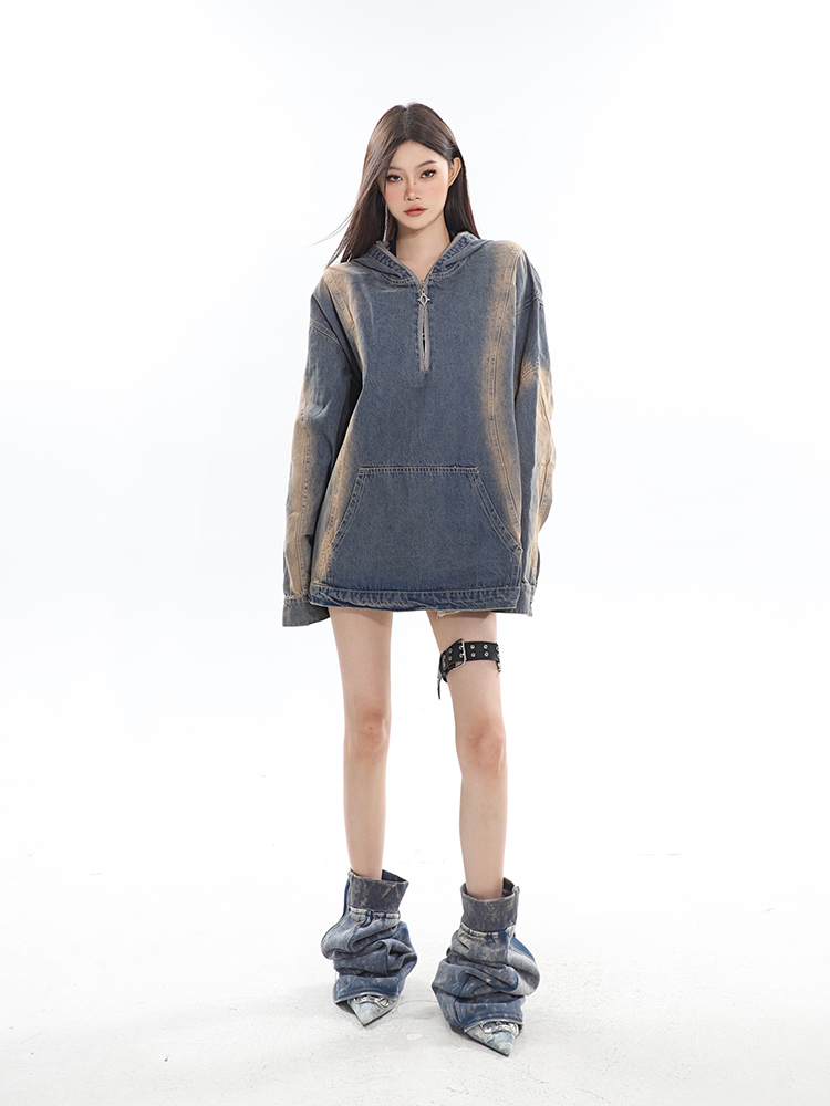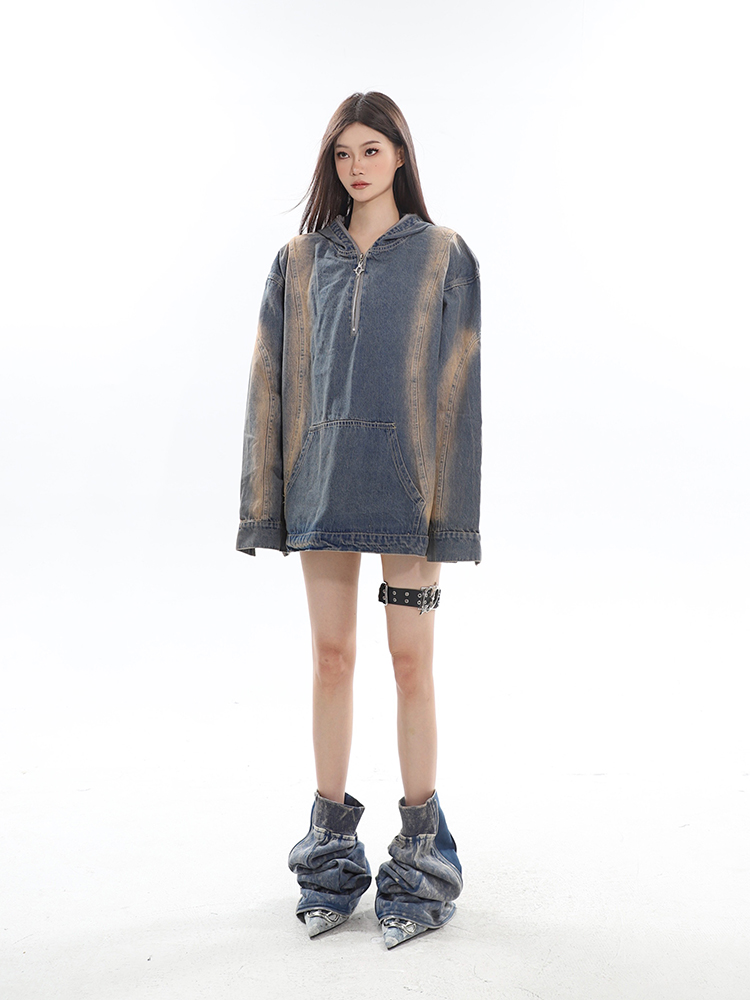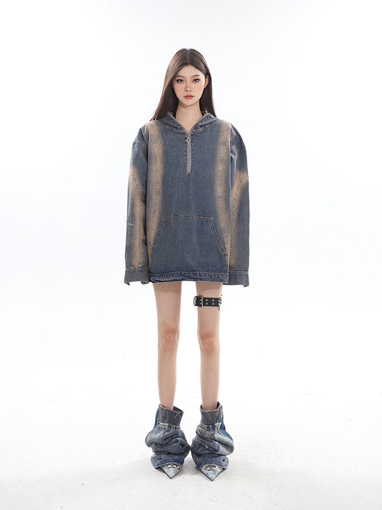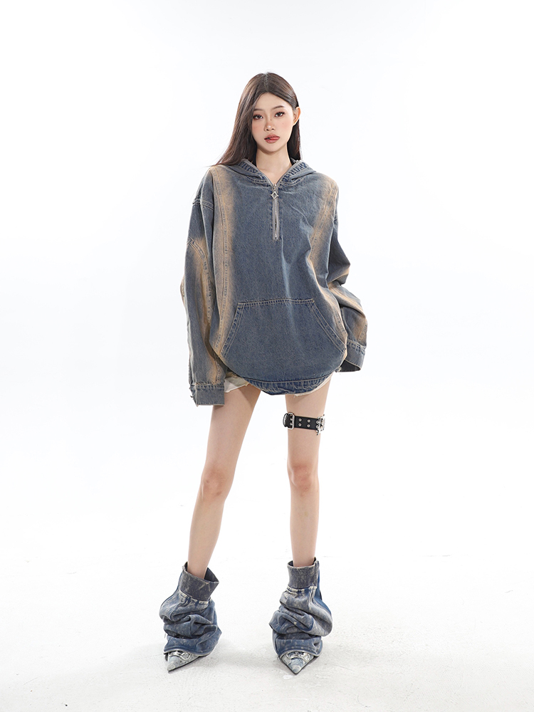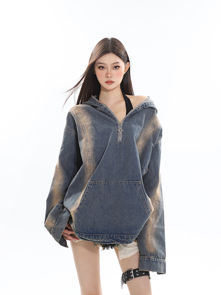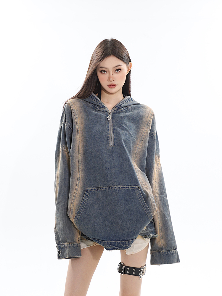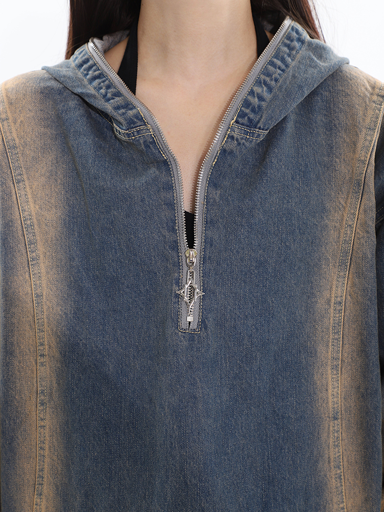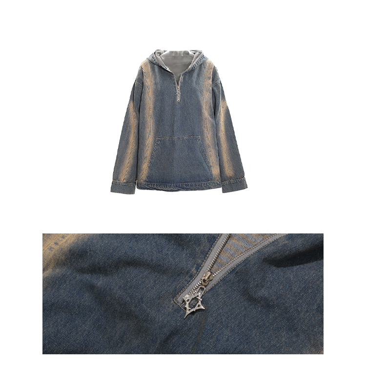 CCUP SAPCE 2023秋冬美式復古水洗牛仔帽衫做舊設計上衣連帽運動衫