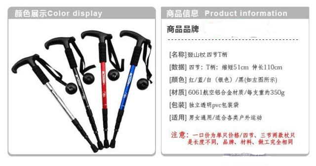 本款产品由铝合金管、橡胶脚套制成,可折叠缩放,外出旅游极为方便,做工精致、美观且结实耐用!