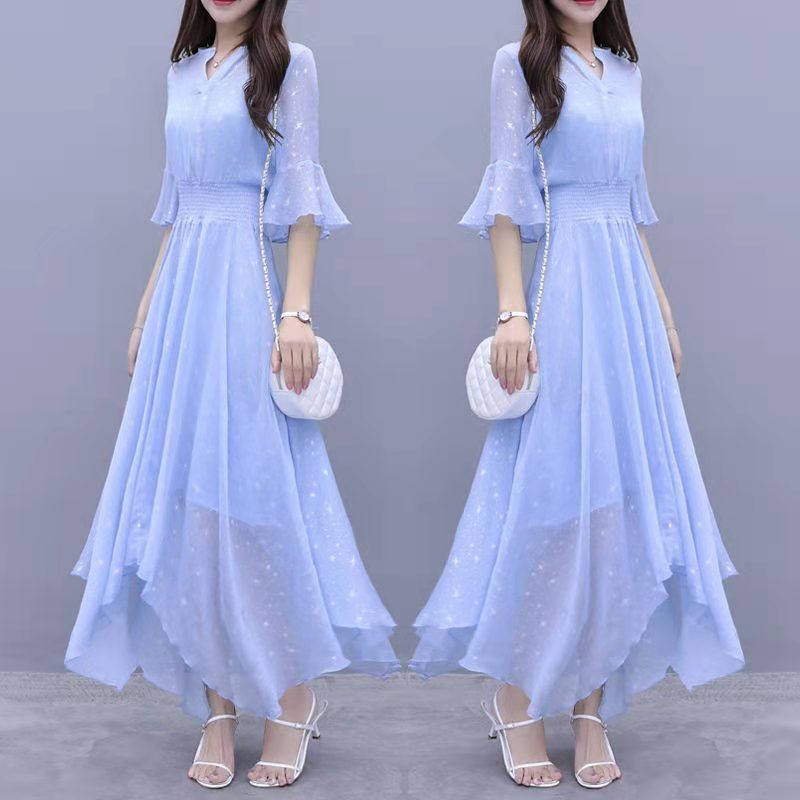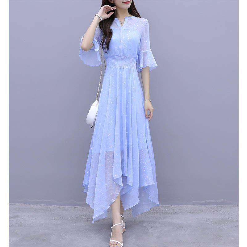 雪纺碎花连衣裙2023新款夏季女士裙子超仙不规则裙摆过膝长裙女夏