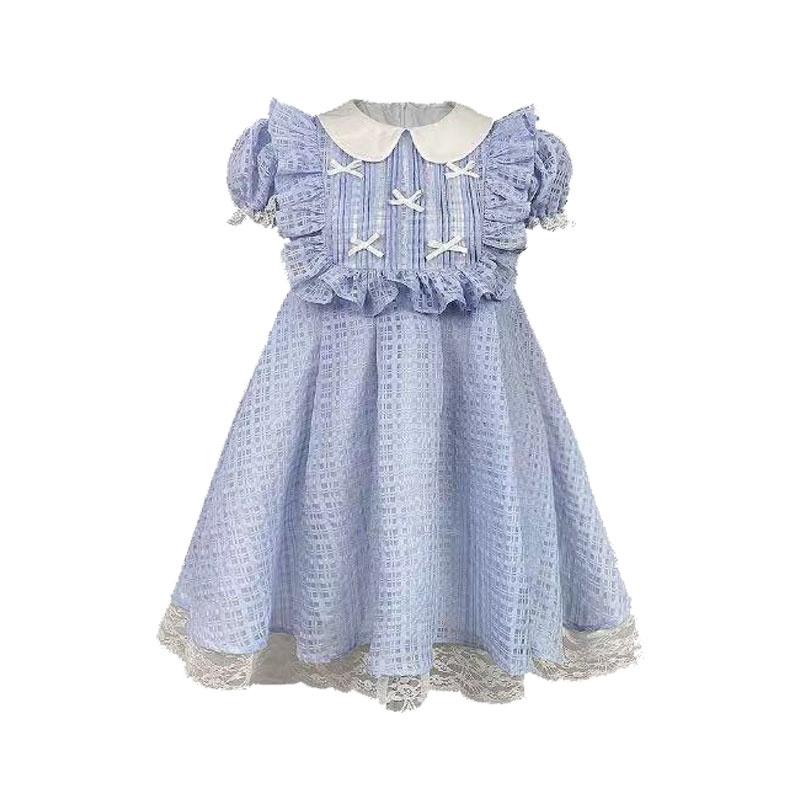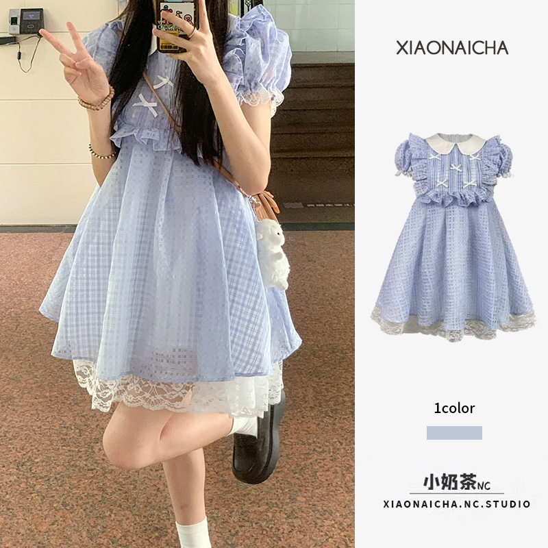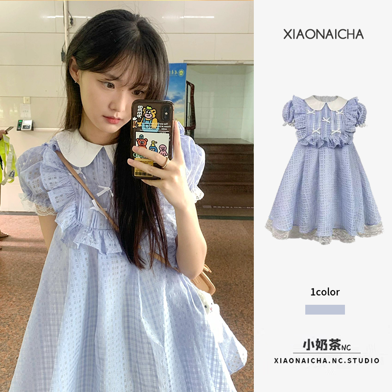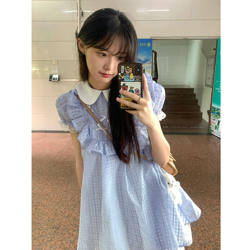 夏季法式藍色格紋蕾絲邊娃娃領洋裝女小個子甜美可愛公主蓬蓬裙