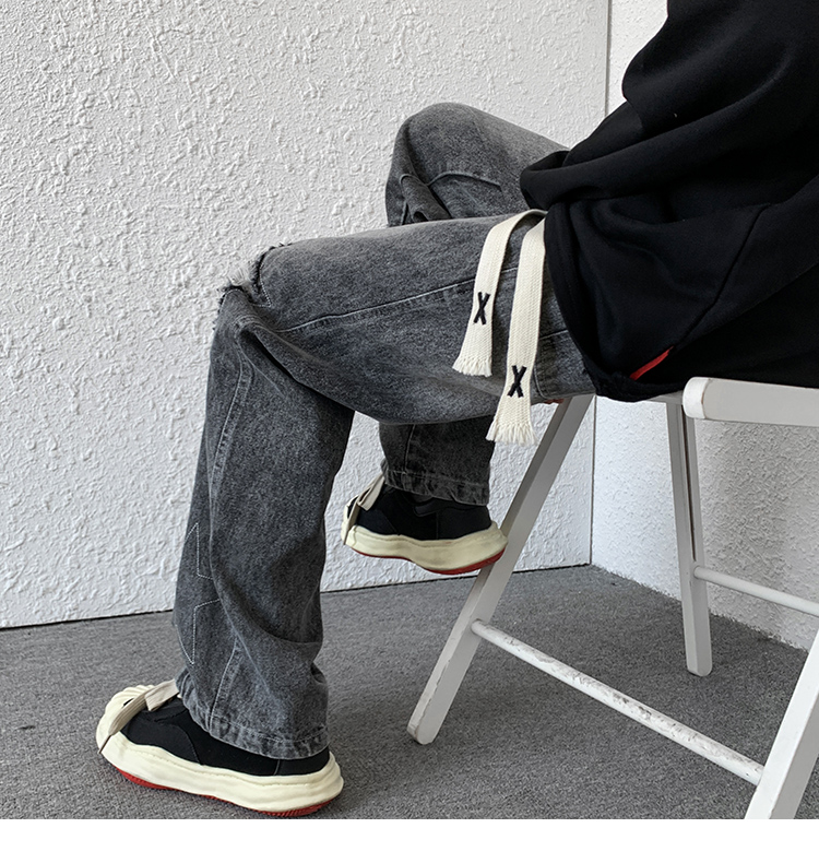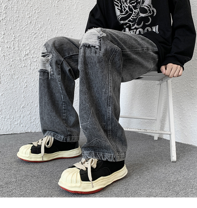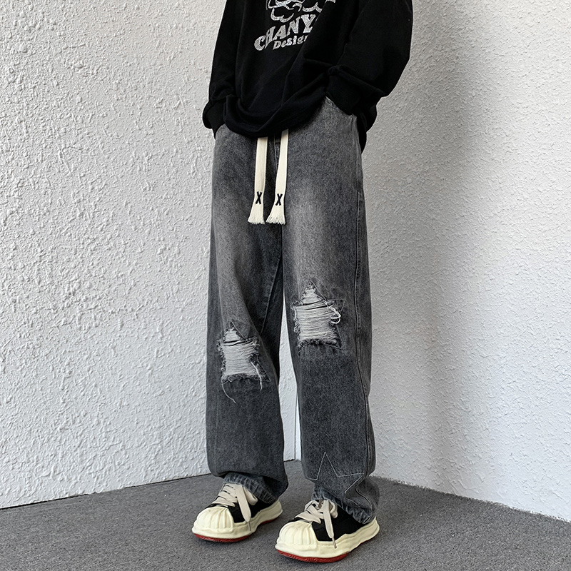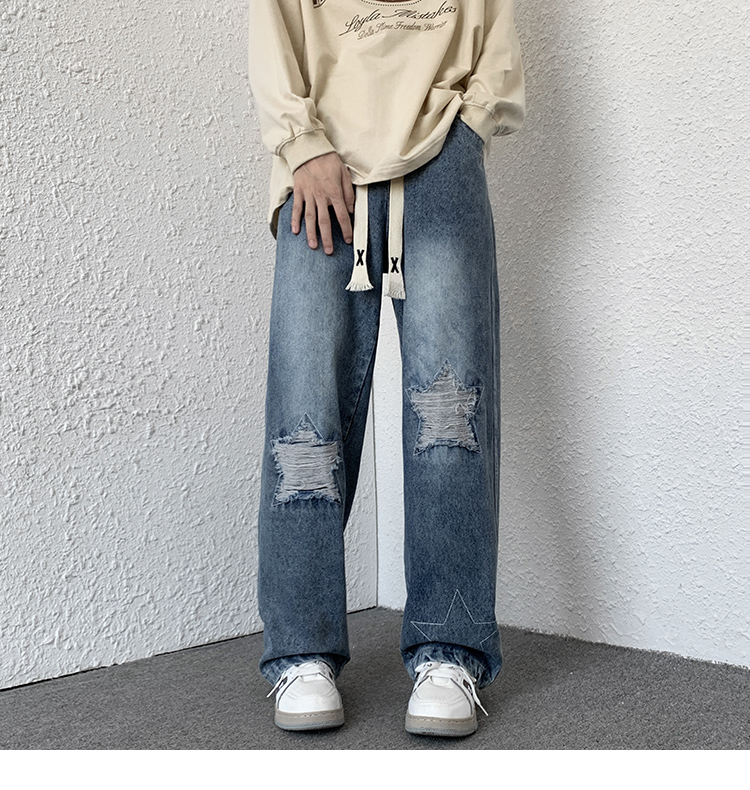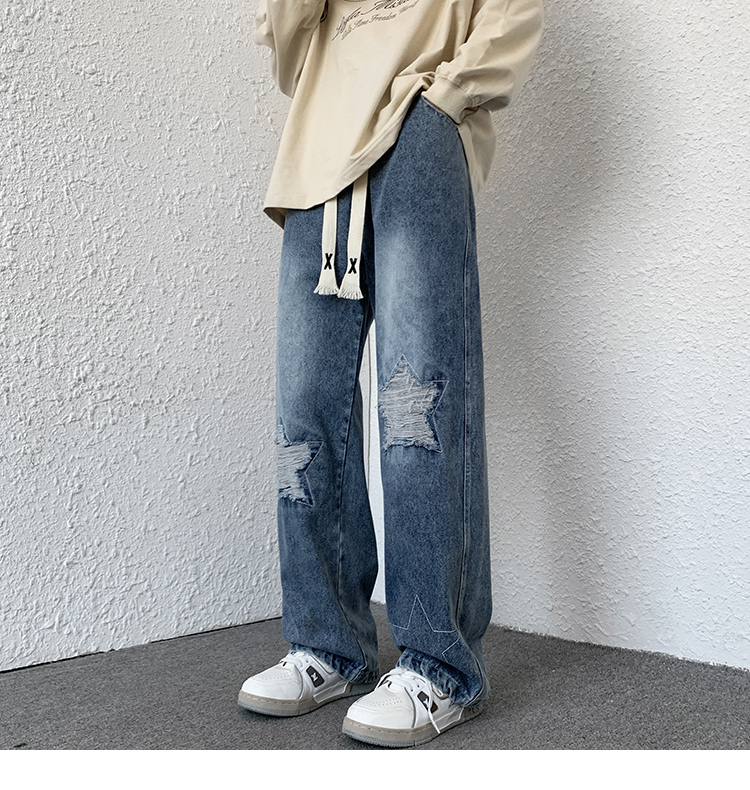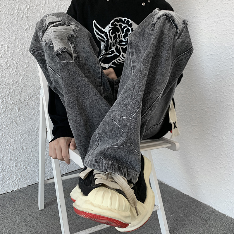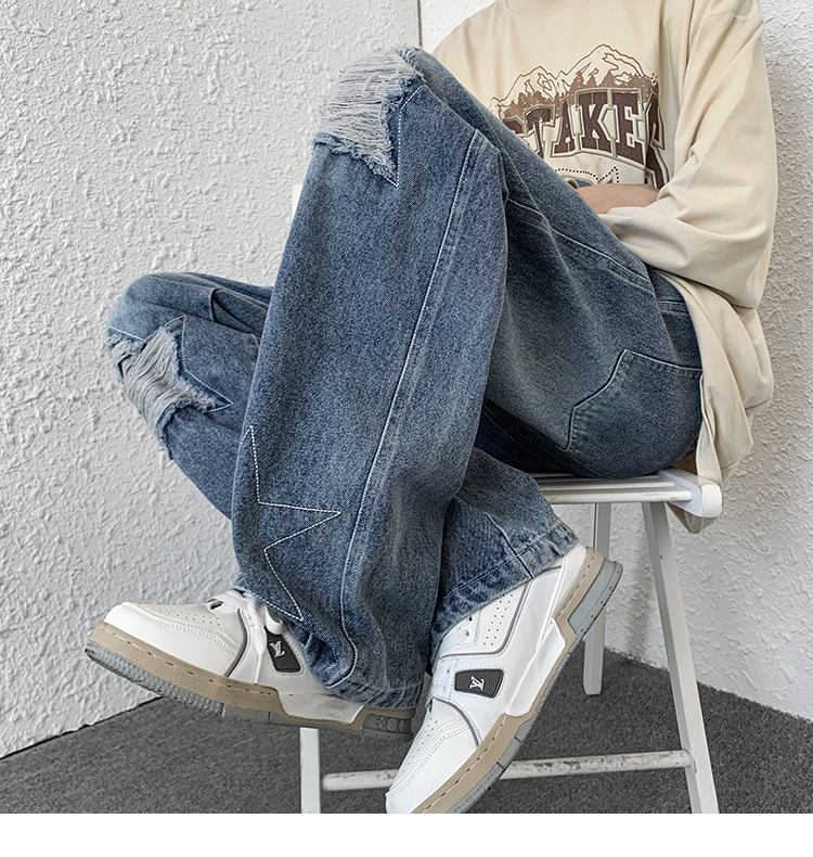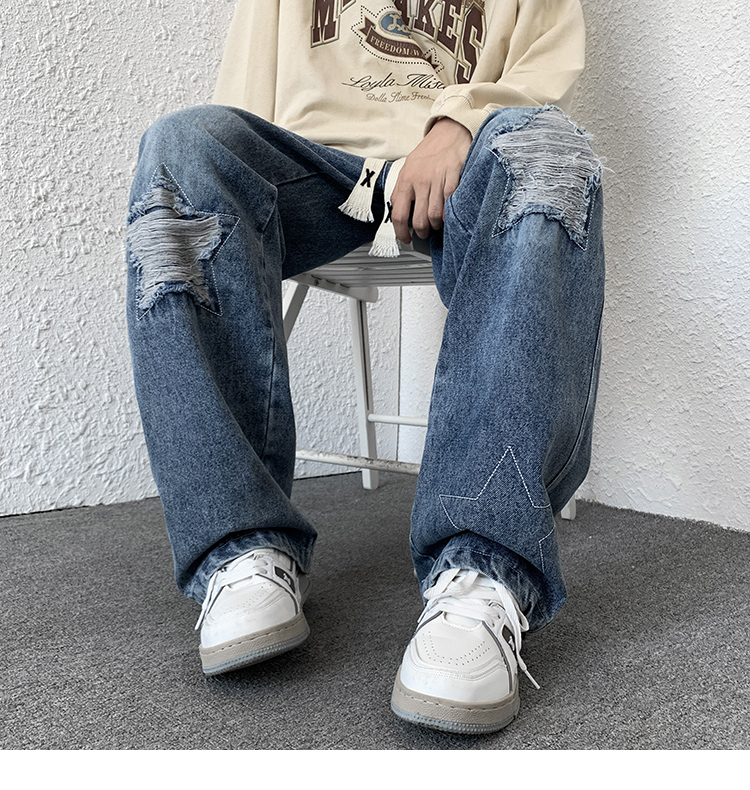 歐美hiphop褲子ins高街潮古著vintage牛仔褲五角星破洞刺繡闊腿褲