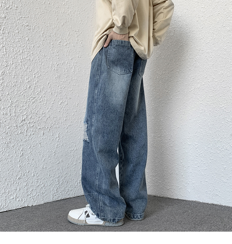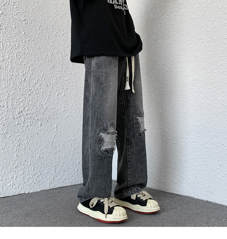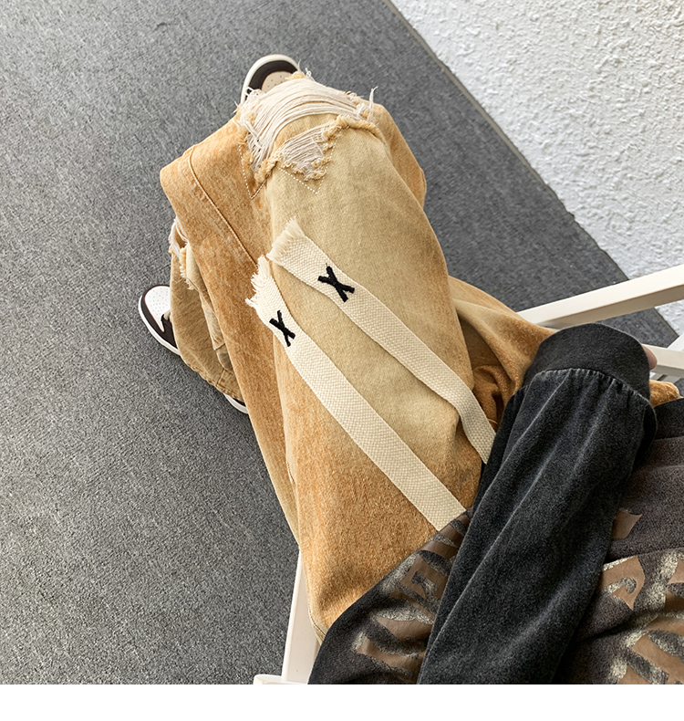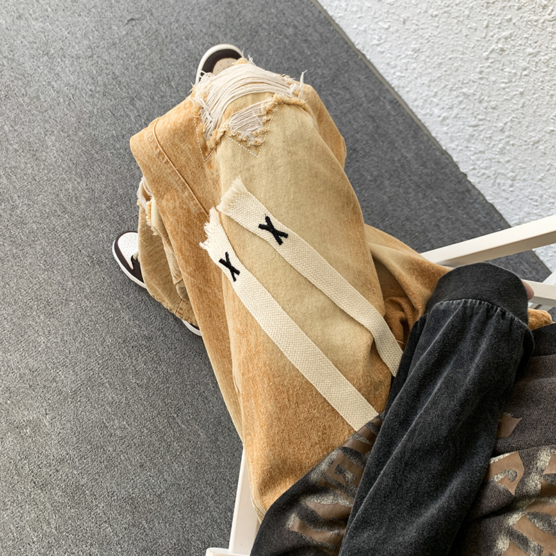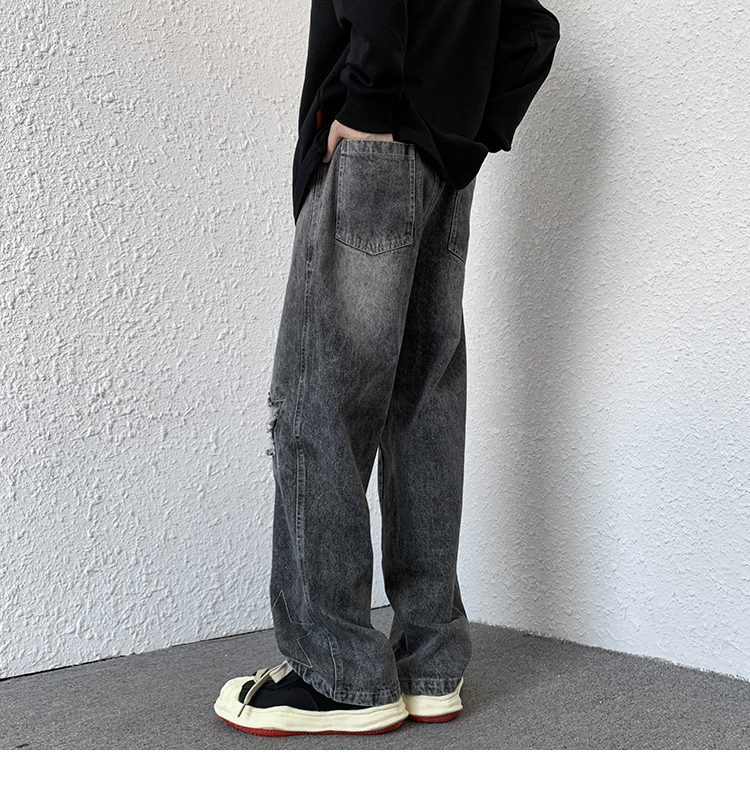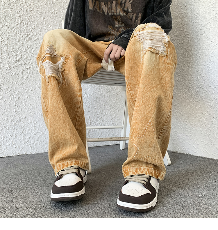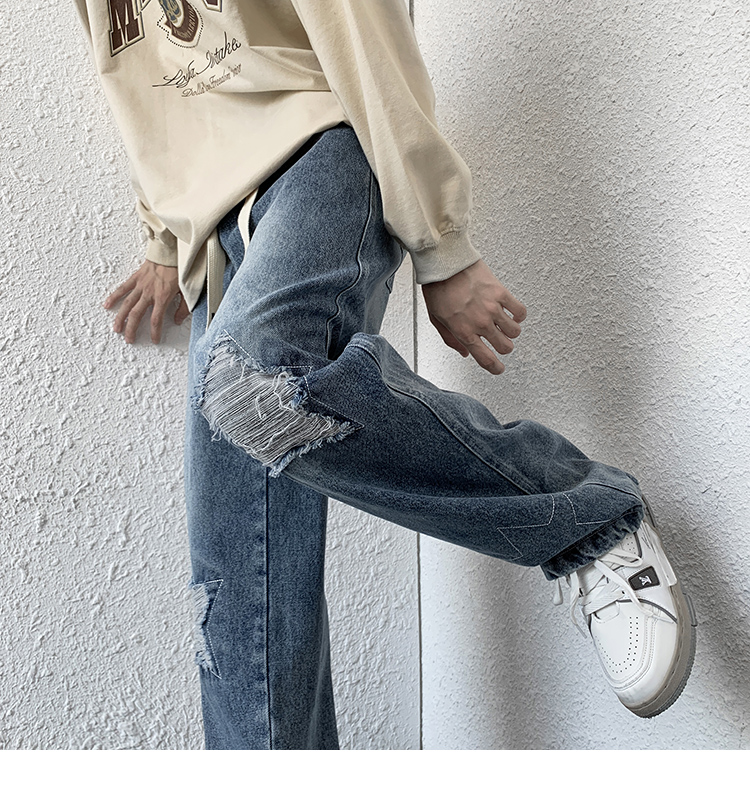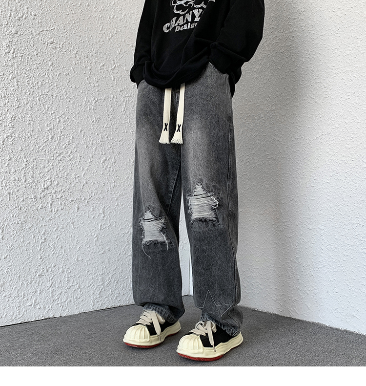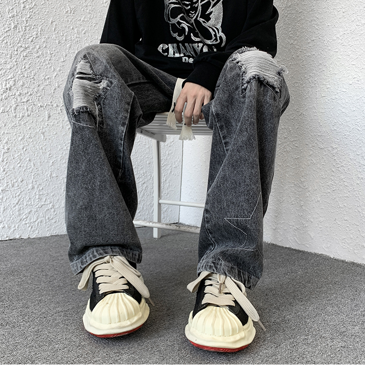 歐美hiphop褲子ins高街潮古著vintage牛仔褲五角星破洞刺繡闊腿褲